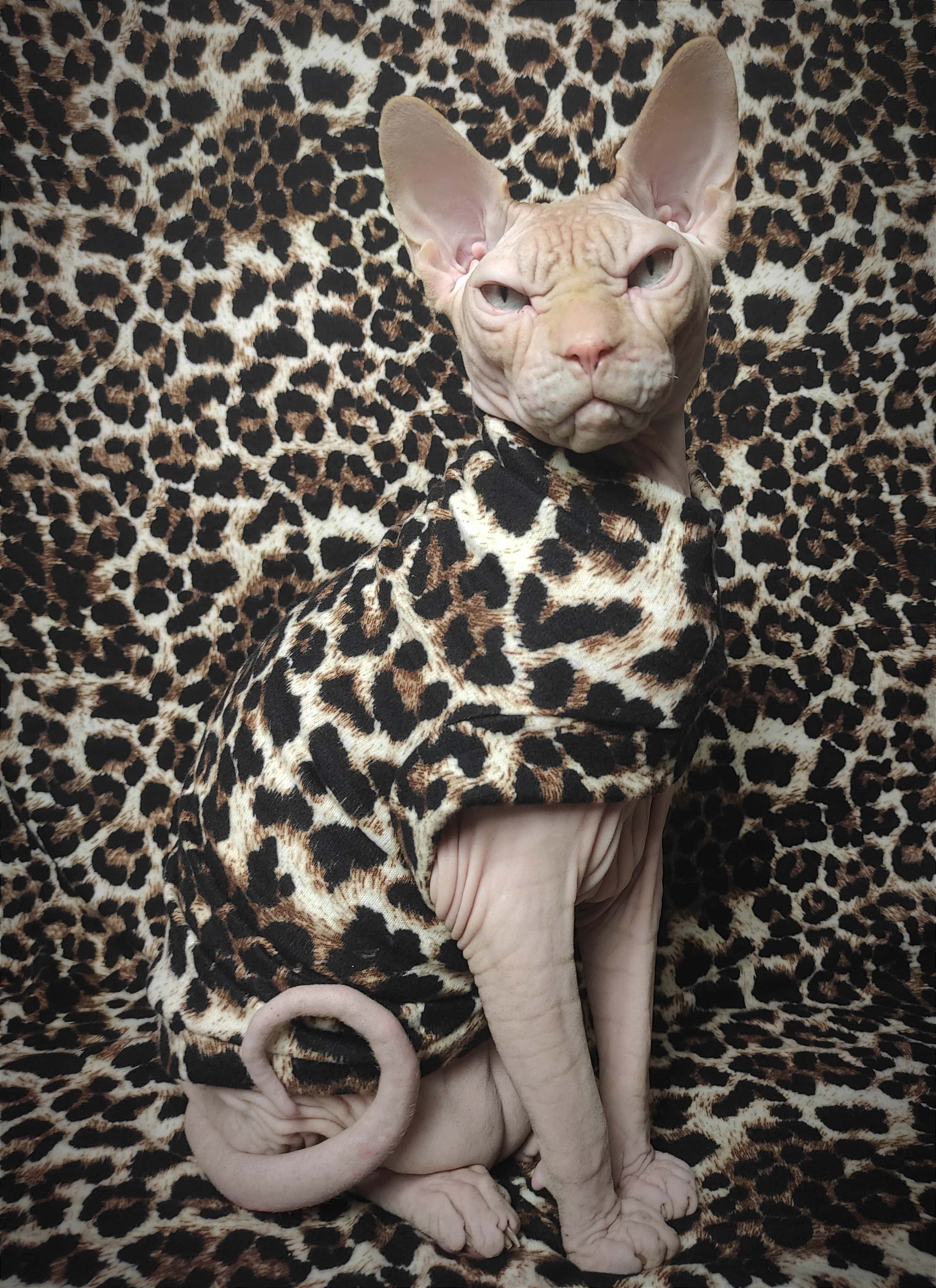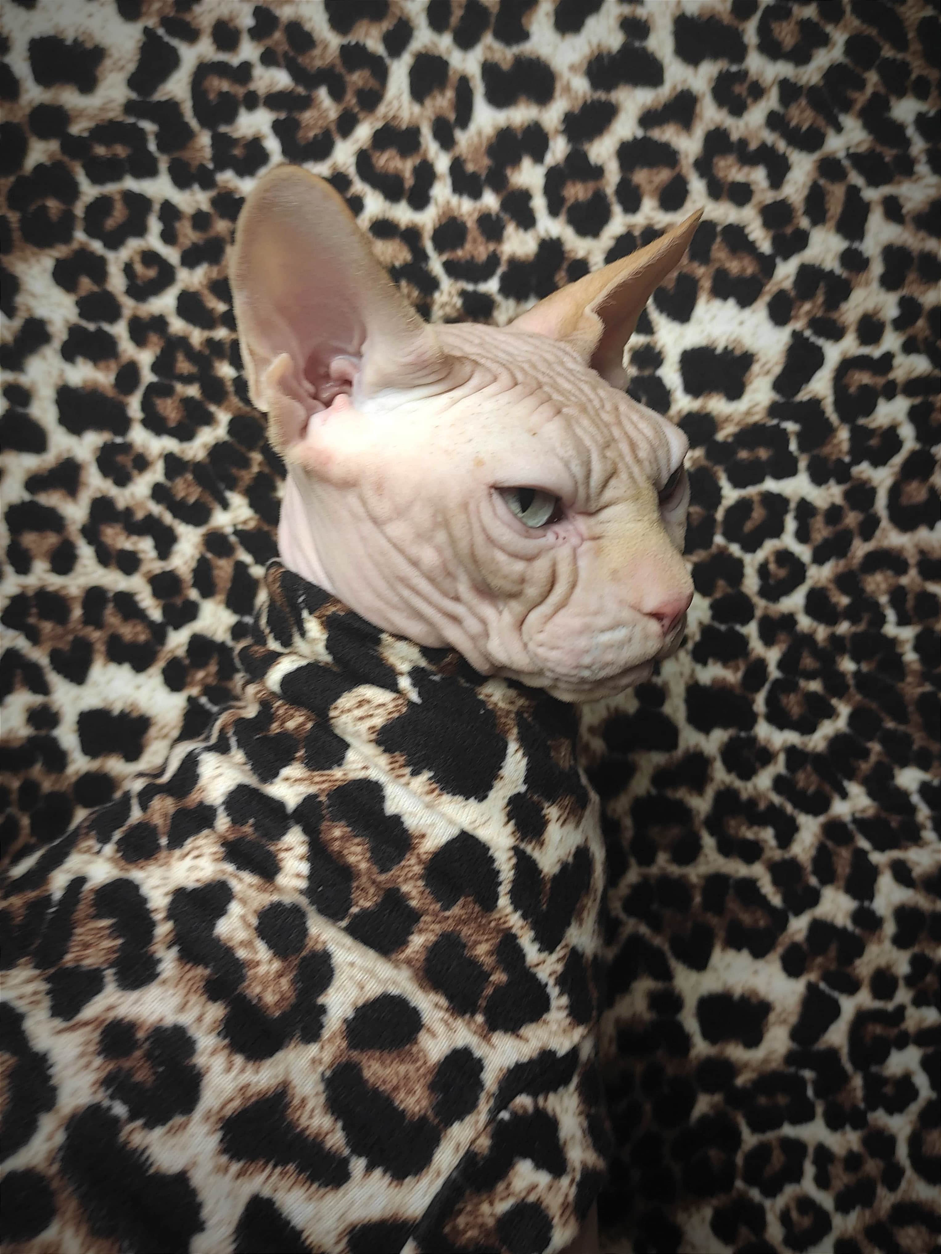 REGULAR size is for most adult hairless cats age 1 to 18. BAMBINO size fits hairless kittens age 6 months to 1 year and smaller adult cats. ANKLE BITER size fits hairless kittens 15 week to 6 month olds. LIL NIPPER size fits hairless kittens age 8 weeks to 15 week olds for when they are with the breeder or for the trip home. Custom orders are welcome for larger and smaller cats - pricing is the same - $27.50