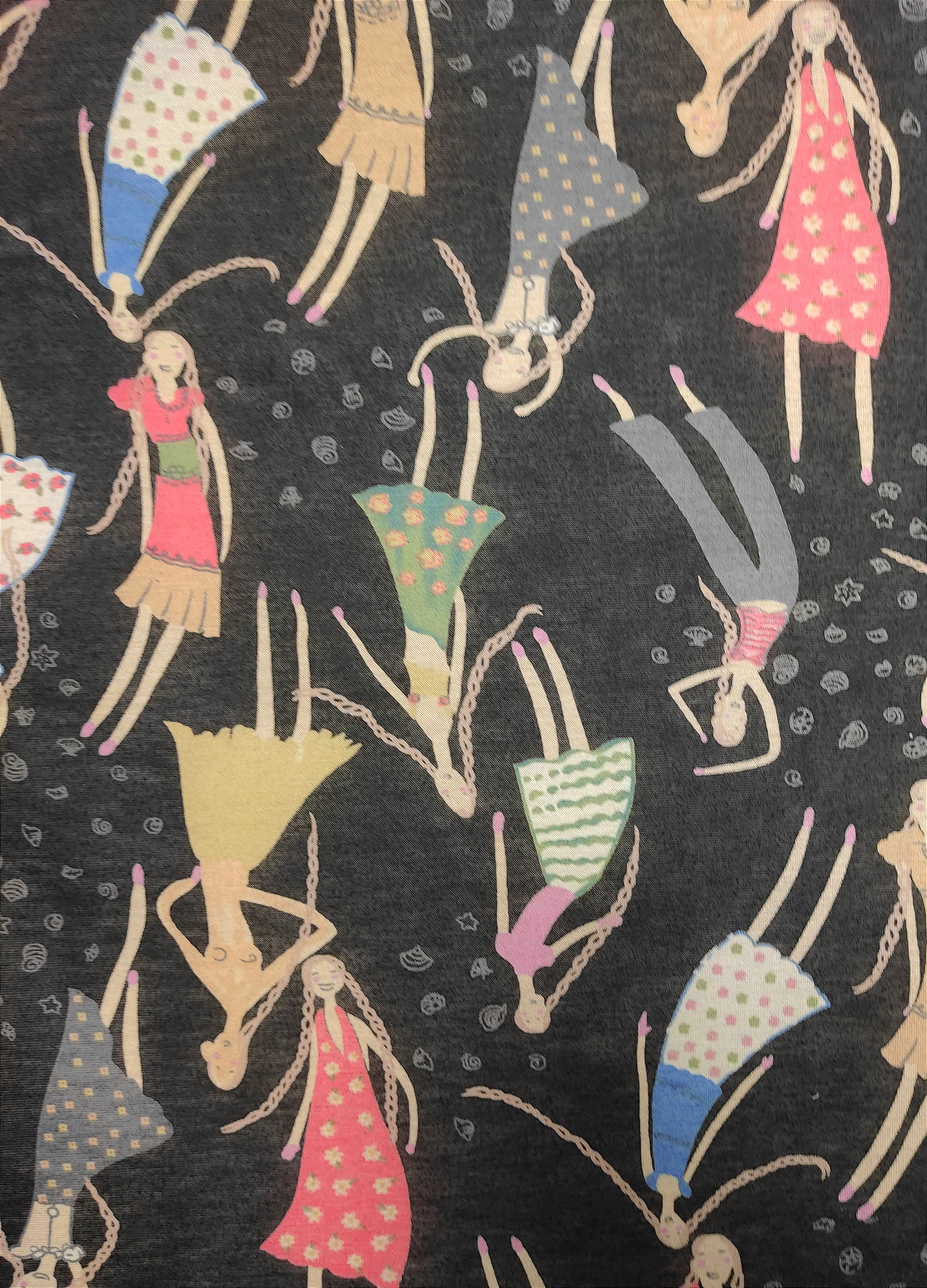 This is a beautiful ultra- lightweight cotton blend fabric with printed paper dolls and adorned with soft black velvet trim. Regular Size limited to only 9. Bambino Size is limited to only 10, Ankle Biter Size is limited to 2, Lil Nipper Size is limited to 2. No more will be made when they are gone.