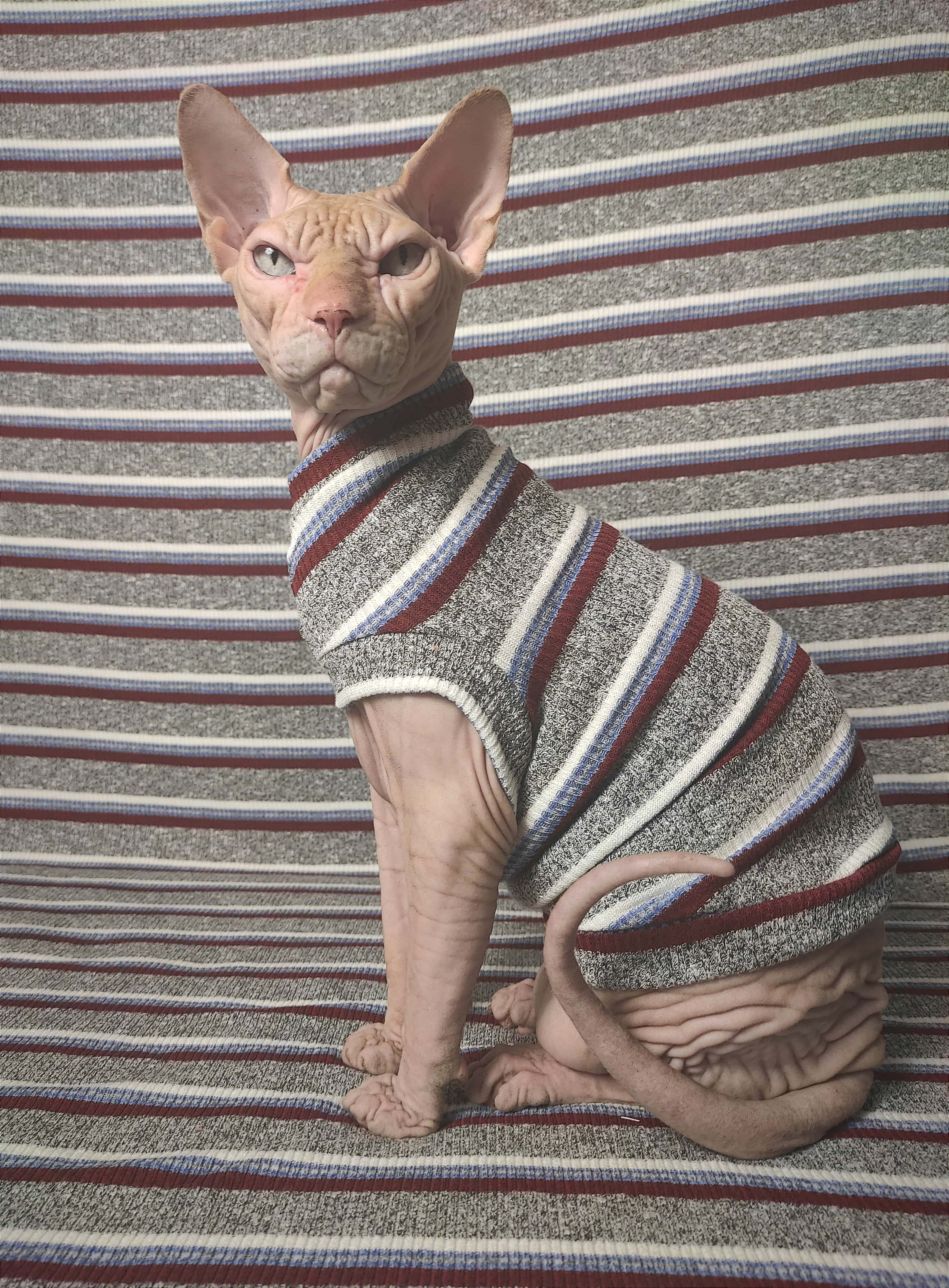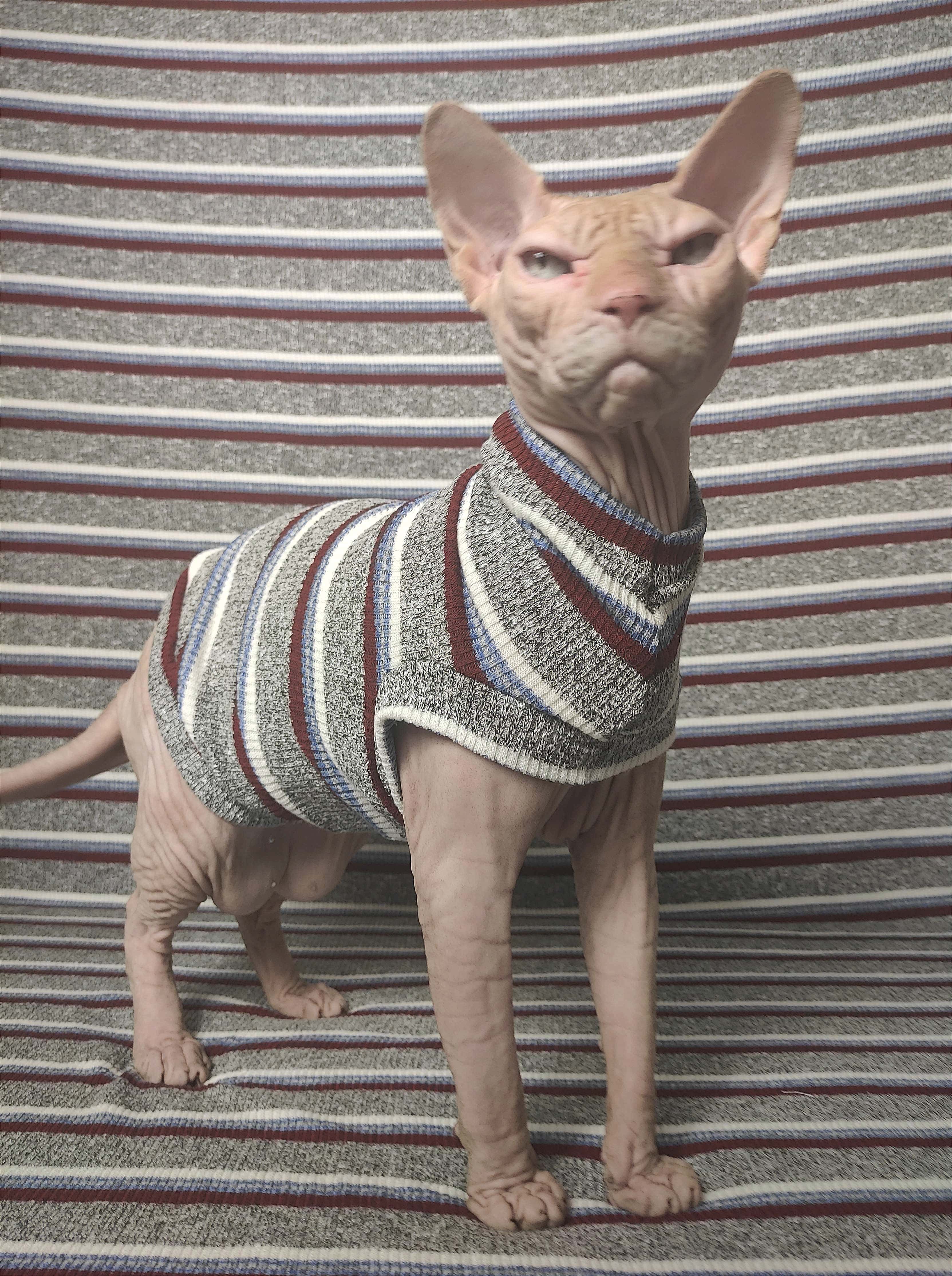 These sweaters fit like no other sweaters. Our original pattern has one hole for both front legs rather than individual holes. The unique design makes it easy to put on and take off, while allowing for improved mobility of your cat. No annoying Velcro anywhere. No awkward walking. All sweaters are machine washable and dryer safe unless specifically mentioned.
