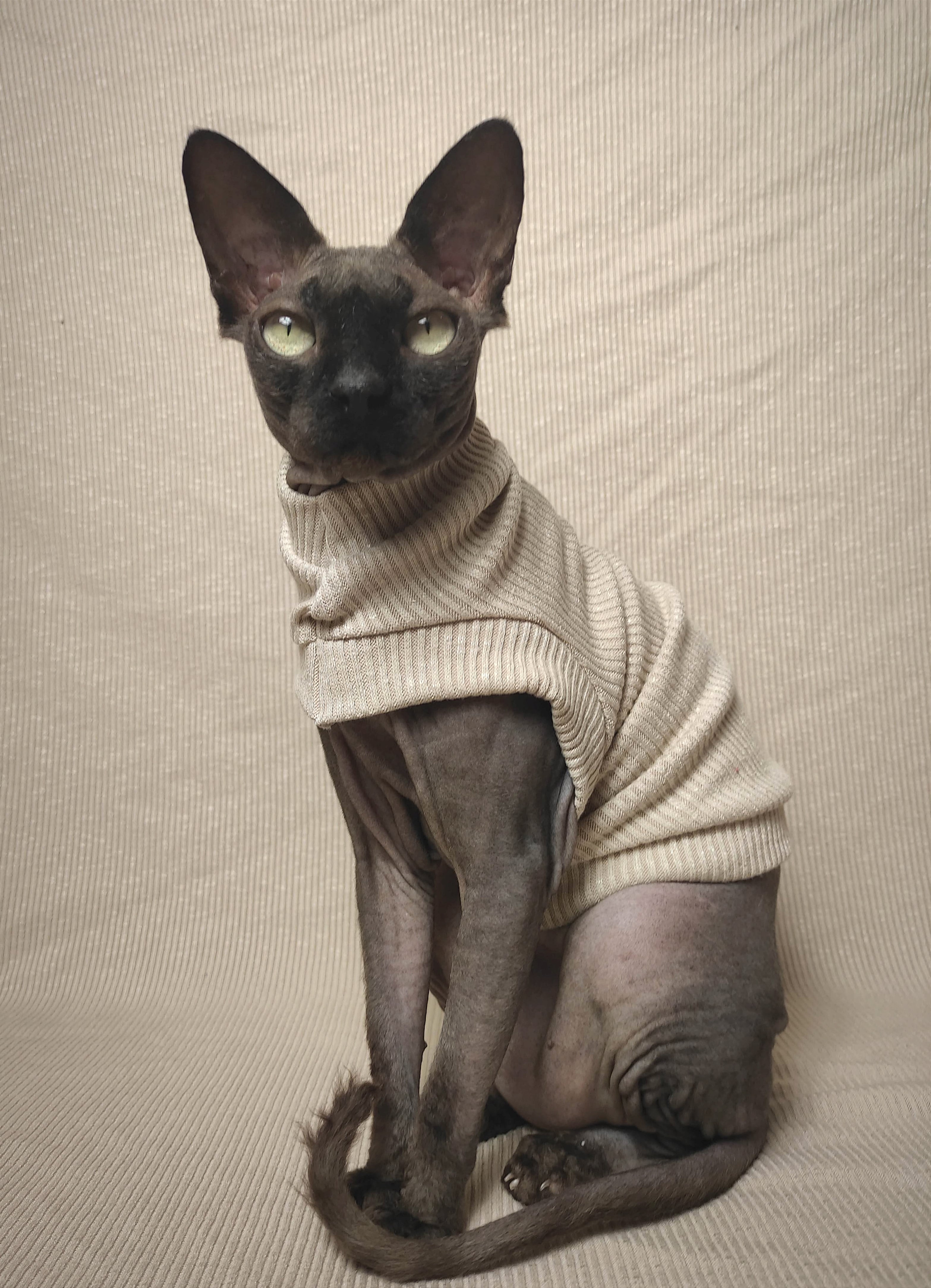 REGULAR size is for most adult hairless cats age 1 to 18. BAMBINO size fits hairless kittens age 6 months to 1 year and smaller adult cats. ANKLE BITER size fits kittens 15 weeks to 6 month olds. LIL NIPPER size fits hairless kittens age 8 weeks to 15 week olds for when they are with the breeder or for the trip home. Custom orders are welcome for larger and smaller cats - pricing is the same - $27.50