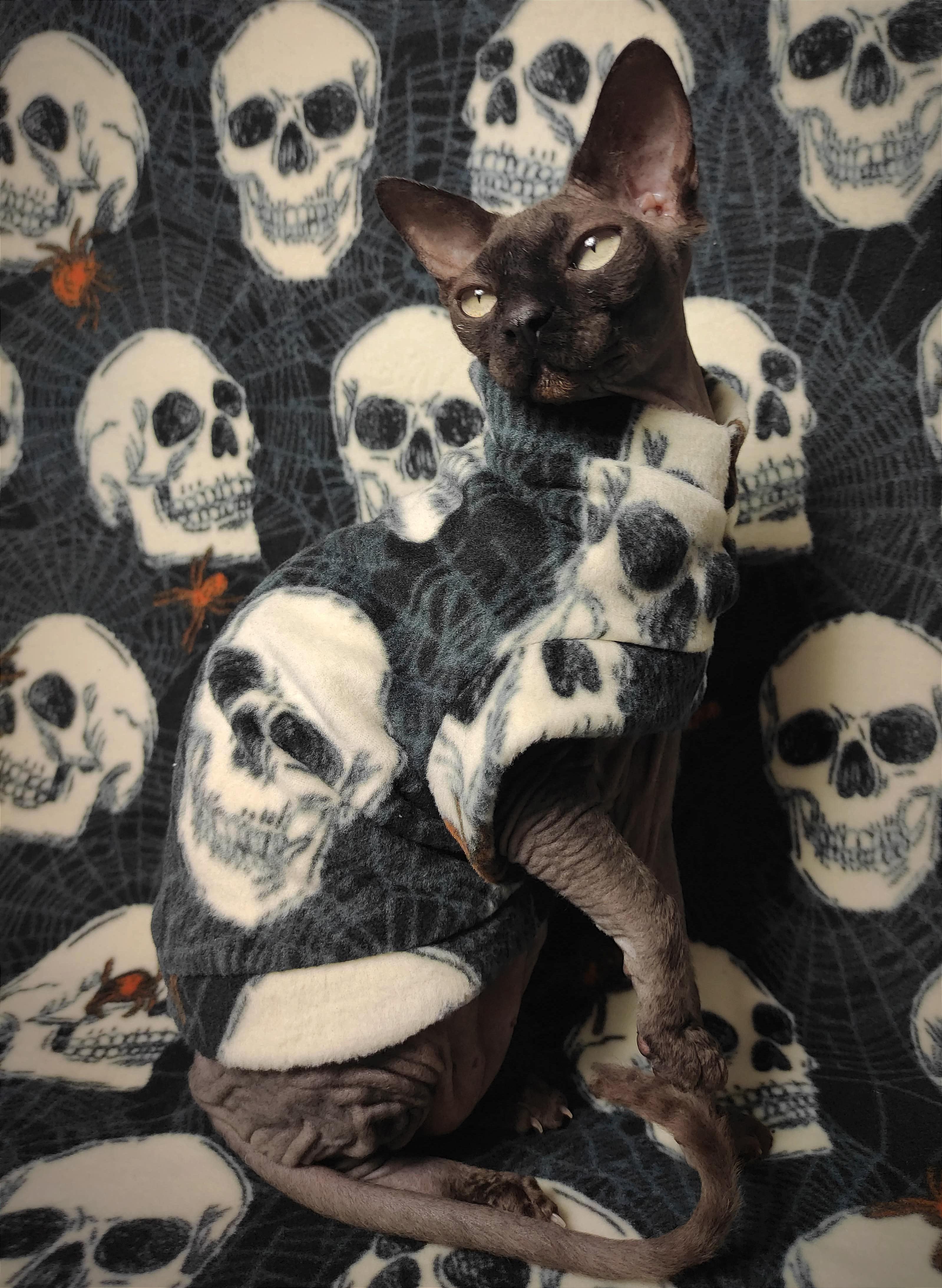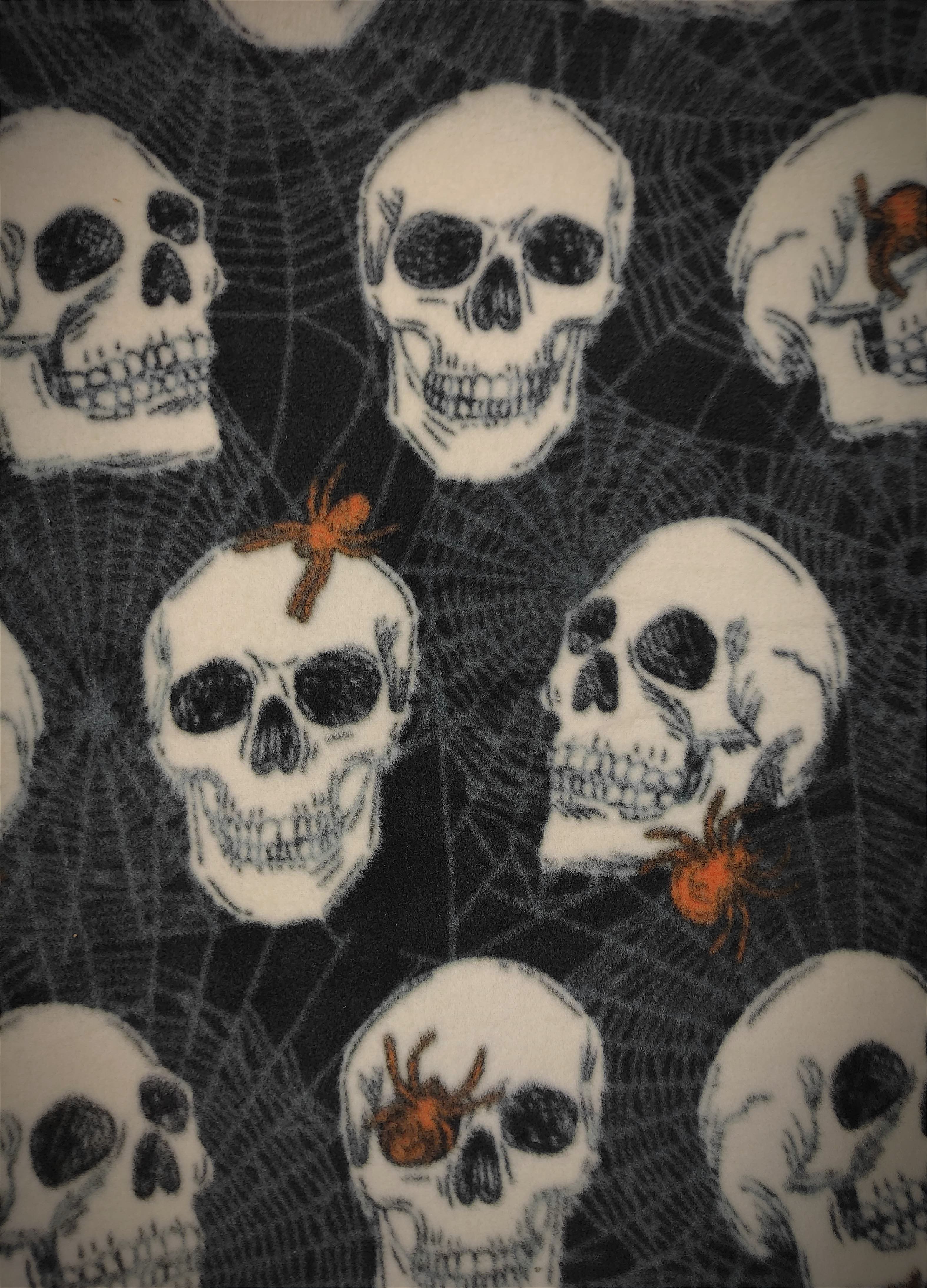 This is a soft medium weight stretchy luxe fleece with skulls, spiders and spiderwebs 😻
