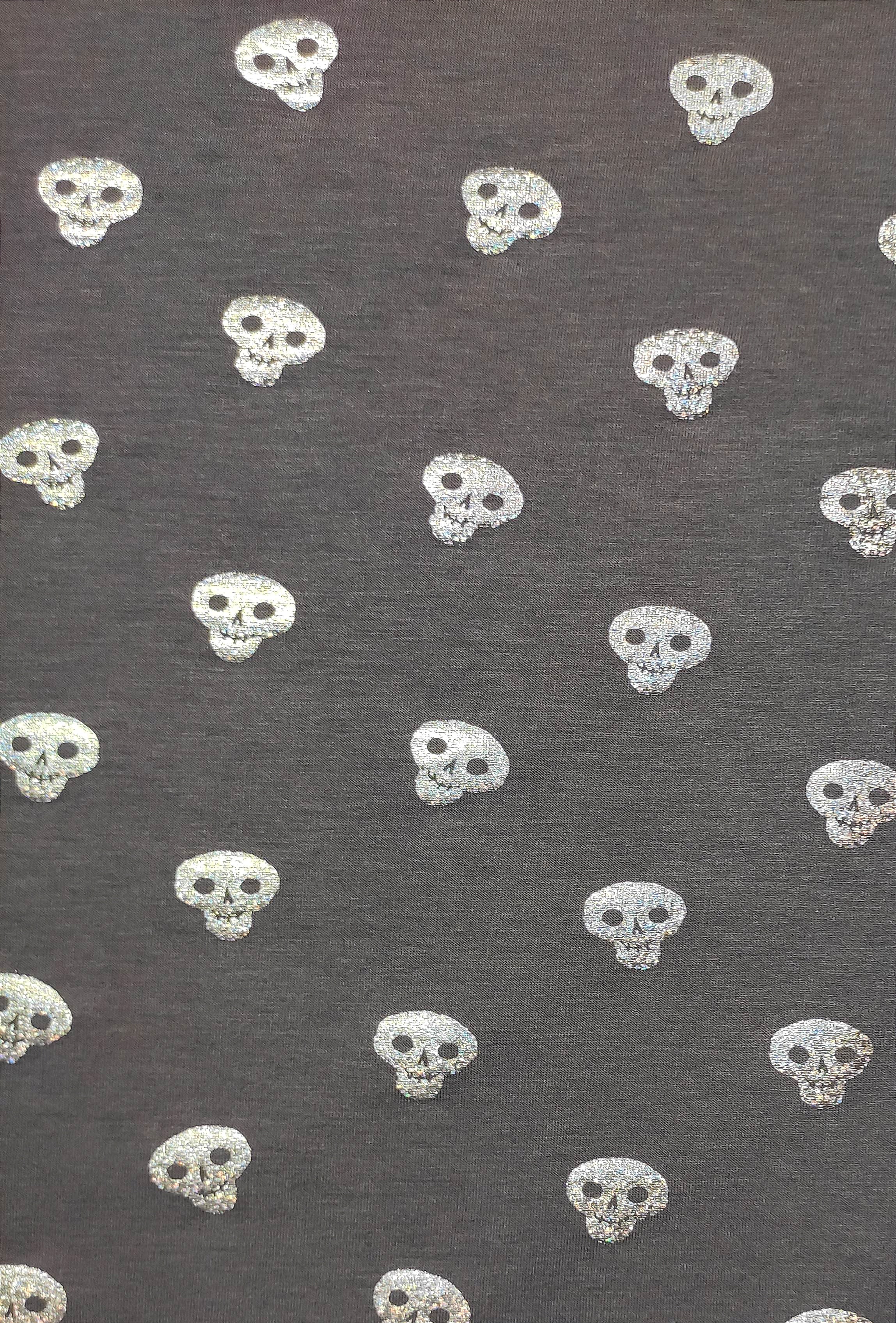 This is a stretchy lightweight cotton spandex fabric with holographic skulls on grey background. Regular Size limited to only 9. Bambino Size is limited to only 7, Ankle Biter Size is limited to 2, Lil Nipper Size is limited to 2. No more will be made when they are gone.