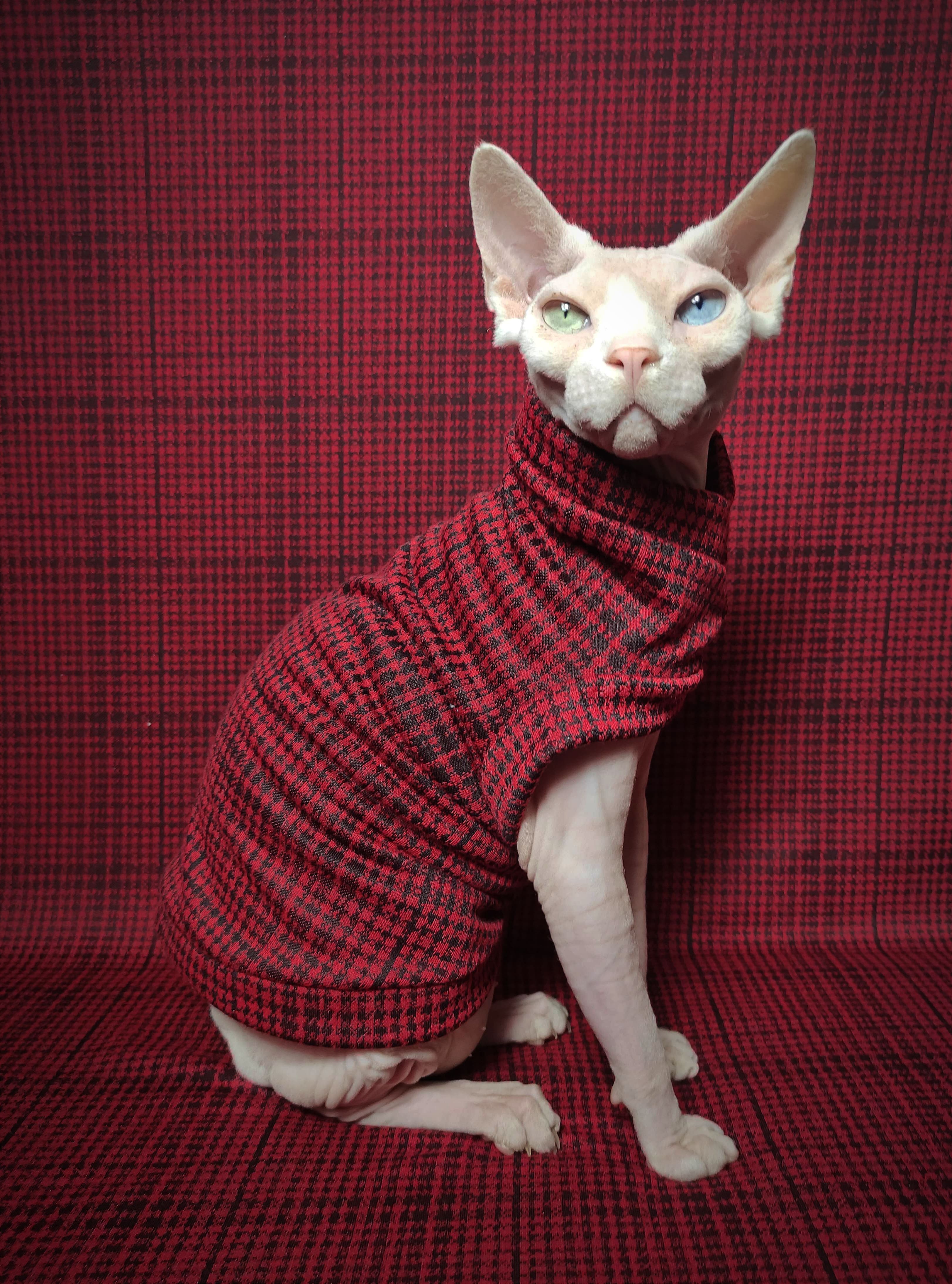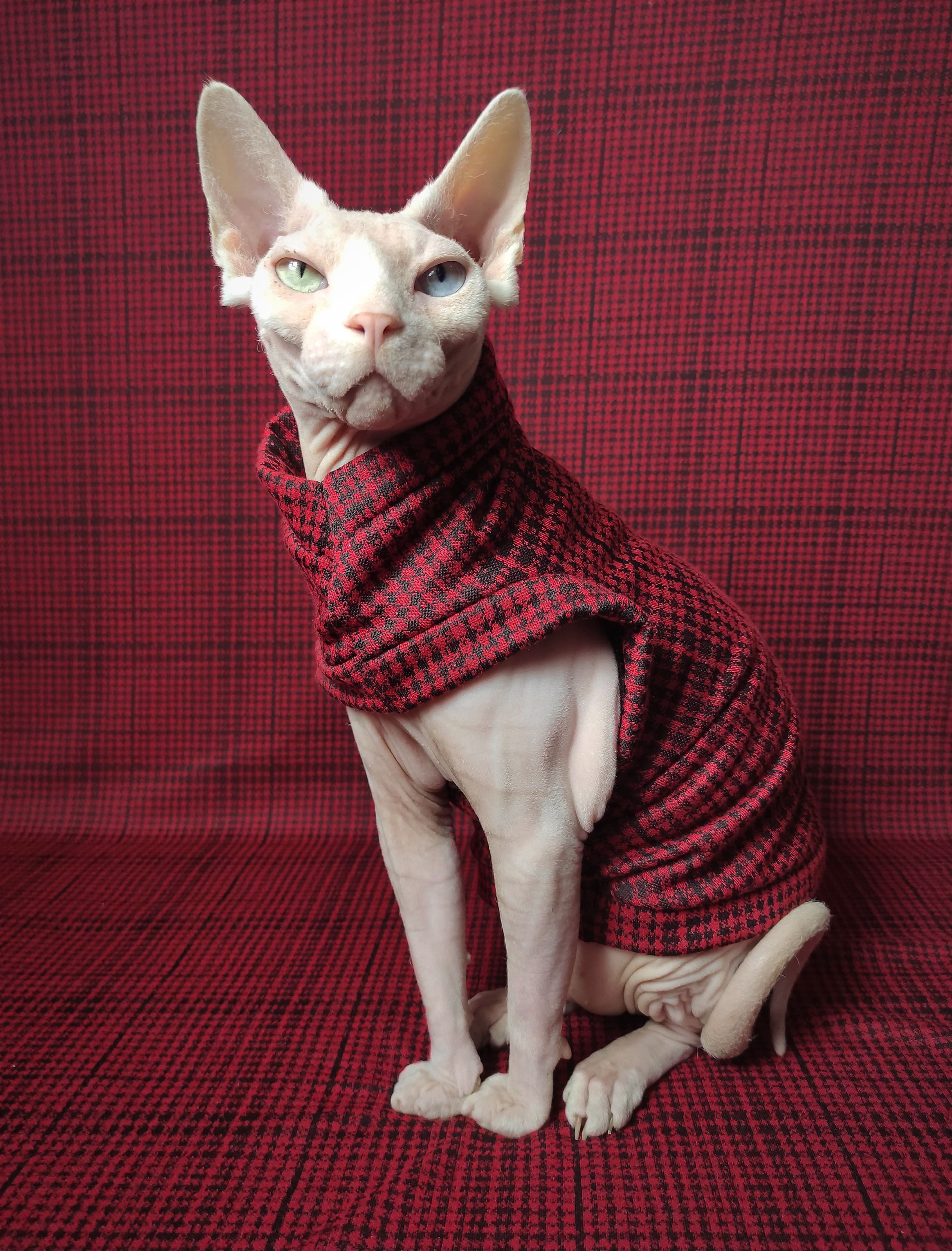 These sweaters fit like no other sweaters. Our original pattern has one hole for both front legs rather than individual holes. The unique design makes it easy to put on and take off, while allowing for improved mobility of your cat. No annoying Velcro anywhere. No awkward walking. All sweaters are machine washable and dryer safe unless specifically mentioned.