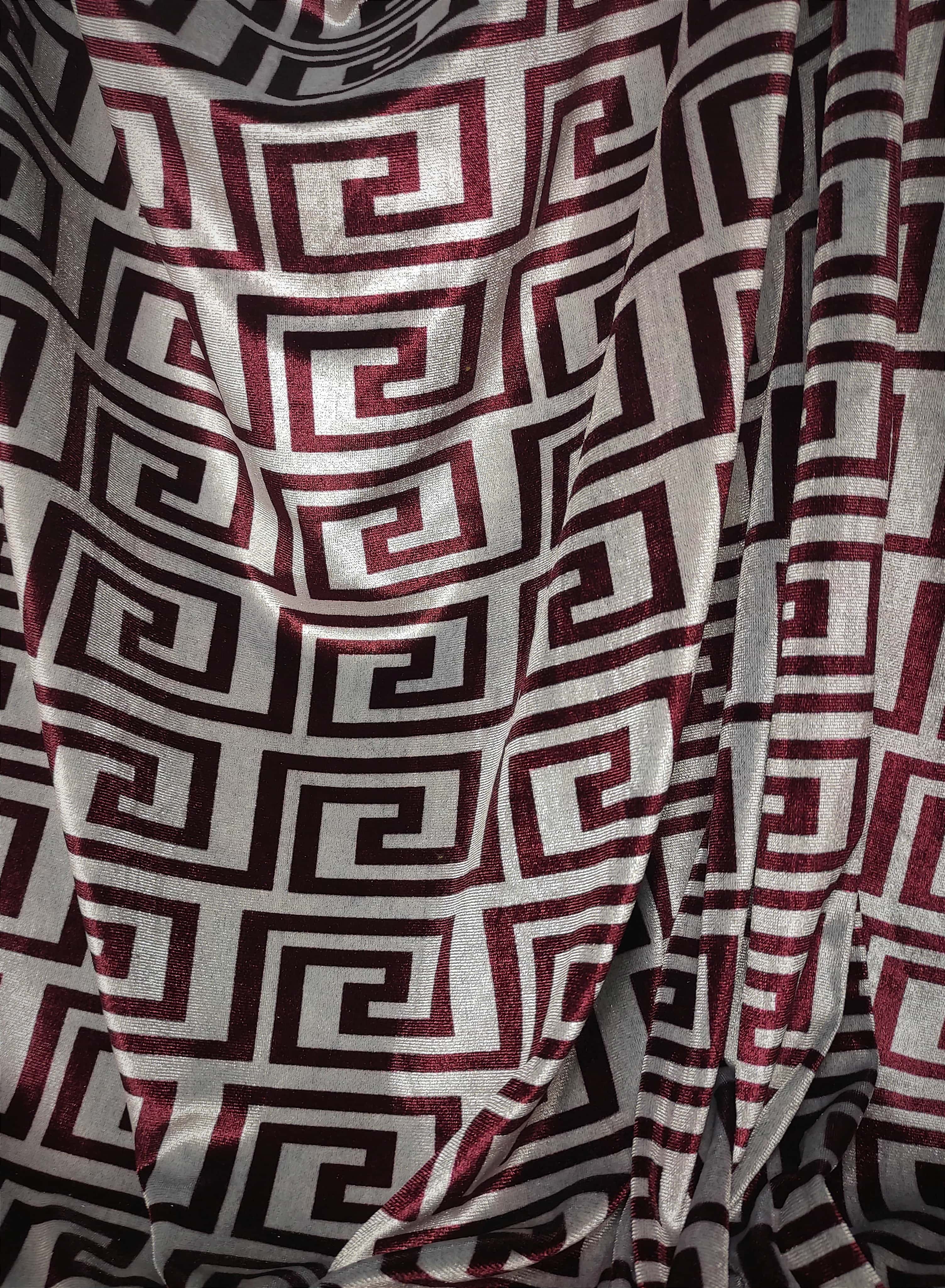 This luxurious stretch velvet fabric is super soft and lightweight with beautiful silver and oxblood print. Regular Size limited to only 8. Bambino Size is limited to only 7. Ankle Biter Size is limited to 2, Lil Nipper Size is limited to 2. No more will be made when they are gone.