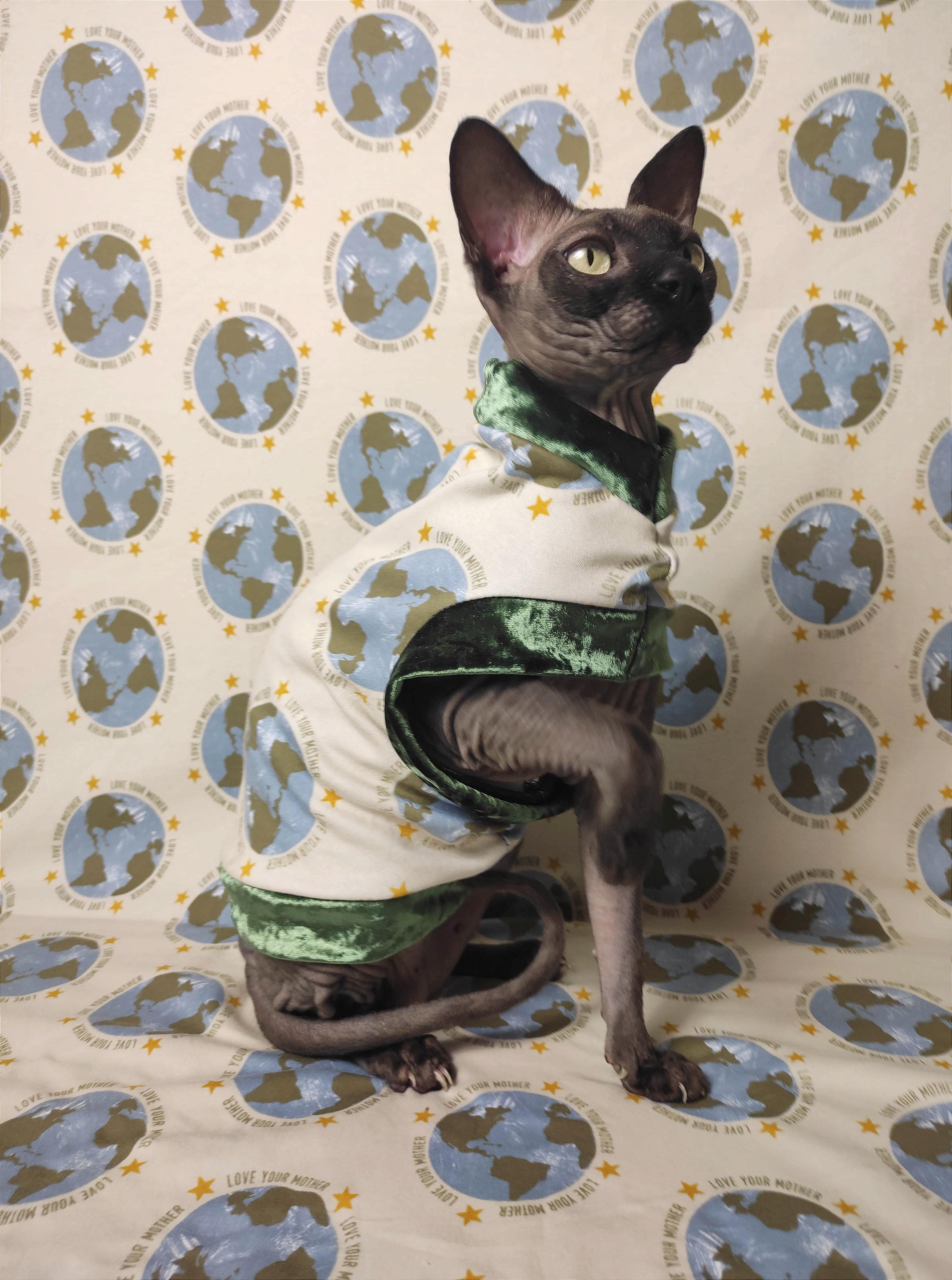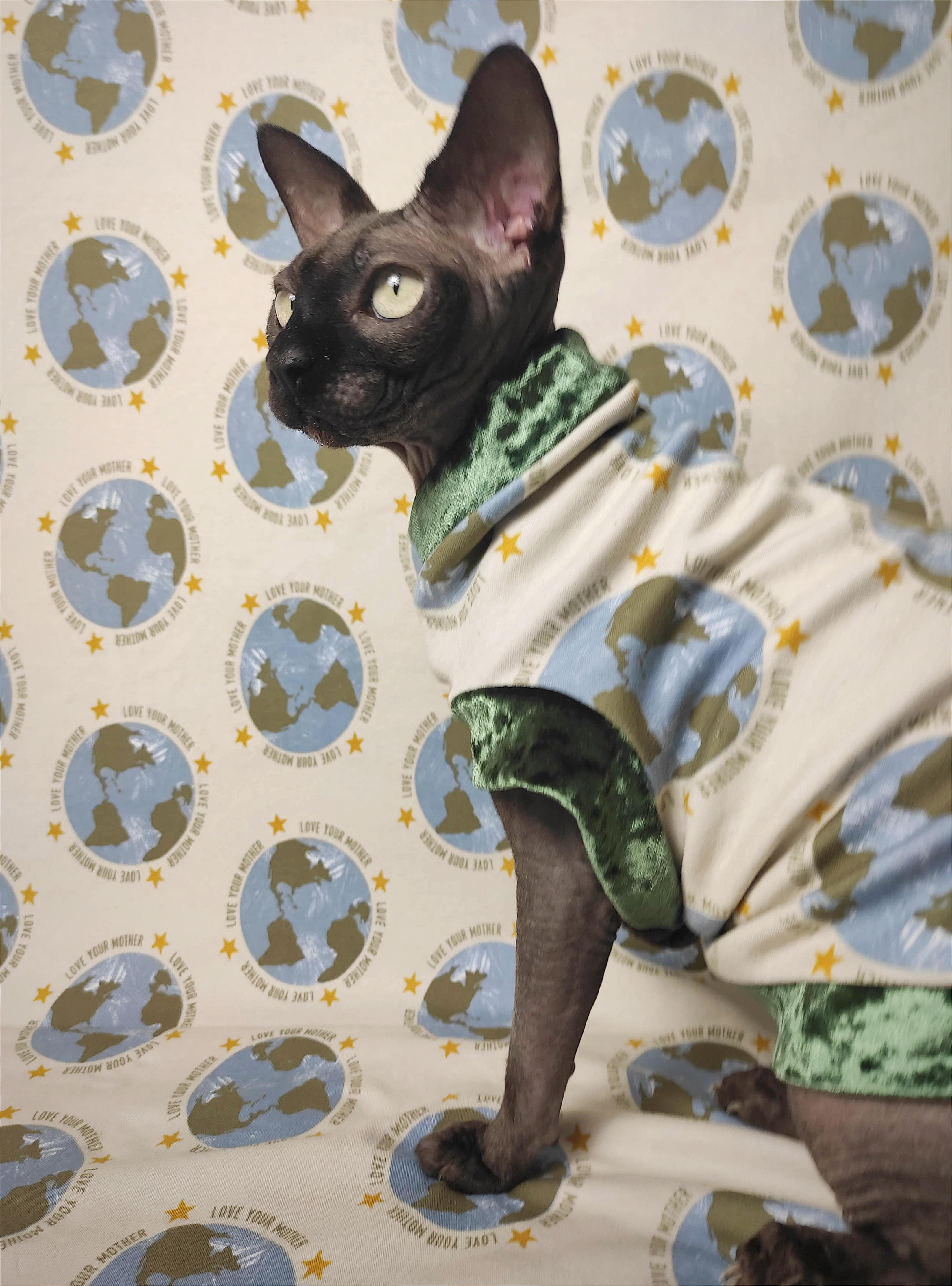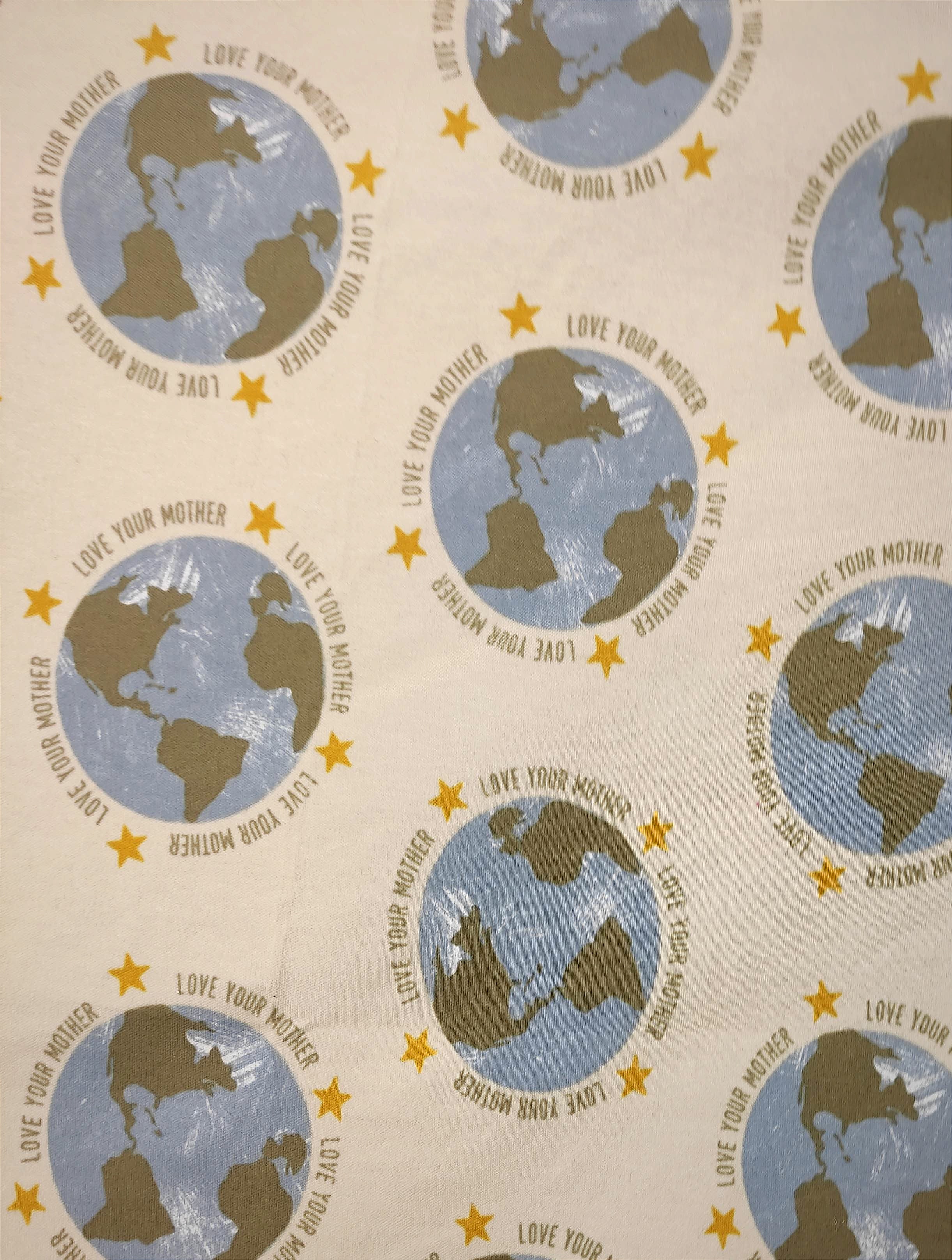 This is a lightweight cotton spandex fabric printed with "Love Your Mother" encircling the Earth, trimmed with soft crushed green velvet. Regular Size limited to only 8, Bambino Size is limited to only 8, Ankle Biter Size is limited to 2, Lil Nipper Size is limited to 2. No more will be made when they are gone.
