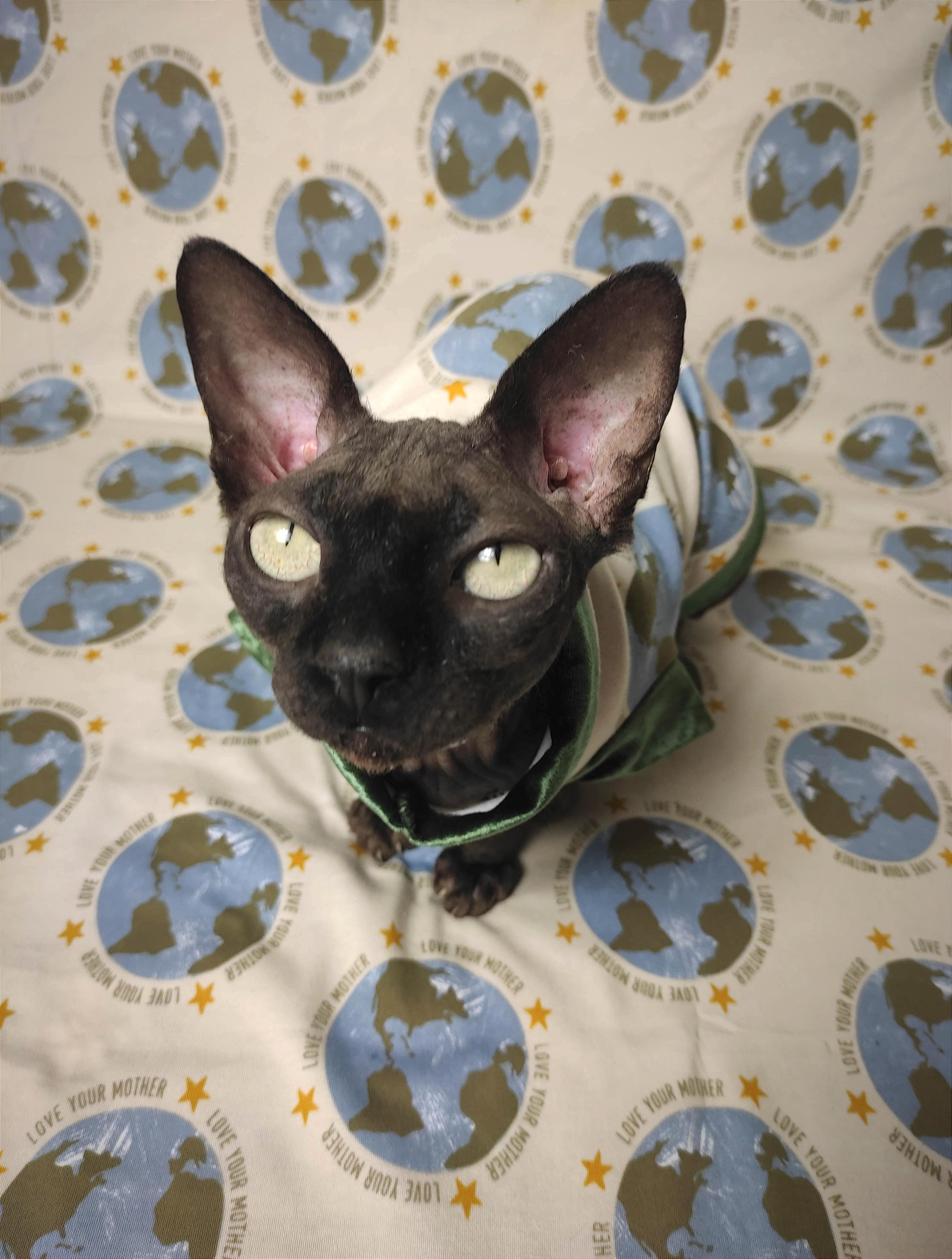 REGULAR size is for most adult hairless cats age 1 to 18. BAMBINO size fits hairless kittens age 6 months to 1 year and smaller adult cats. ANKLE BITER size fits kittens 15 weeks to 6 month olds. LIL NIPPER size fits hairless kittens age 8 weeks to 15 week olds for when they are with the breeder or for the trip home. Custom orders are welcome for larger and smaller cats - pricing is the same - $27.50