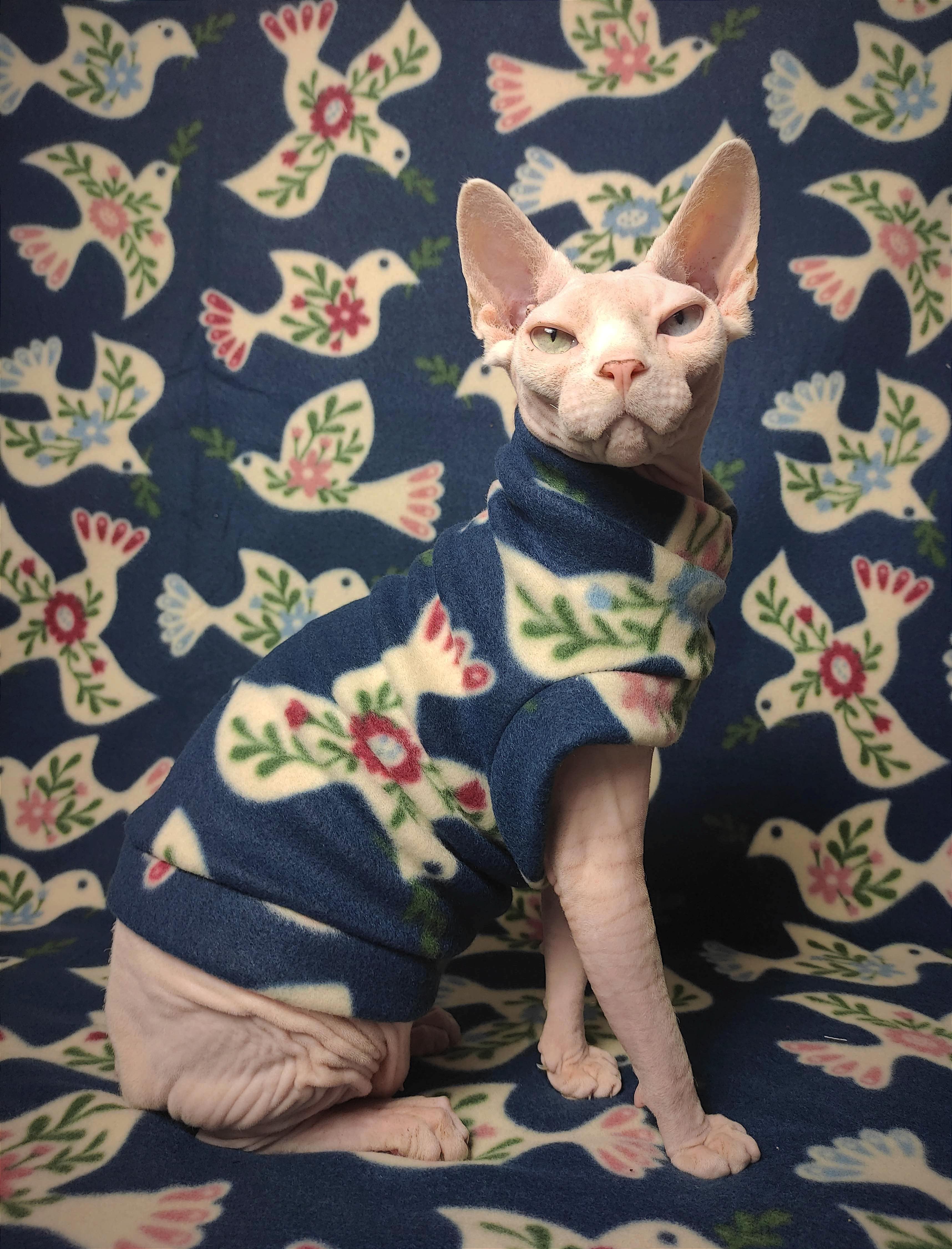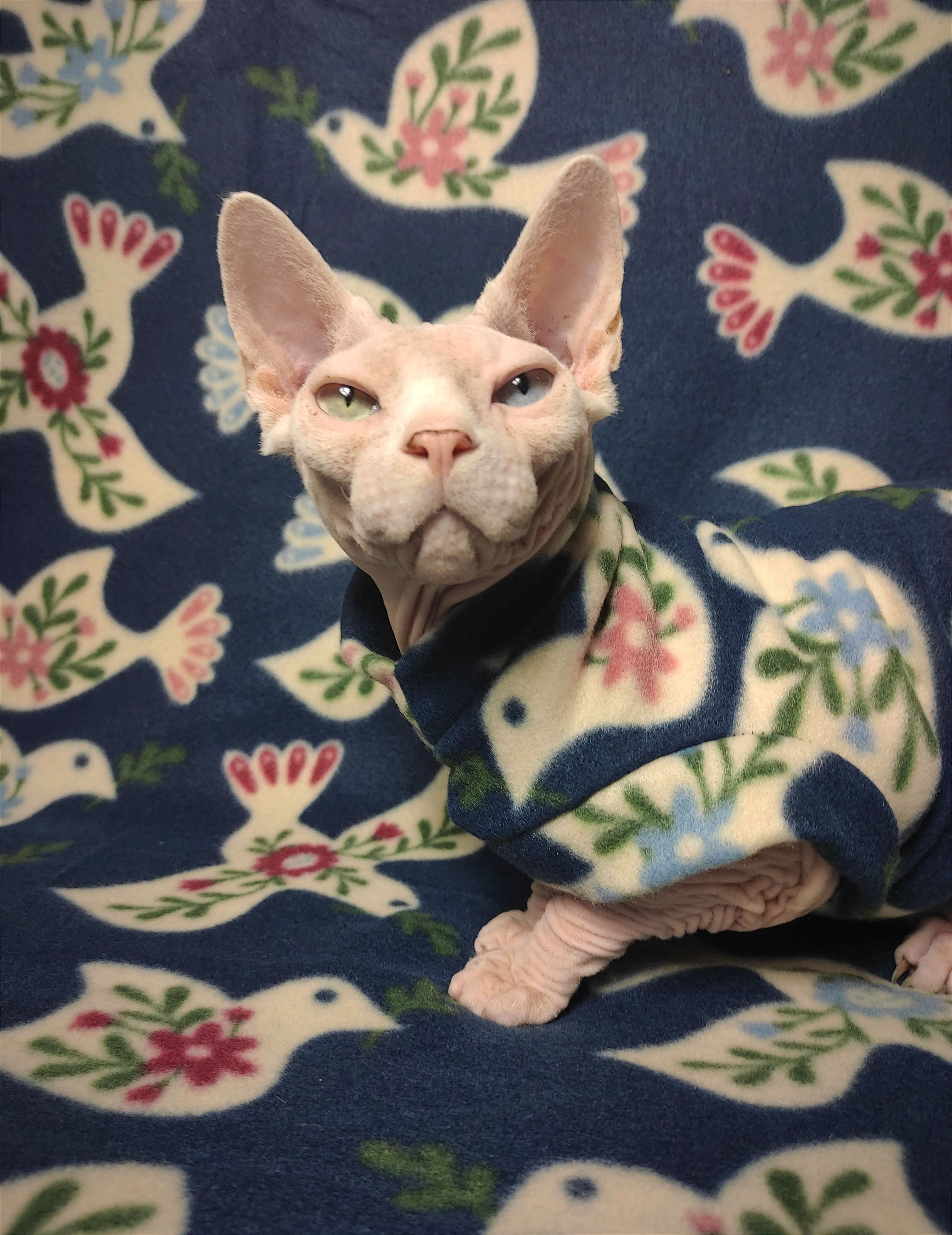 REGULAR size is for most adult hairless cats age 1 to 18. BAMBINO size fits hairless kittens age 6 months to 1 year and smaller adult cats. ANKLE BITER size fits hairless kittens 15 week to 6 month olds. LIL NIPPER size fits hairless kittens age 8 weeks to 15 week olds for when they are with the breeder or for the trip home. Custom orders are welcome for larger and smaller cats - pricing is the same - $27.50