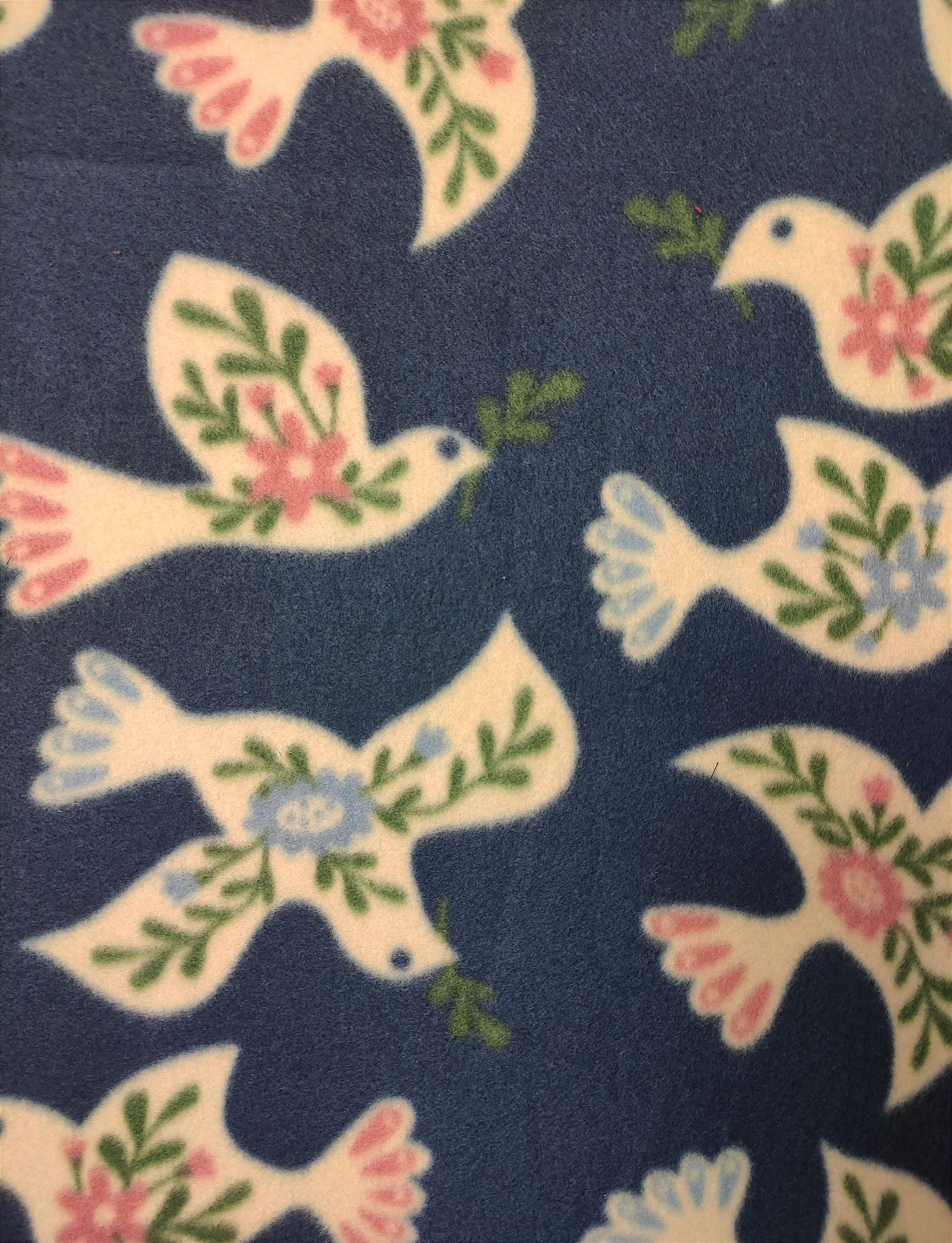 This is a soft stretchy medium weight fleece with peace doves on navy blue background. Regular Size limited to only 7. Bambino Size limited to only 7, Ankle Biter Size limited to only 2. Lil Nipper Size limited to only 2. No more will be made when they are gone.