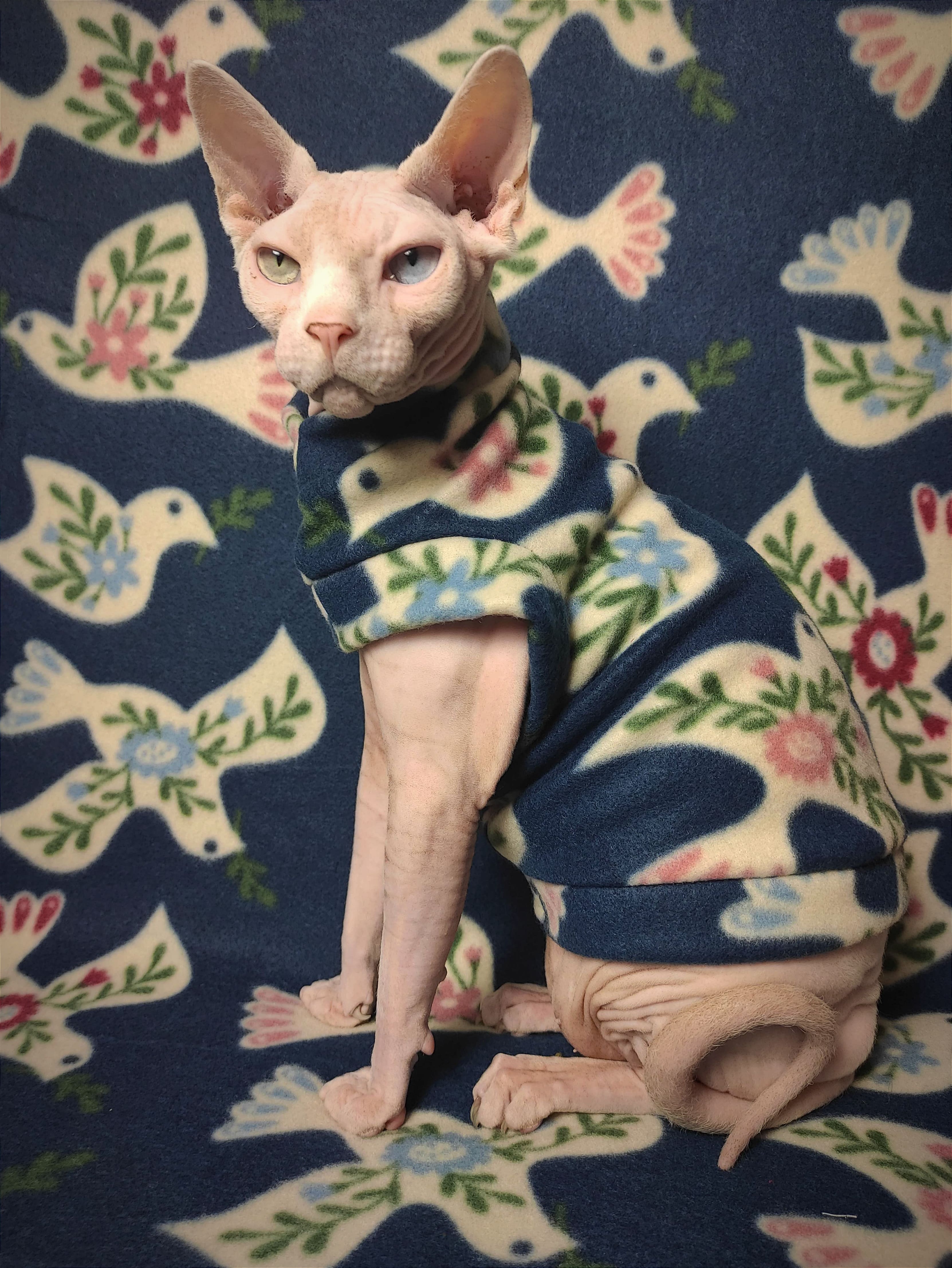 These sweaters fit like no other sweaters. Our original pattern has one hole for both front legs rather than individual holes. The unique design makes it easy to put on and take off, while allowing for improved mobility of your cat. No annoying Velcro anywhere. No awkward walking. All sweaters are machine washable and dryer safe unless specifically mentioned.