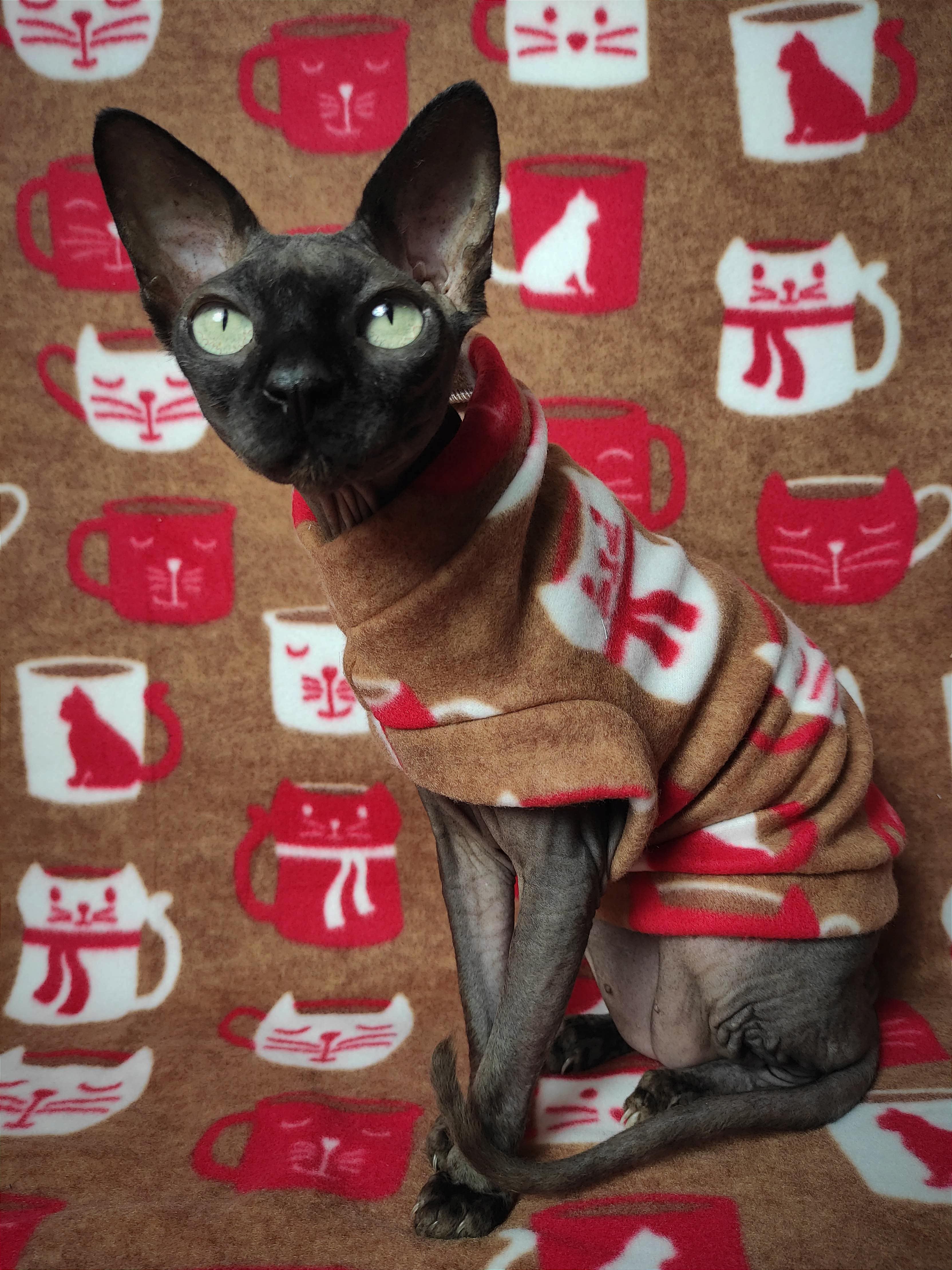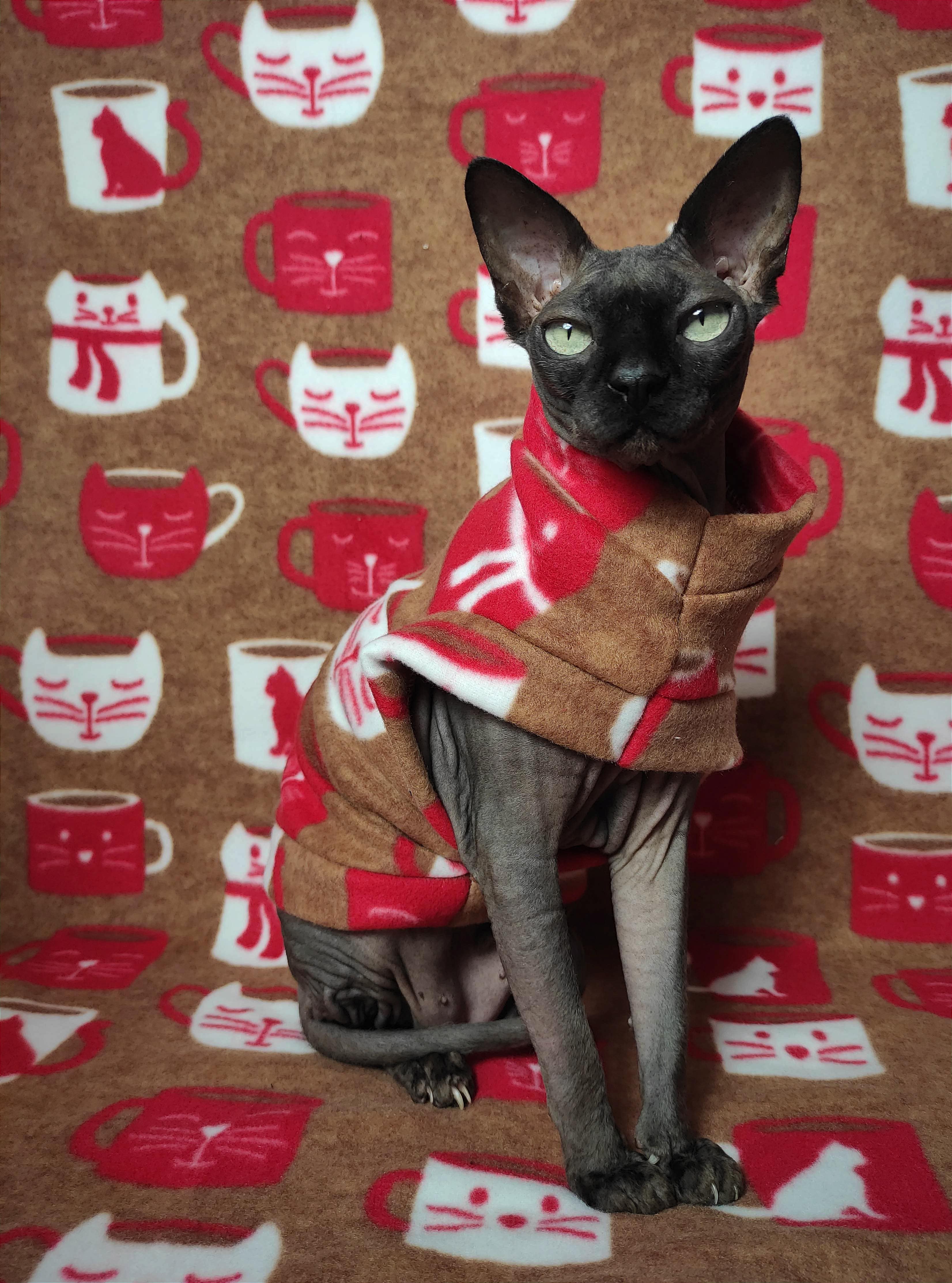 REGULAR size is for most adult hairless cats age 1 to 18. BAMBINO size fits hairless kittens age 6 months to 1 year and smaller adult cats. ANKLE BITER size fits hairless kittens 15 week to 6 month olds. LIL NIPPER size fits hairless kittens age 8 weeks to 15 week olds for when they are with the breeder or for the trip home. Custom orders are welcome for larger and smaller cats - pricing is the same - $27.50