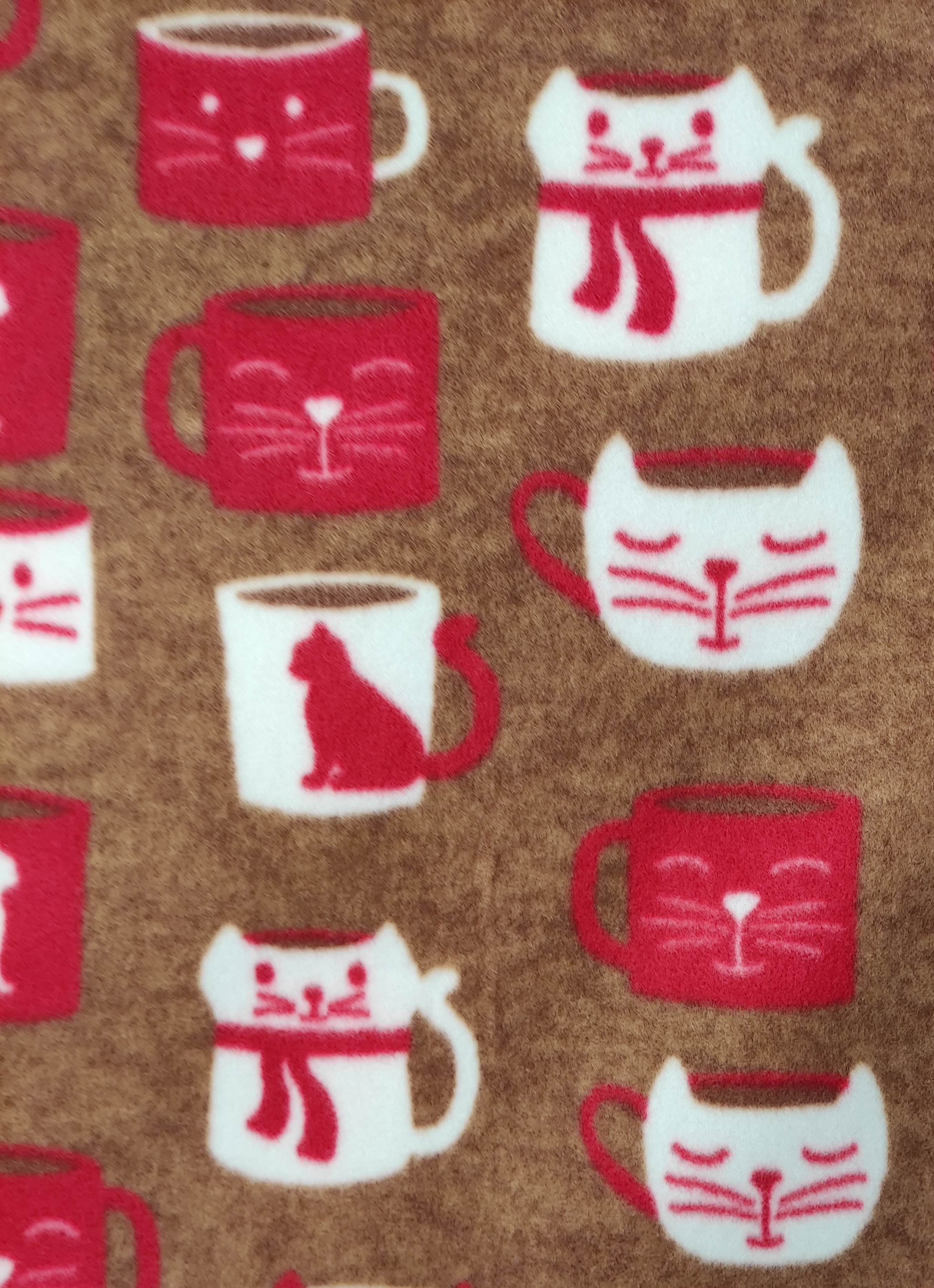 This is a soft stretchy medium weight fleece with cat mugs on marbled brown background. Regular Size limited to only 7. Bambino Size limited to only 7, Ankle Biter Size limited to only 2. Lil Nipper Size limited to only 2. No more will be made when they are gone.
