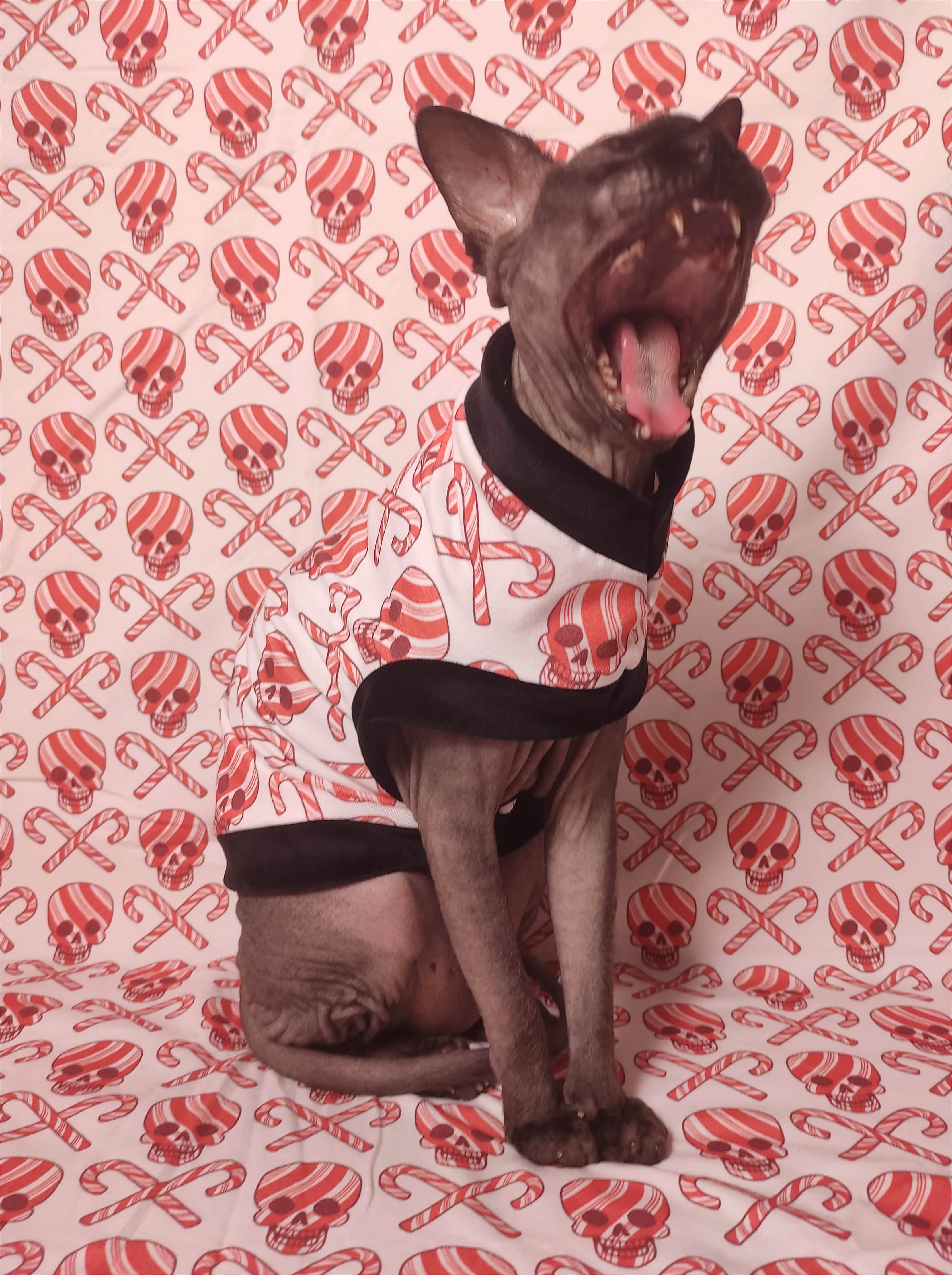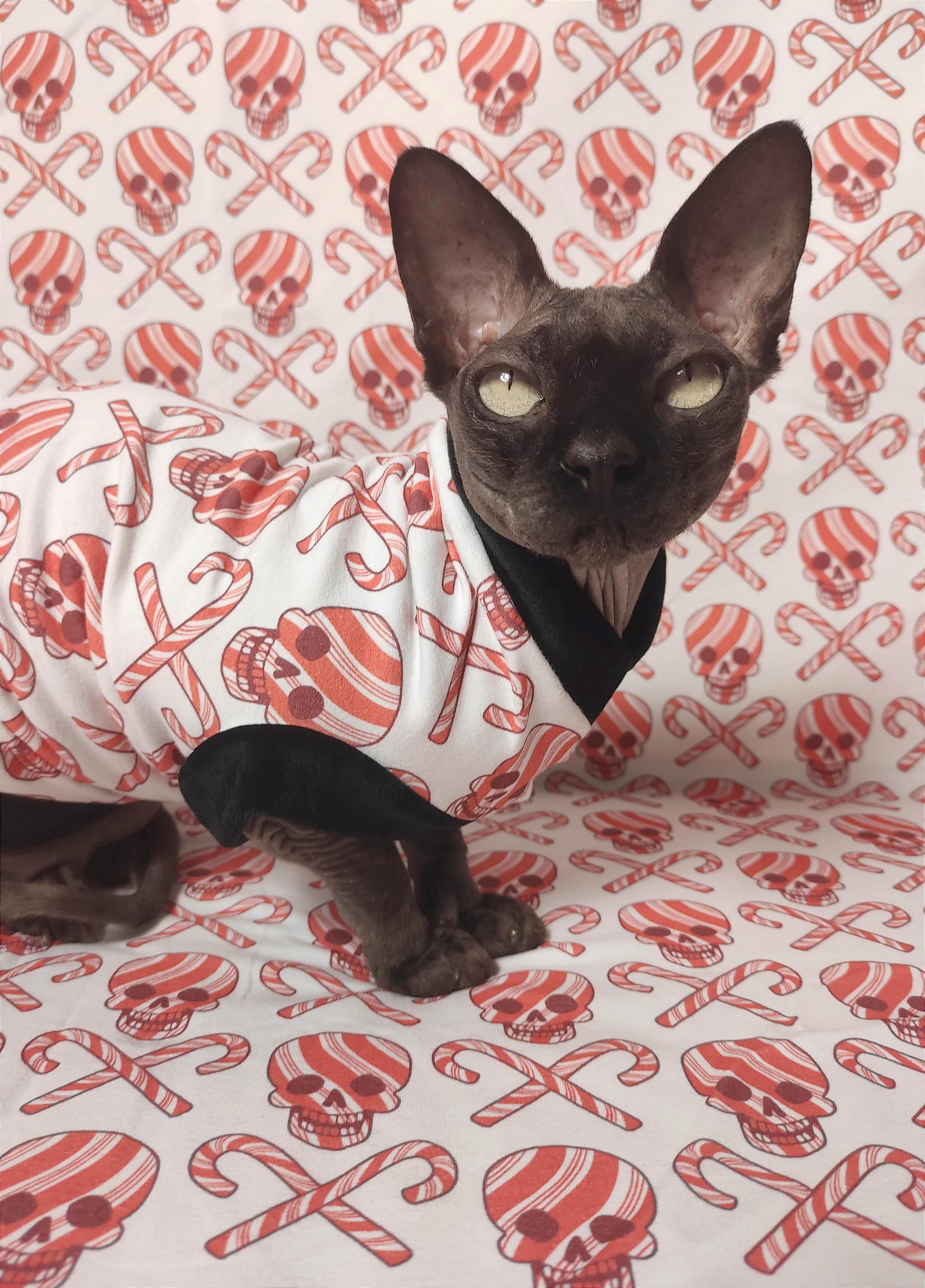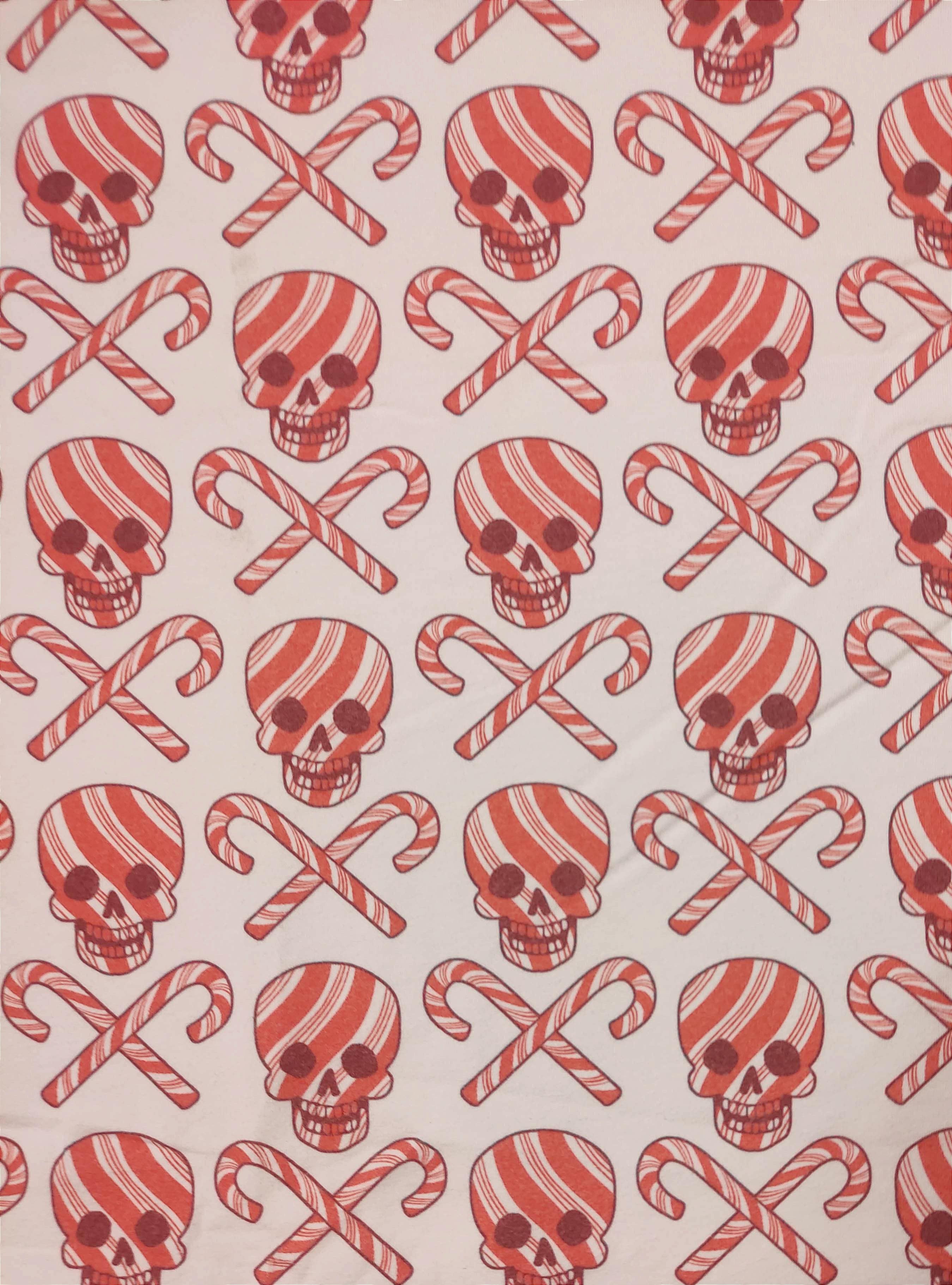 This is a stretchy lightweight cotton spandex fabric with candy canes and candy cane skull pattern, trimmed with soft black velvet. Regular Size limited to only 9. Bambino Size is limited to only 7, Ankle Biter Size is limited to 2, Lil Nipper Size is limited to 2. No more will be made when they are gone.