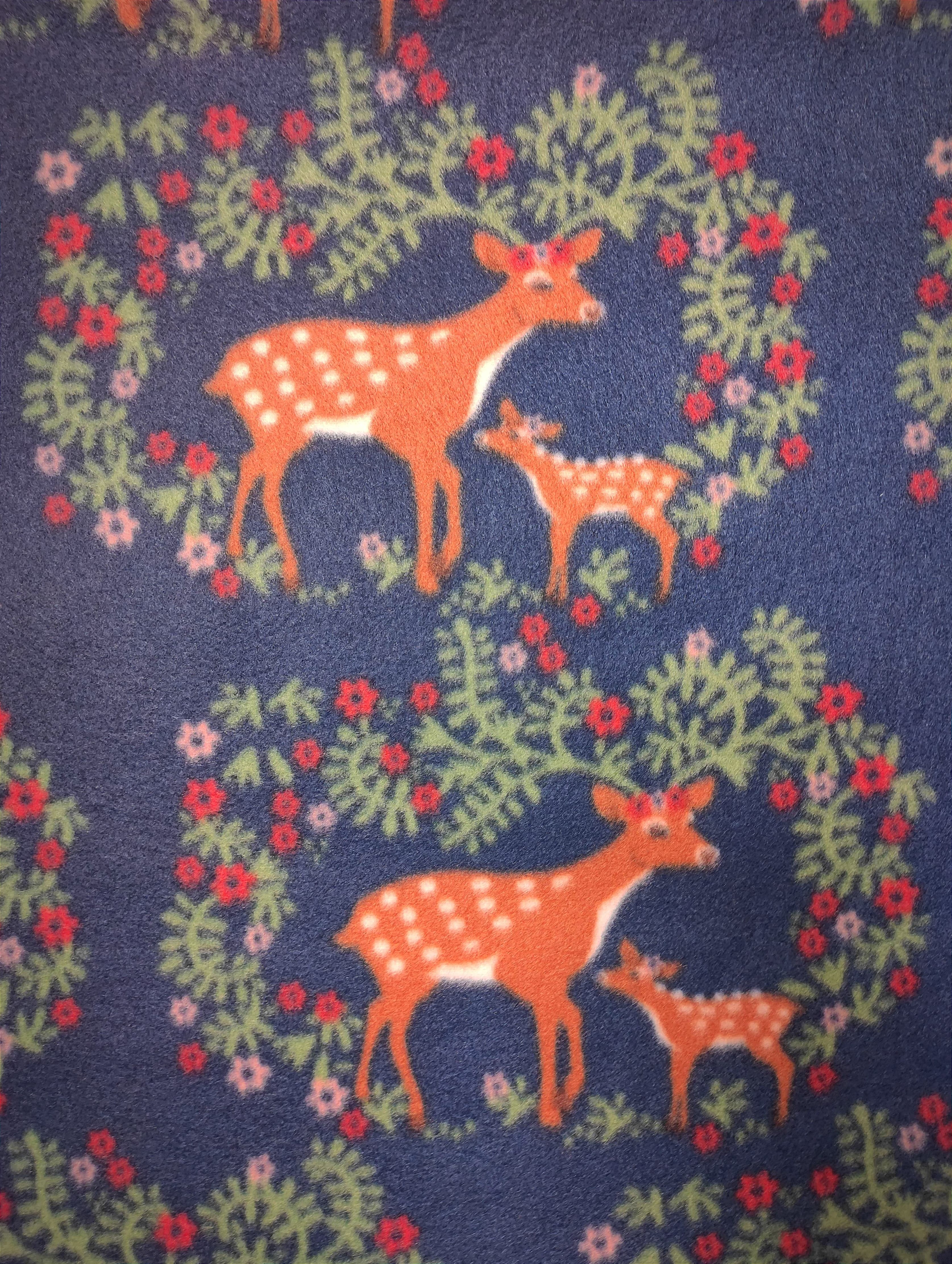 This is a soft stretchy medium weight fleece with deer growing flowers from their antlers on blue background. Regular Size limited to only 7. Bambino Size limited to only 7, Ankle Biter Size limited to only 2. Lil Nipper Size limited to only 2. No more will be made when they are gone.