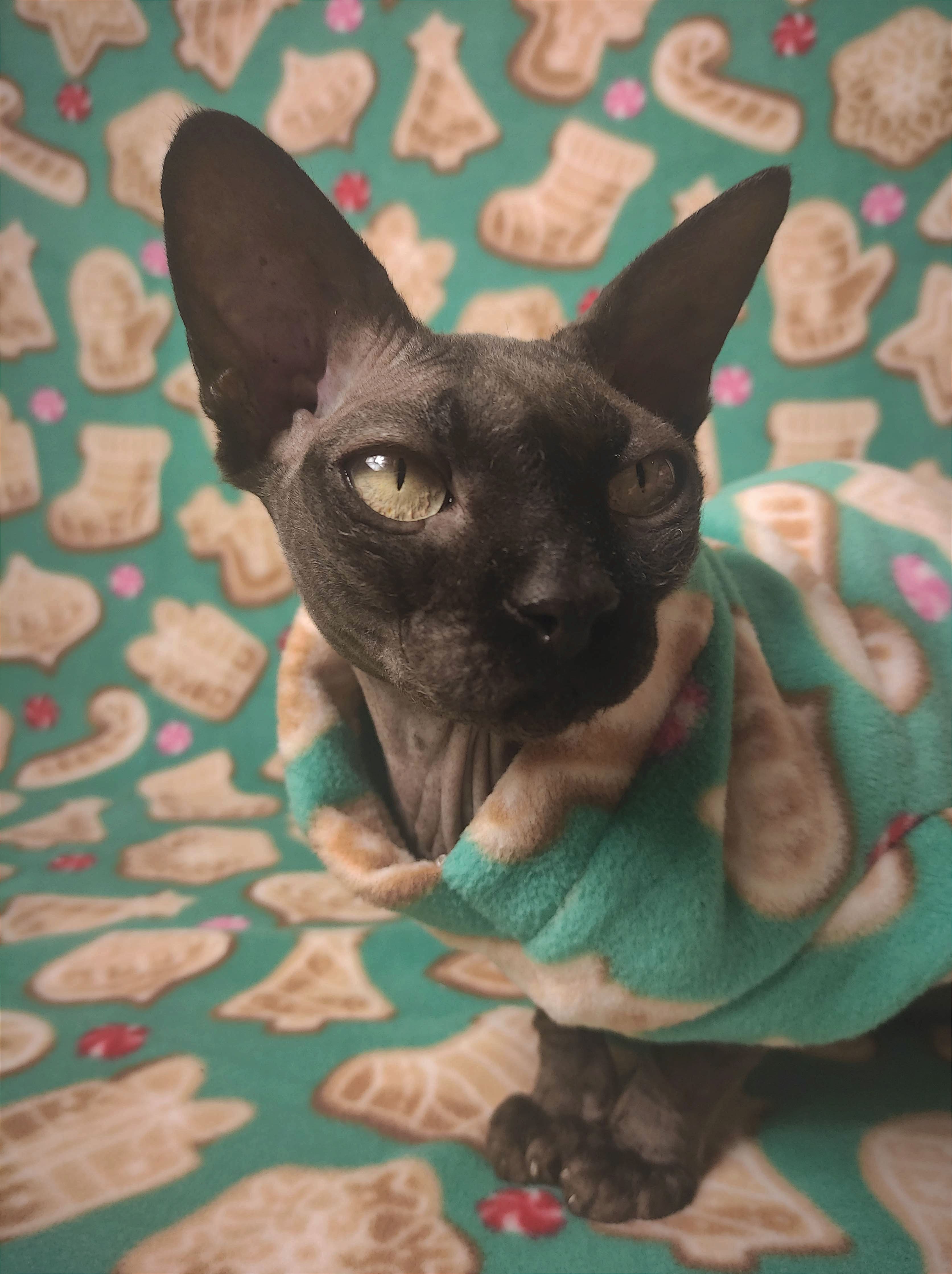 REGULAR size is for most adult hairless cats age 1 to 18. BAMBINO size fits hairless kittens age 6 months to 1 year and smaller adult cats. ANKLE BITER size fits hairless kittens 15 week to 6 month olds. LIL NIPPER size fits hairless kittens age 8 weeks to 15 week olds for when they are with the breeder or for the trip home. Custom orders are welcome for larger and smaller cats - pricing is the same - $27.50
