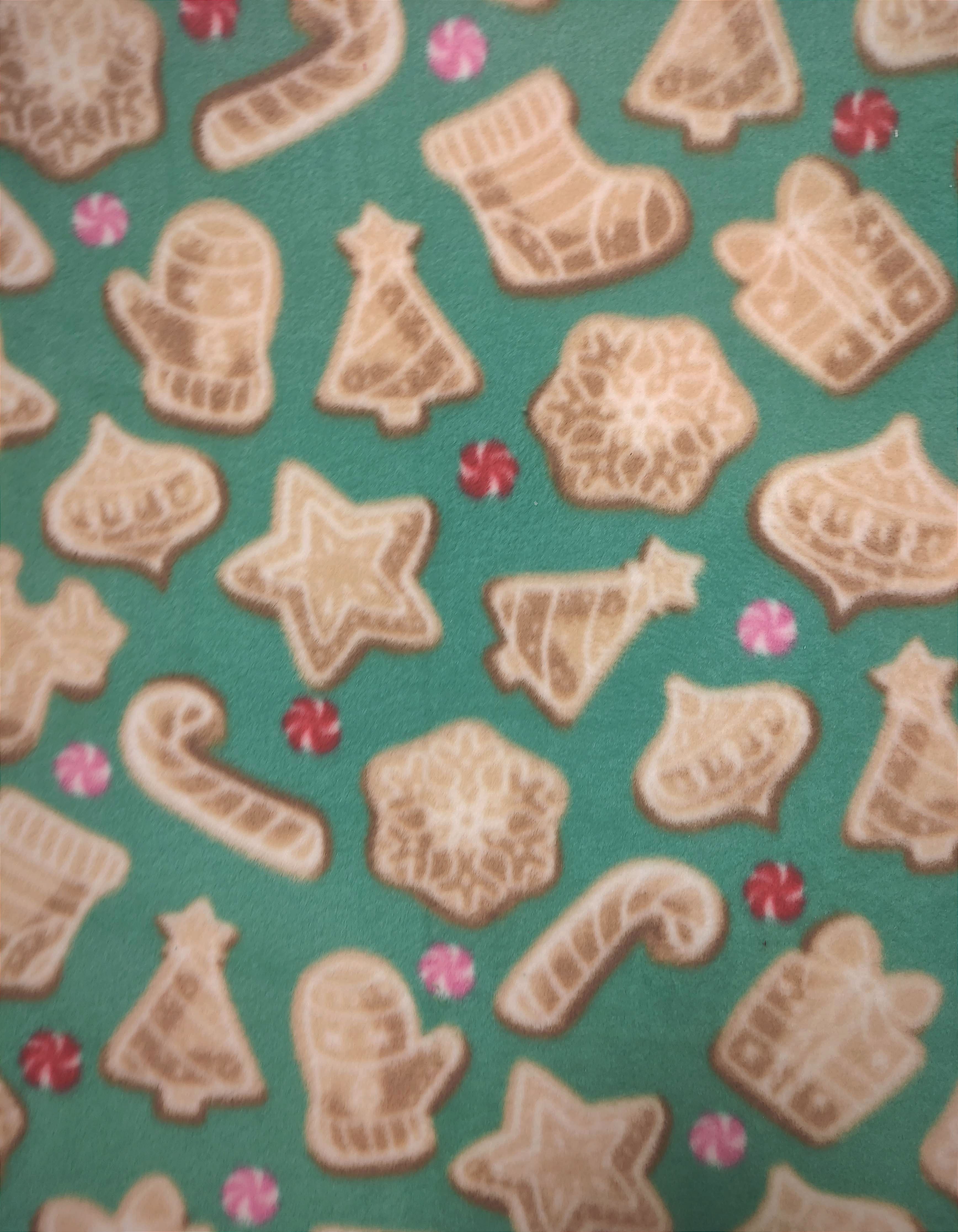 This is a soft stretchy medium weight luxe fleece with Xmas cookies and candy on teal background. Regular Size limited to only 7. Bambino Size limited to only 7, Ankle Biter Size limited to only 2. Lil Nipper Size limited to only 2. No more will be made when they are gone.