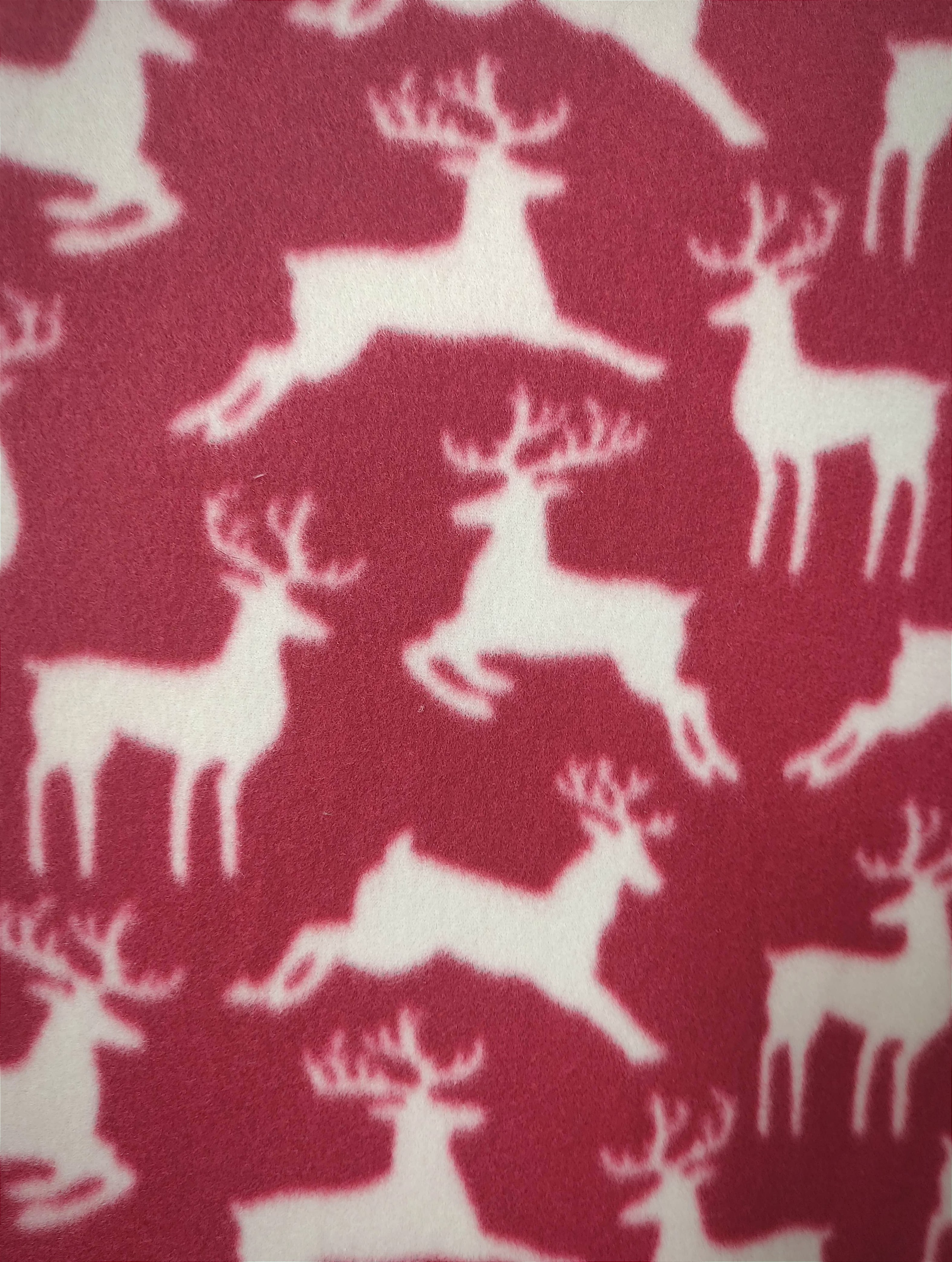 This is a soft stretchy medium weight fleece with deer on red background. Regular Size limited to only 7. Bambino Size limited to only 7, Ankle Biter Size limited to only 2. Lil Nipper Size limited to only 2. No more will be made when they are gone.