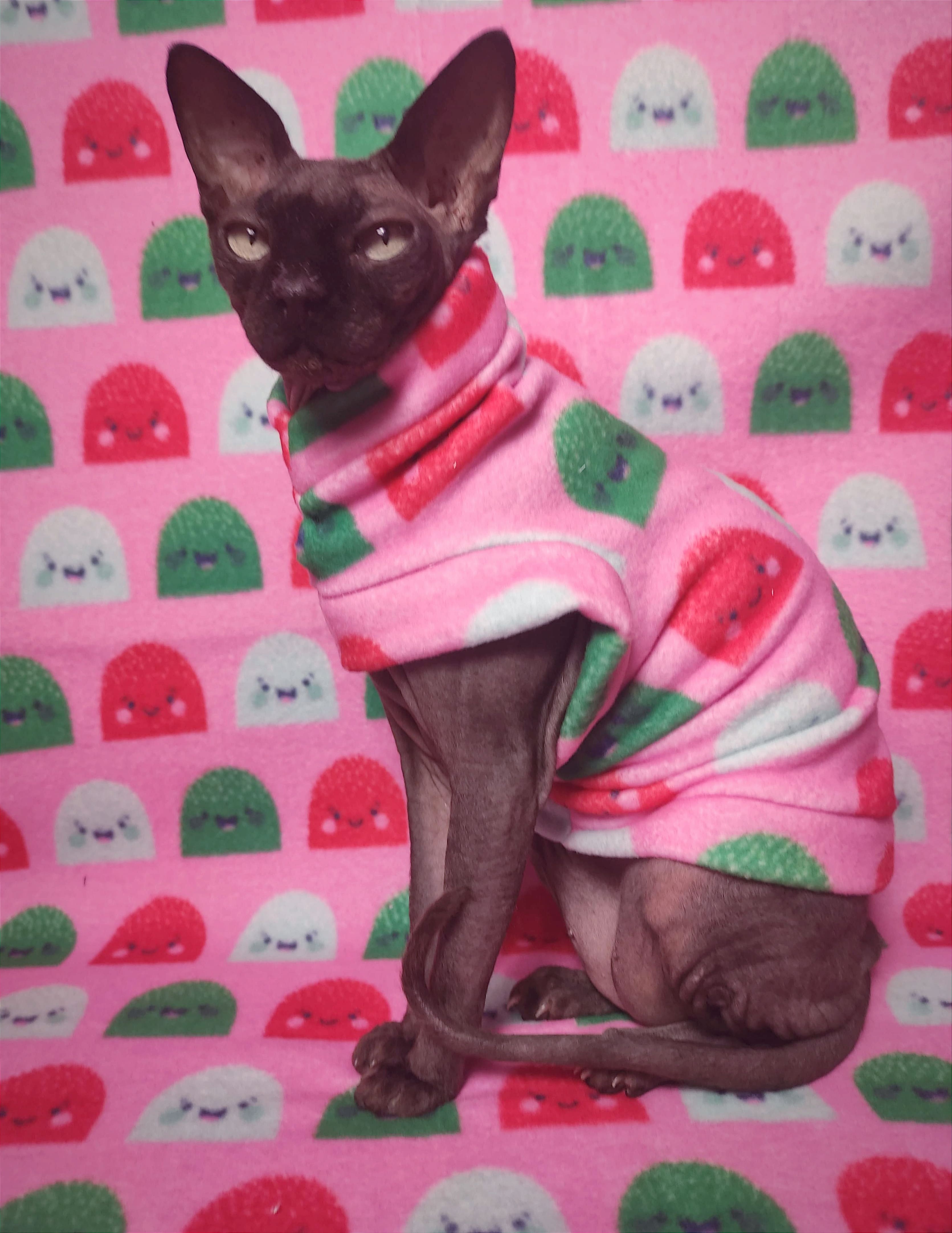 REGULAR size is for most adult hairless cats age 1 to 18. BAMBINO size fits hairless kittens age 6 months to 1 year and smaller adult cats. ANKLE BITER size fits hairless kittens 15 week to 6 month olds. LIL NIPPER size fits hairless kittens age 8 weeks to 15 week olds for when they are with the breeder or for the trip home. Custom orders are welcome for larger and smaller cats - pricing is the same - $27.50
