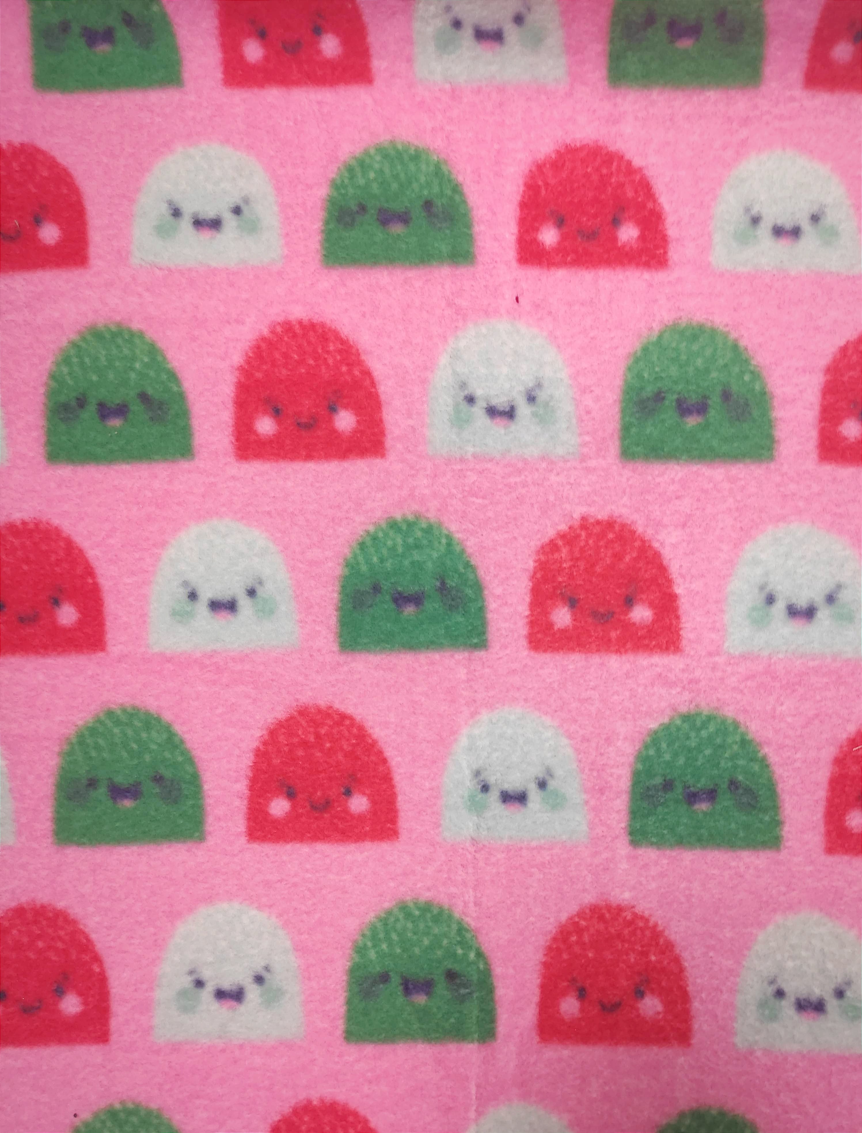 This is a soft stretchy lightweight fleece with green and red smiling juju bees on pink background. Regular Size limited to only 7. Bambino Size limited to only 7, Ankle Biter Size limited to only 2. Lil Nipper Size limited to only 2. No more will be made when they are gone.