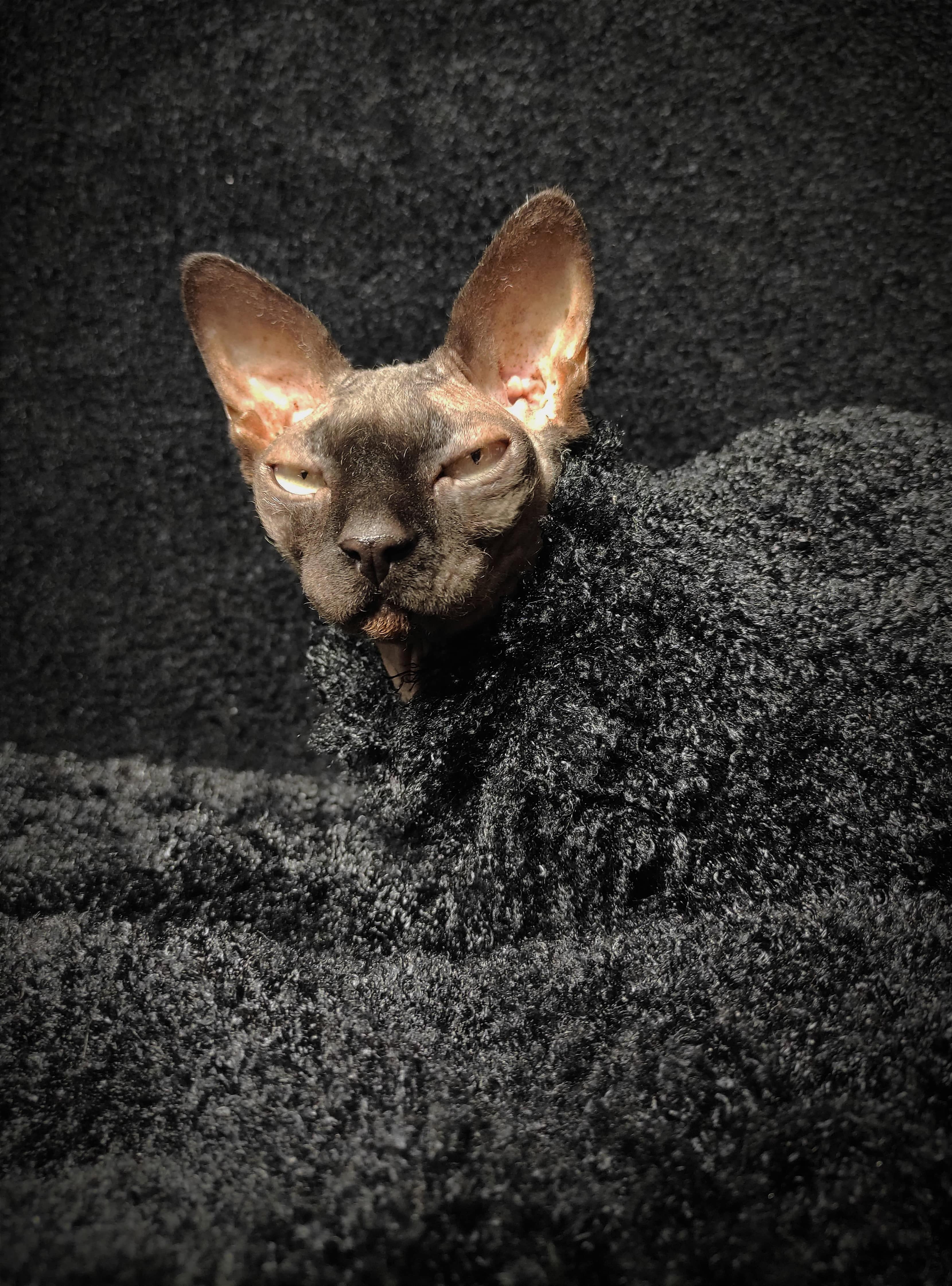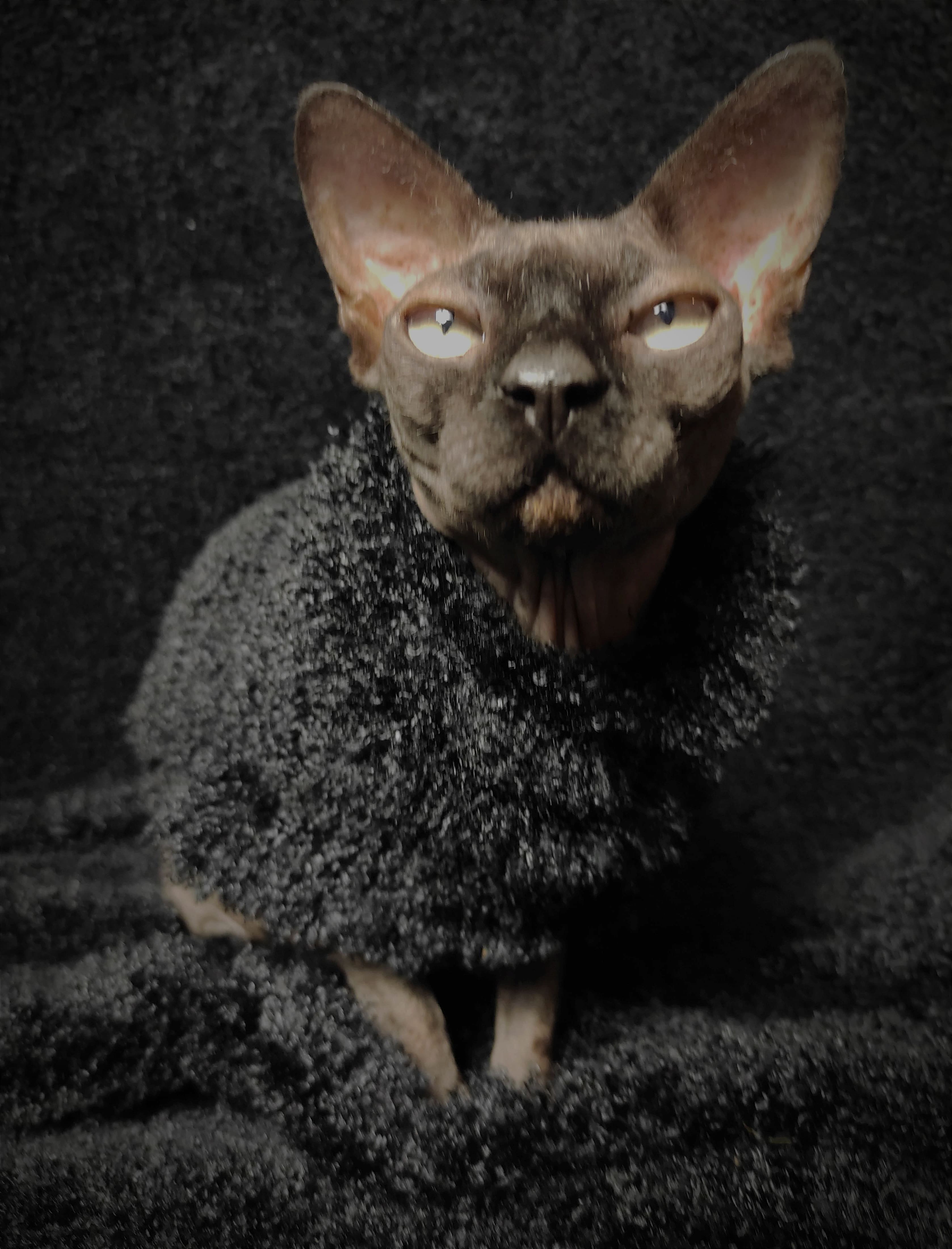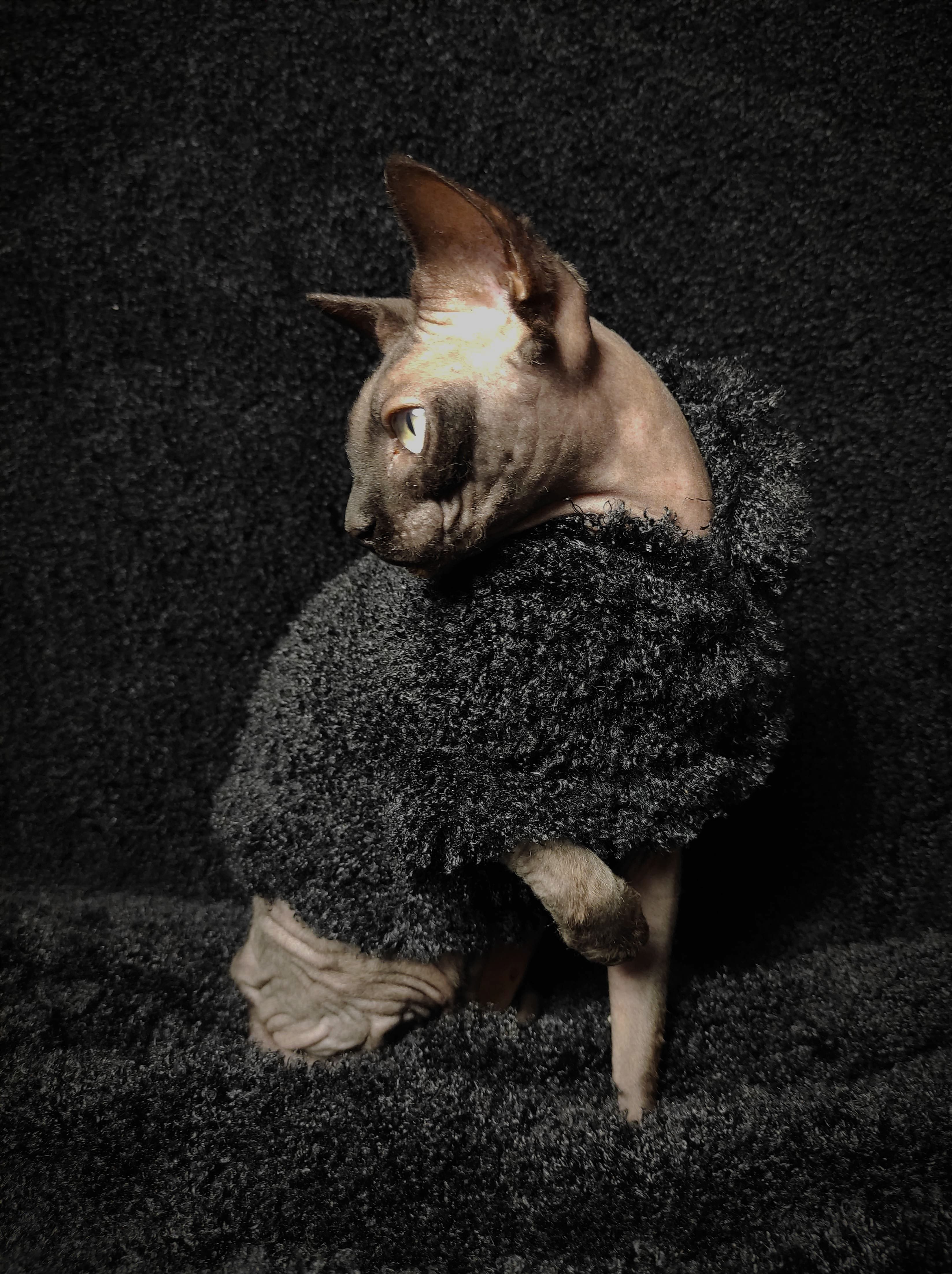 This is an Limited Edition cat shirt / sweater for your hairless Sphynx / Devon Rex / Cornish Rex / Peterbald, and even for some of our stylish furry friends. This is a stretchy jet black fluffy faux fur fabric. Regular Size limited to only 7, Bambino Size is limited to only 7. Ankle Biter Size limited to 2. No more will be made when they are gone.