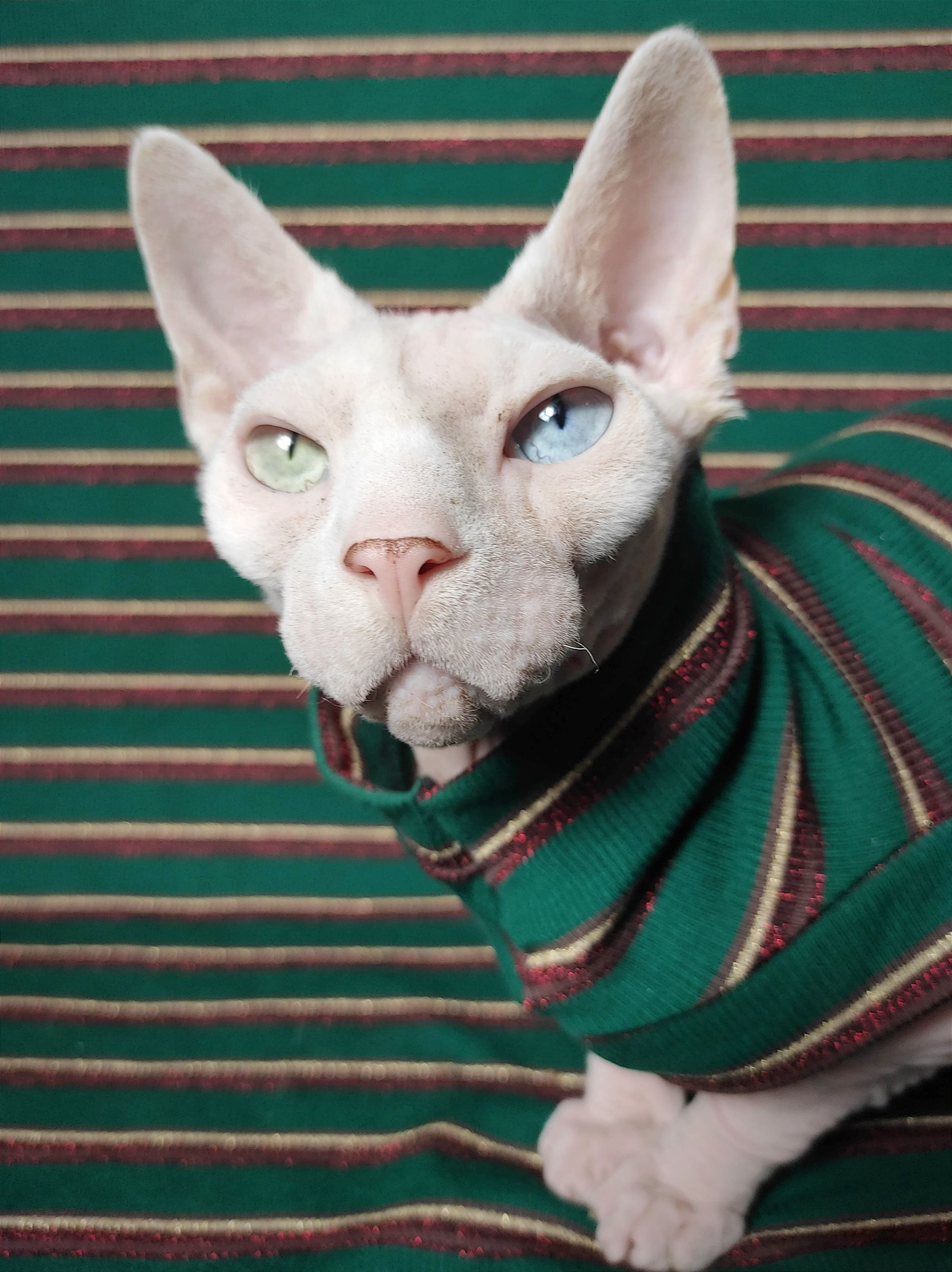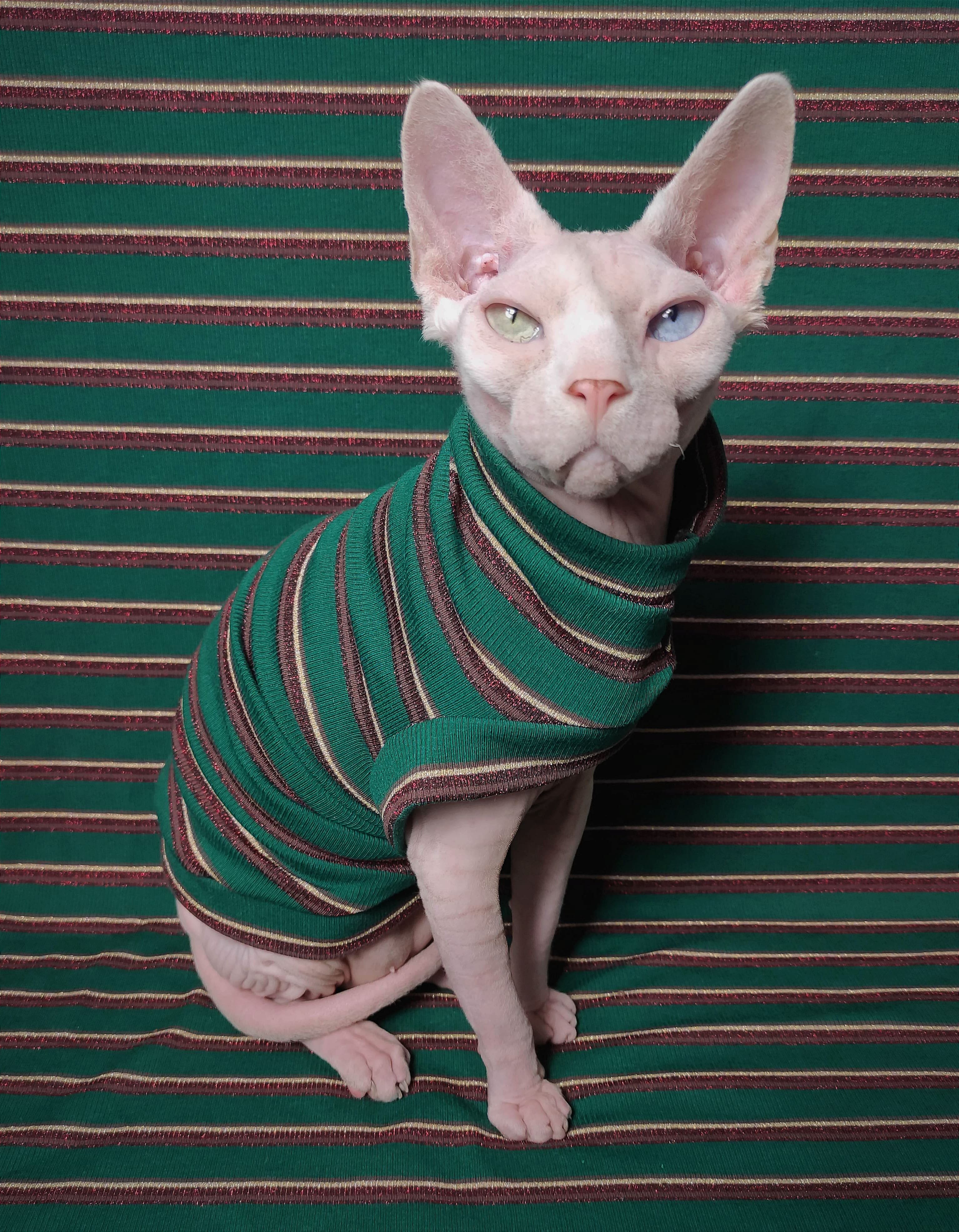 REGULAR size is for most adult hairless cats age 1 to 18. BAMBINO size fits hairless kittens age 6 months to 1 year and smaller adult cats. ANKLE BITER size fits kittens 15 weeks to 6 month olds. LIL NIPPER size fits hairless kittens age 8 weeks to 15 week olds for when they are with the breeder or for the trip home. Custom orders are welcome for larger and smaller cats - pricing is the same - $27.50