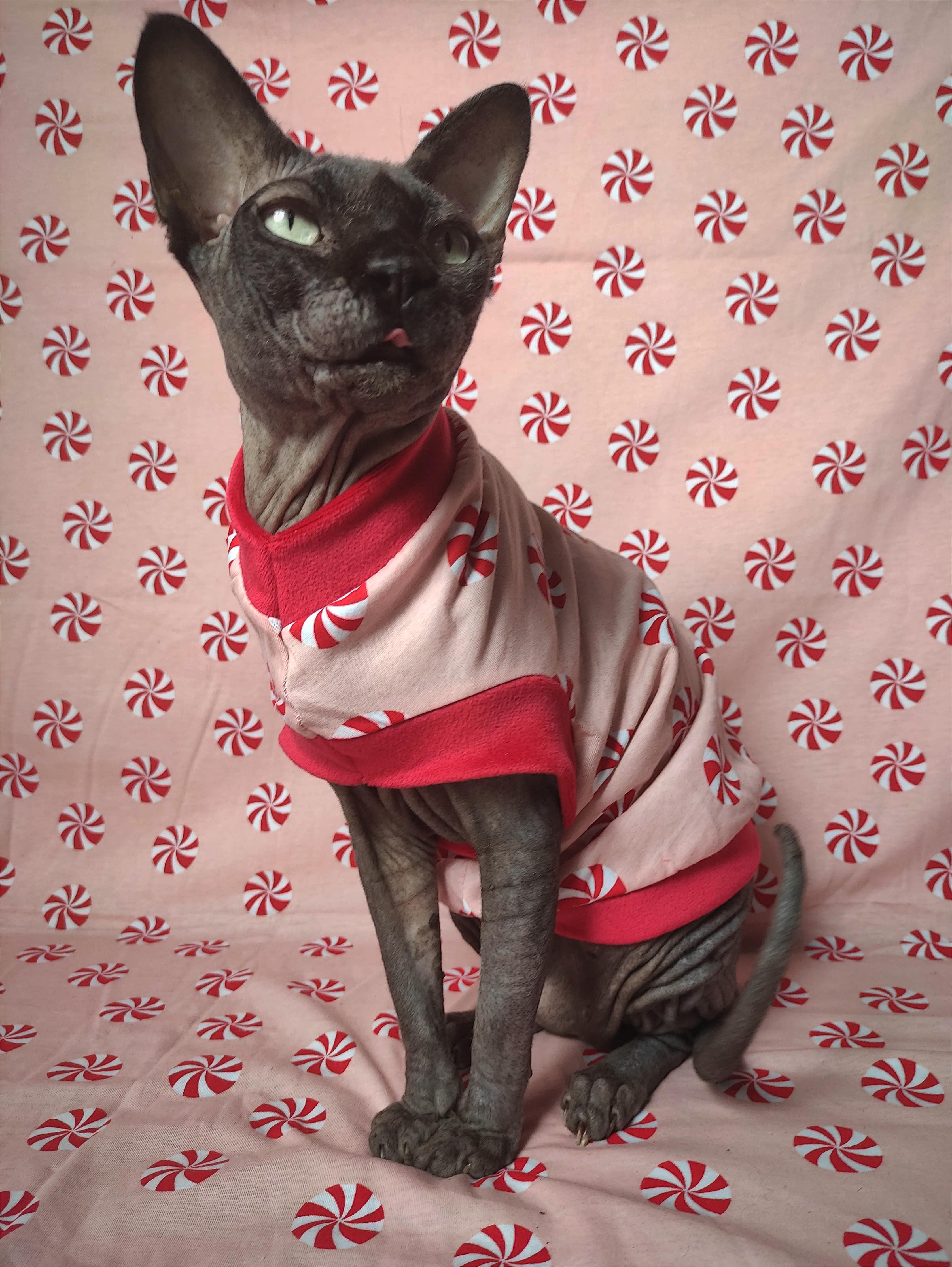 REGULAR size is for most adult hairless cats age 1 to 18. BAMBINO size fits hairless kittens age 6 months to 1 year and smaller adult cats. ANKLE BITER size fits kittens 15 weeks to 6 month olds. LIL NIPPER size fits hairless kittens age 8 weeks to 15 week olds for when they are with the breeder or for the trip home. Custom orders are welcome for larger and smaller cats - pricing is the same - $27.50
