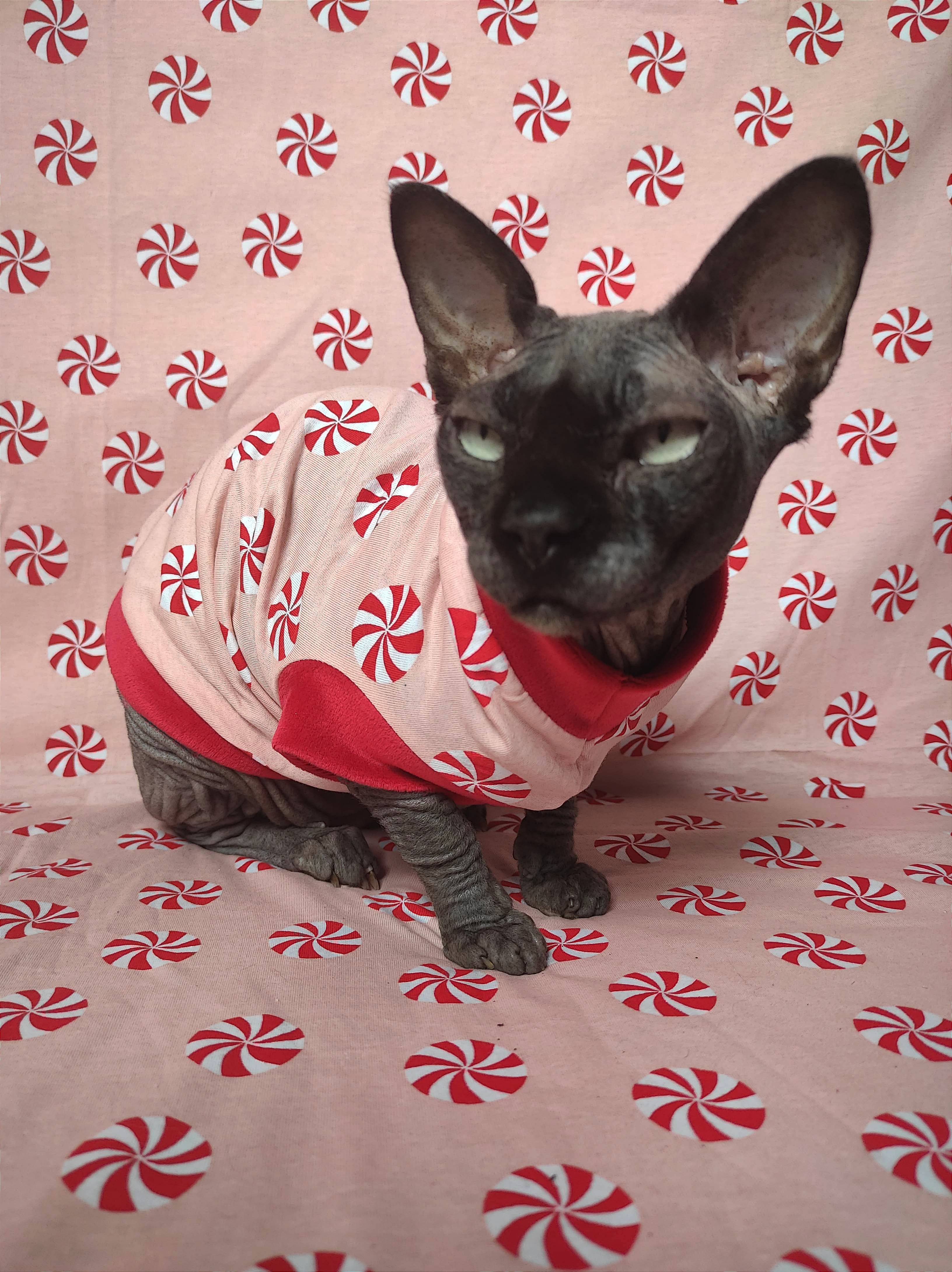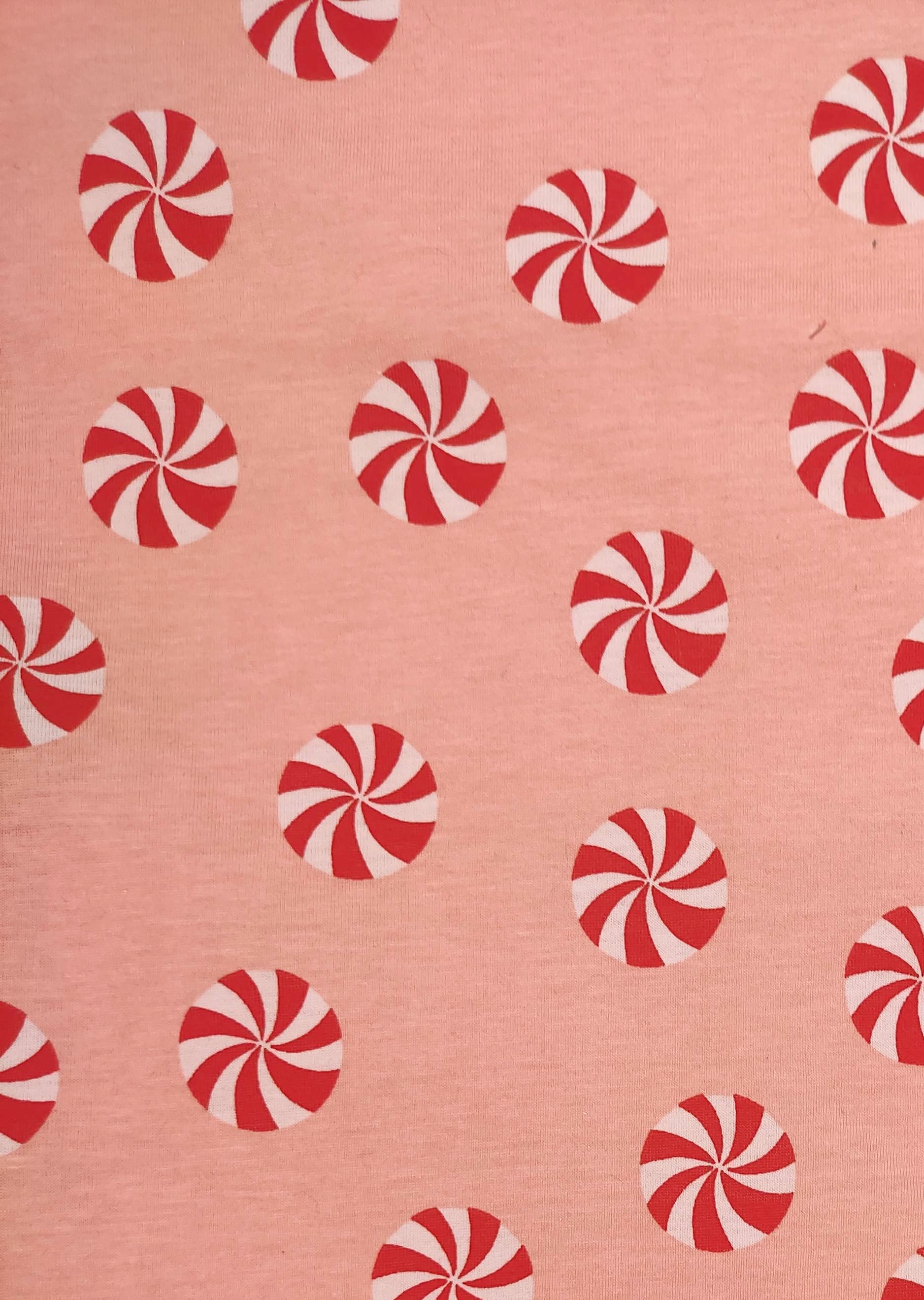 This is a stretchy lightweight cotton fabric printed with pinwheel candy on pink background, trimmed with red velvet. Regular Size limited to only 9. Bambino Size is limited to only 7, Ankle Biter Size is limited to 2, Lil Nipper Size is limited to 2. No more will be made when they are gone.