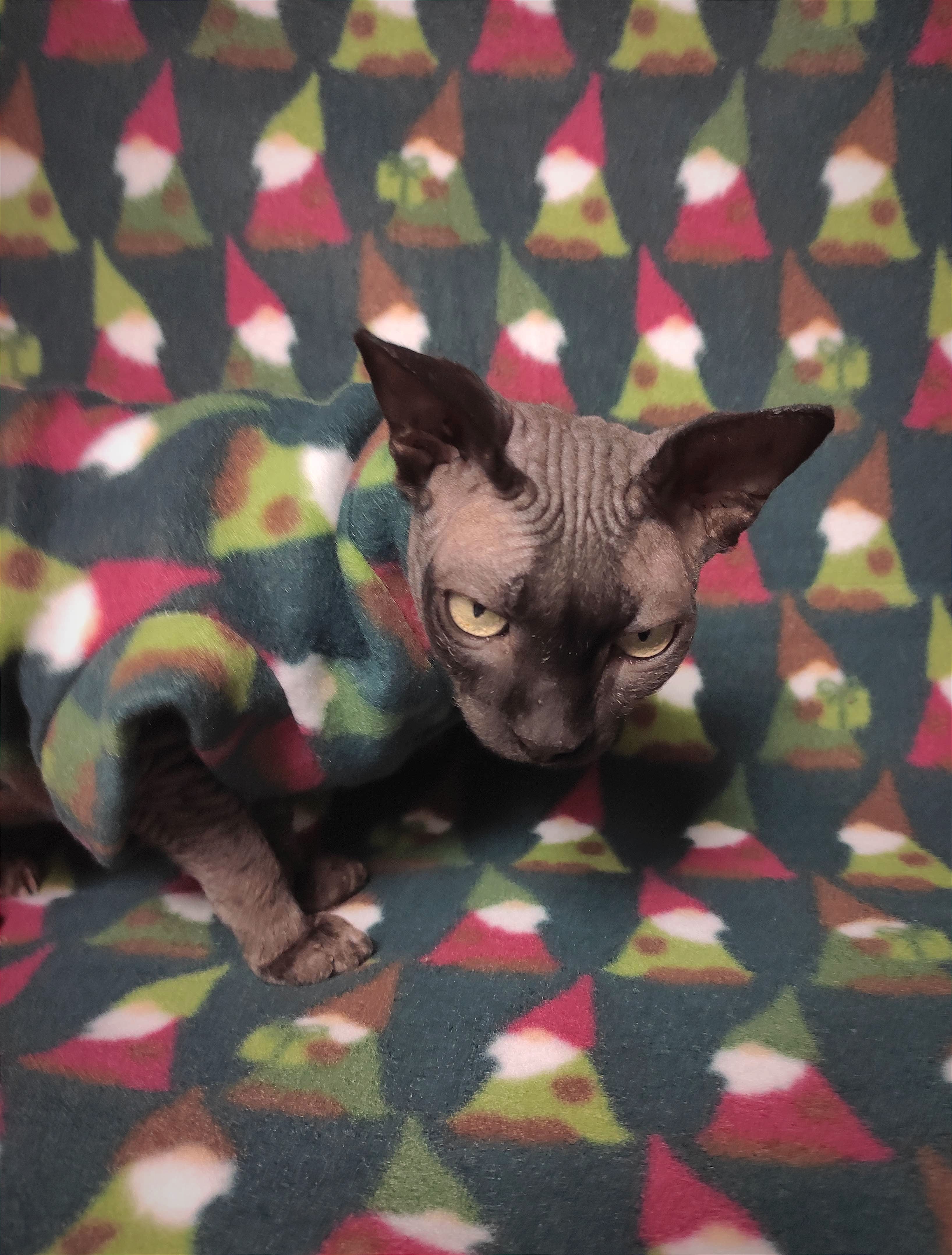 REGULAR size is for most adult hairless cats age 1 to 18. BAMBINO size fits hairless kittens age 6 months to 1 year and smaller adult cats. ANKLE BITER size fits hairless kittens 15 week to 6 month olds. LIL NIPPER size fits hairless kittens age 8 weeks to 15 week olds for when they are with the breeder or for the trip home. Custom orders are welcome for larger and smaller cats - pricing is the same - $27.50
