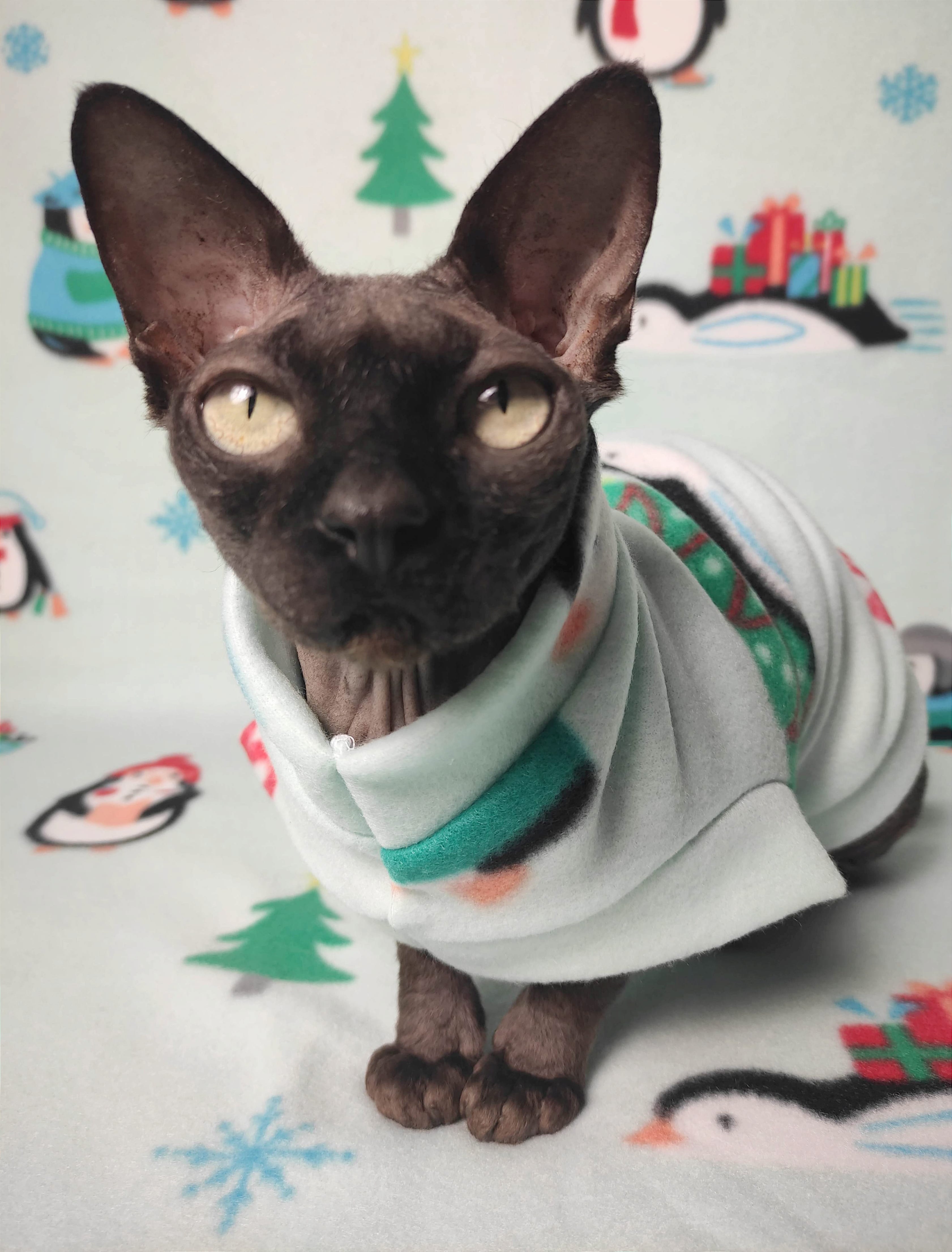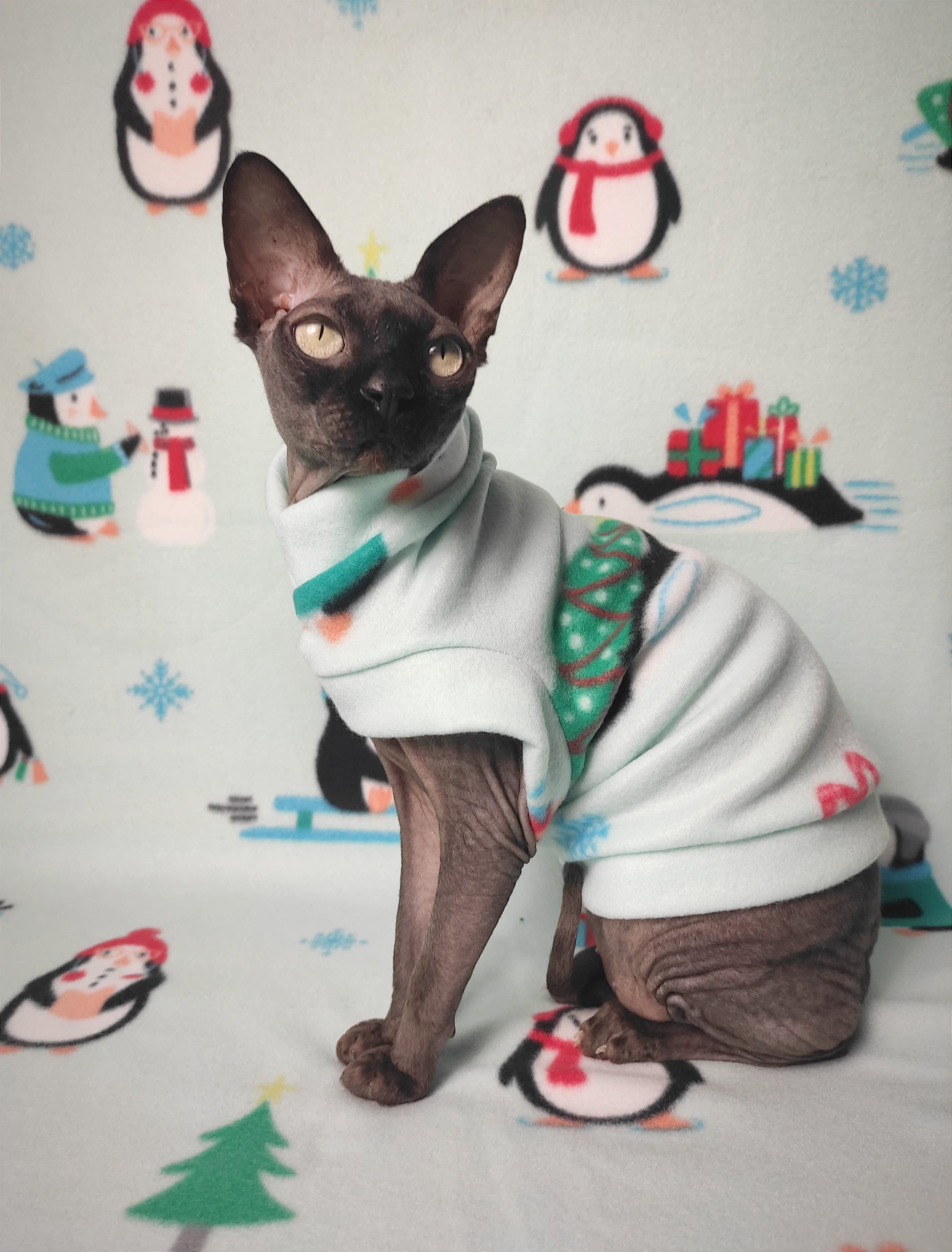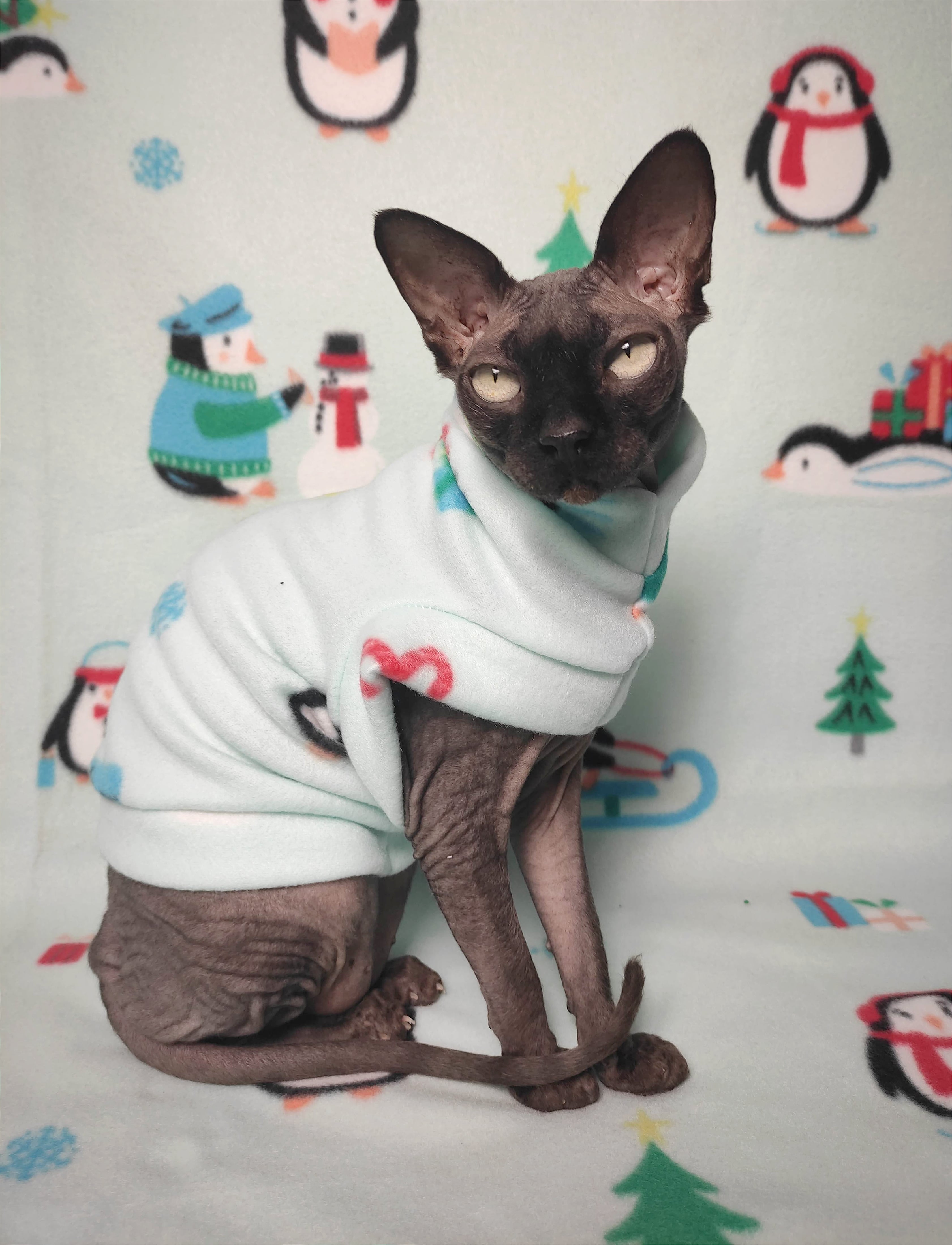REGULAR size is for most adult hairless cats age 1 to 18. BAMBINO size fits hairless kittens age 6 months to 1 year and smaller adult cats. ANKLE BITER size fits hairless kittens 15 week to 6 month olds. LIL NIPPER size fits hairless kittens age 8 weeks to 15 week olds for when they are with the breeder or for the trip home. Custom orders are welcome for larger and smaller cats - pricing is the same - $27.50