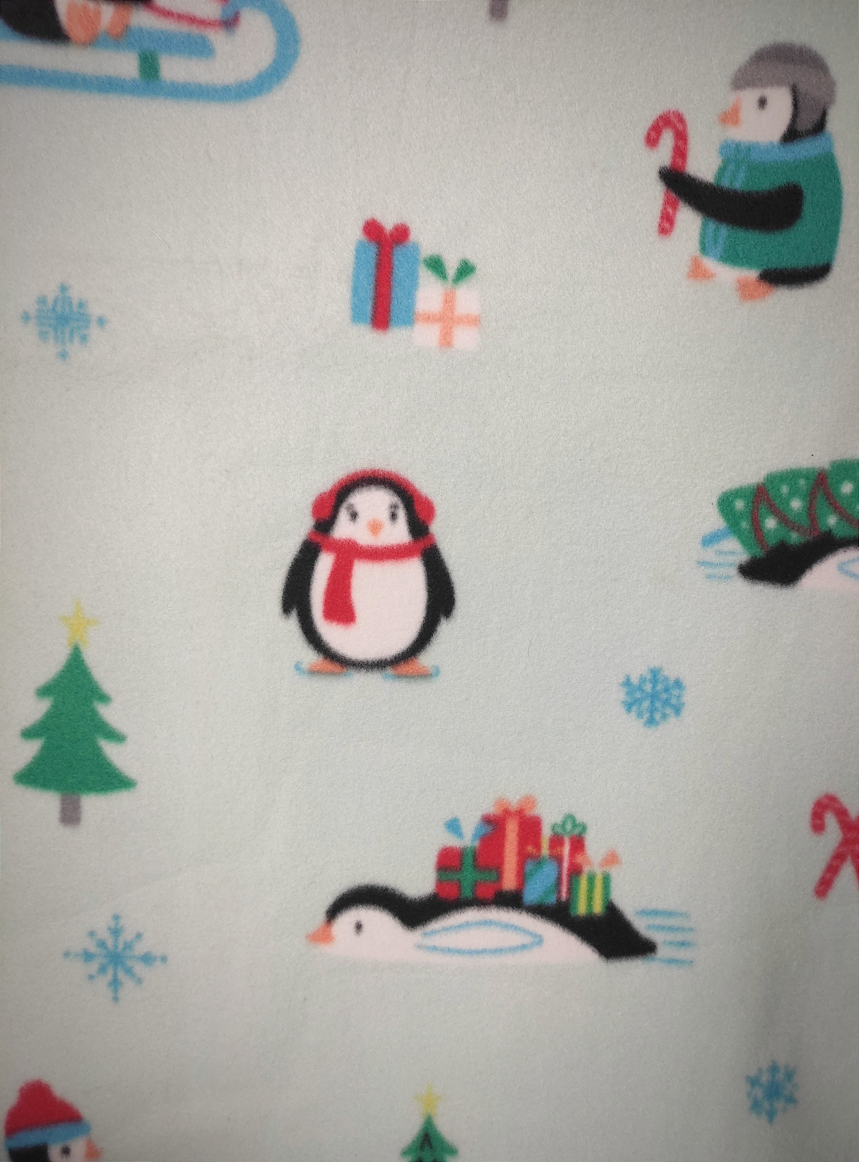 This is a soft stretchy medium weight fleece with penguins doing holiday things on light blue background. Regular Size limited to only 7. Bambino Size limited to only 7, Ankle Biter Size limited to only 2. Lil Nipper Size limited to only 2. No more will be made when they are gone.