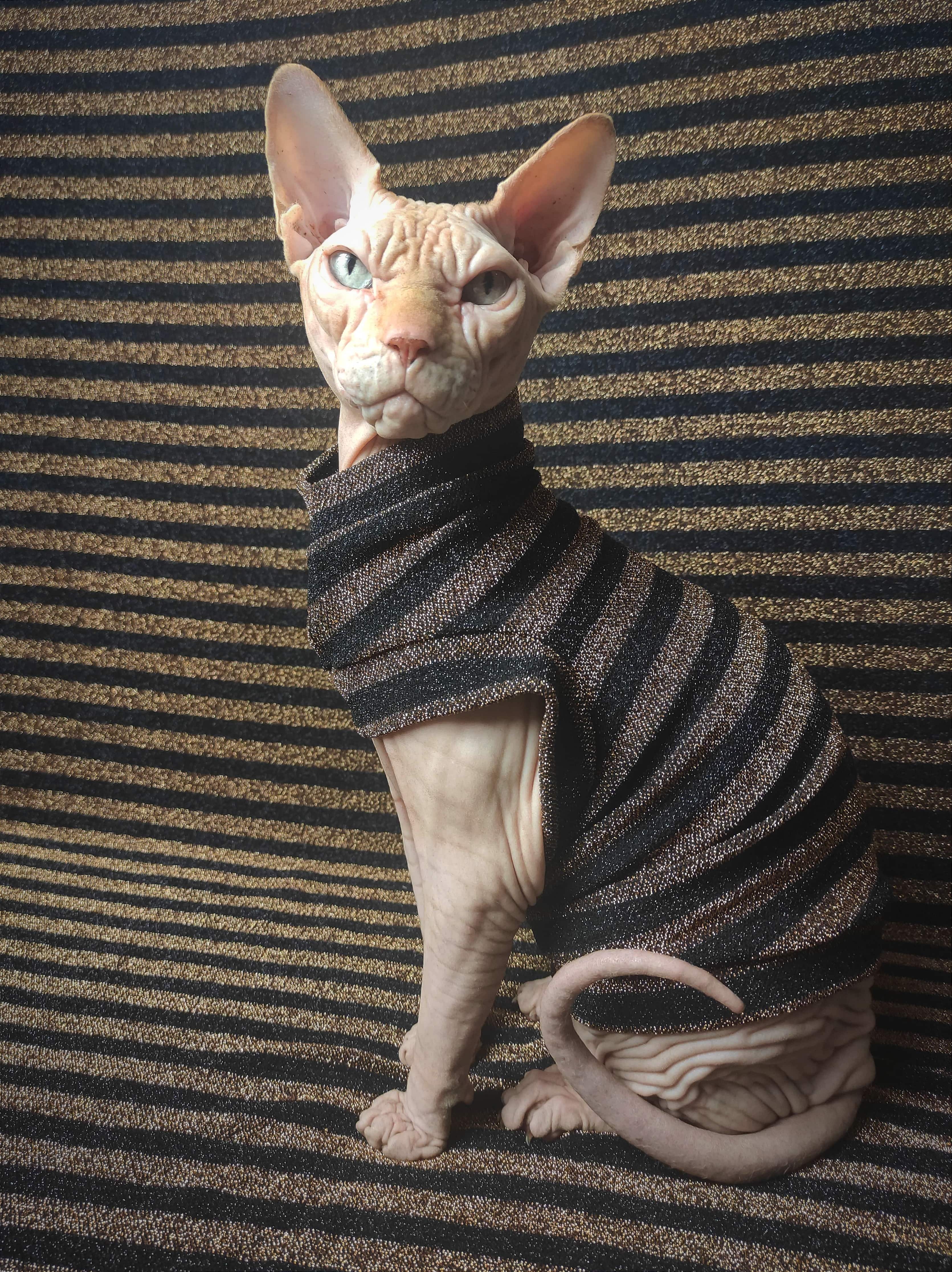 REGULAR size is for most adult hairless cats age 1 to 18. BAMBINO size fits hairless kittens age 6 months to 1 year and smaller adult cats. ANKLE BITER size fits hairless kittens 15 week to 6 month olds. LIL NIPPER size fits hairless kittens age 8 weeks to 15 week olds for when they are with the breeder or for the trip home. Custom orders are welcome for larger and smaller cats - pricing is the same - $27.50