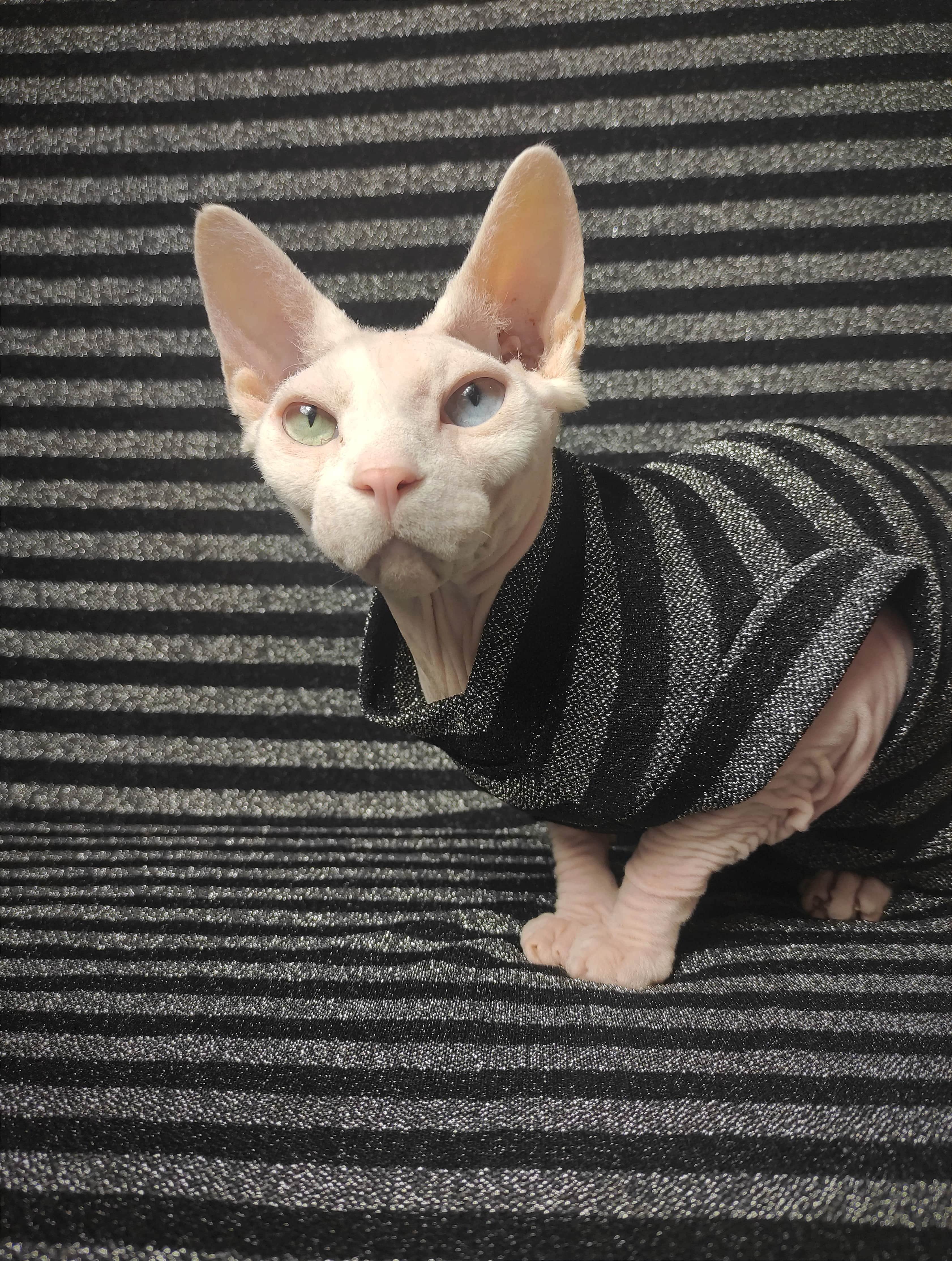 REGULAR size is for most adult hairless cats age 1 to 18. BAMBINO size fits hairless kittens age 6 months to 1 year and smaller adult cats. ANKLE BITER size fits hairless kittens 15 week to 6 month olds. LIL NIPPER size fits hairless kittens age 8 weeks to 15 week olds for when they are with the breeder or for the trip home. Custom orders are welcome for larger and smaller cats - pricing is the same - $27.50