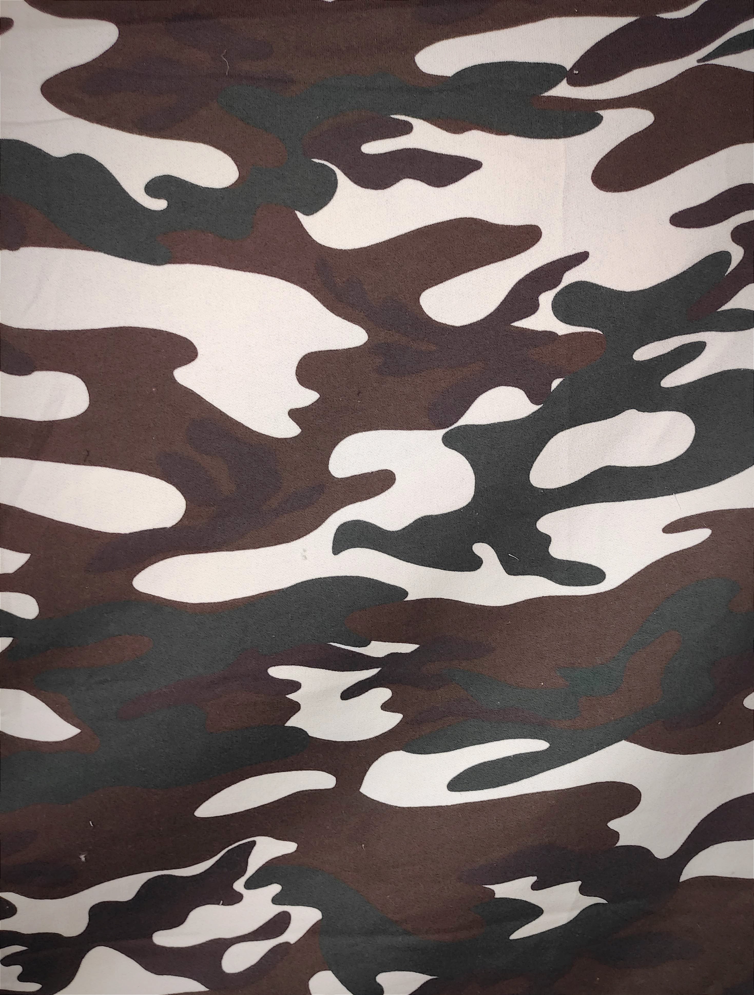 This is a soft heavyweight white, green,brown and black sweatshirt fleece fabric with fuzzy interior and minimal stretch. Regular Size limited to only 8, Bambino Size is limited to only 8, Ankle Biter Size is limited to 2, Lil Nipper Size is limited to 2. No more will be made when they are gone.