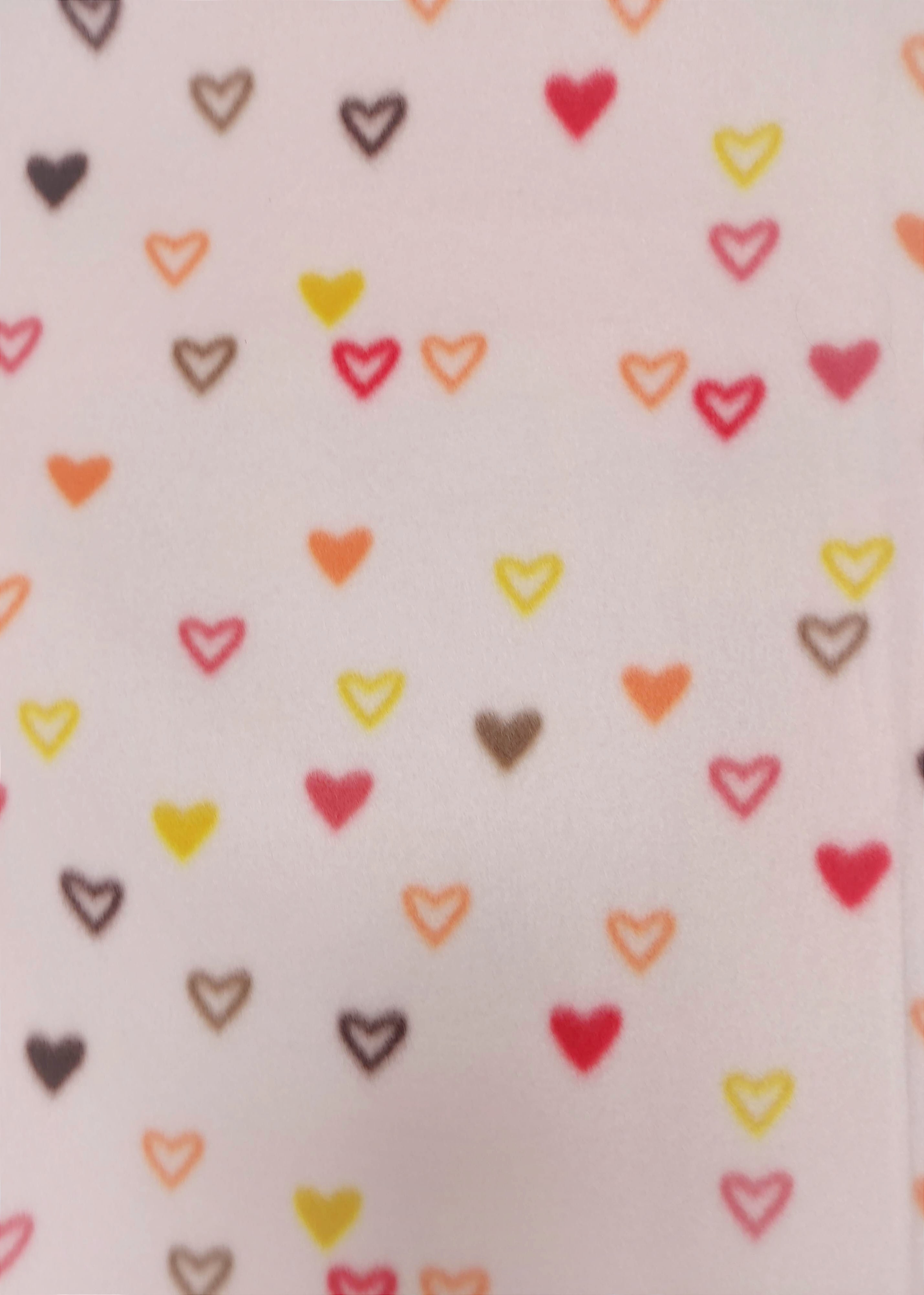 This is a soft medium weight stretchy fleece with various colored hearts with on white background with red fleece trim😻