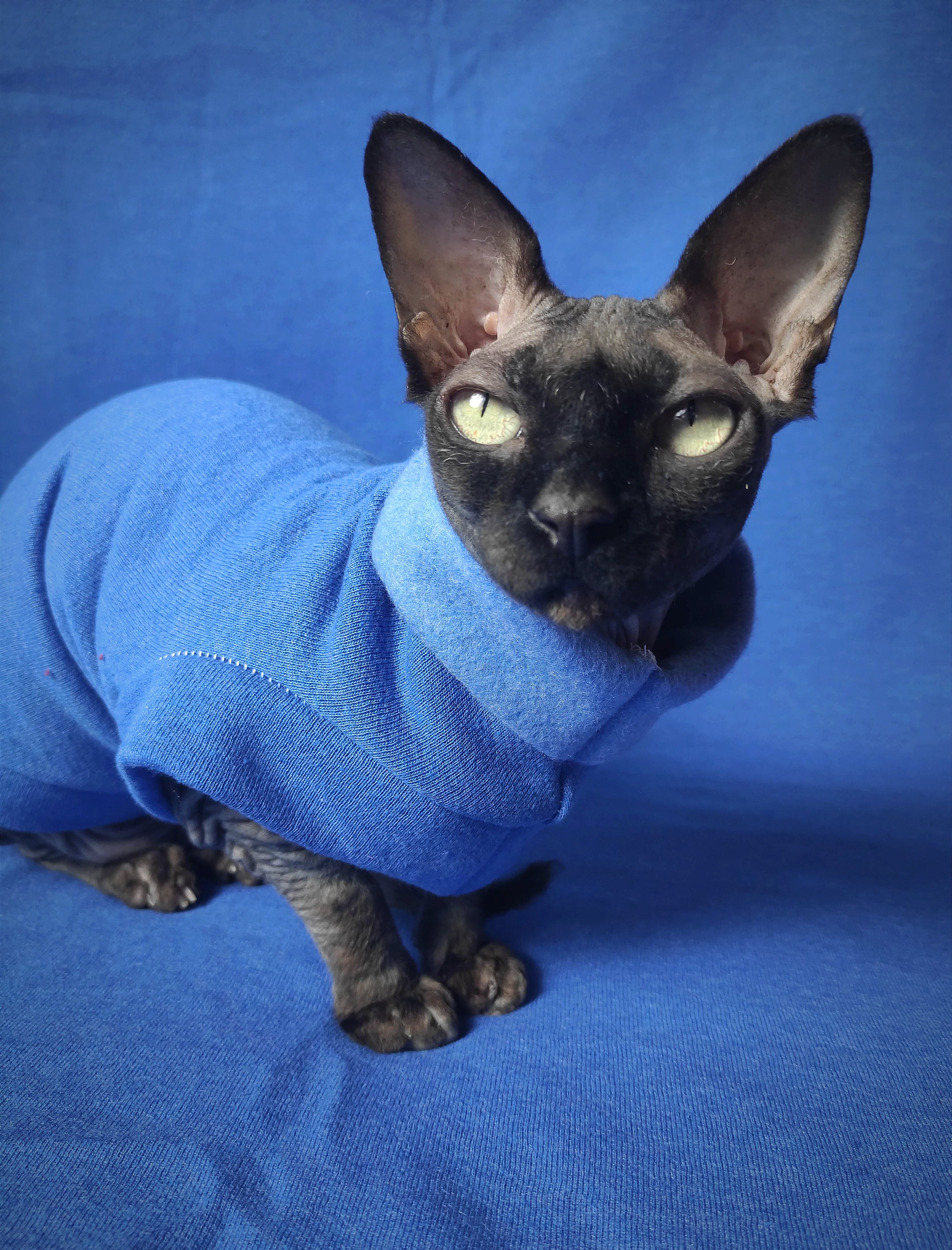REGULAR size is for most adult hairless cats age 1 to 18. BAMBINO size fits hairless kittens age 6 months to 1 year and smaller adult cats. ANKLE BITER size fits kittens 15 weeks to 6 month olds. LIL NIPPER size fits hairless kittens age 8 weeks to 15 week olds for when they are with the breeder or for the trip home. Custom orders are welcome for larger and smaller cats - pricing is the same - $27.50
