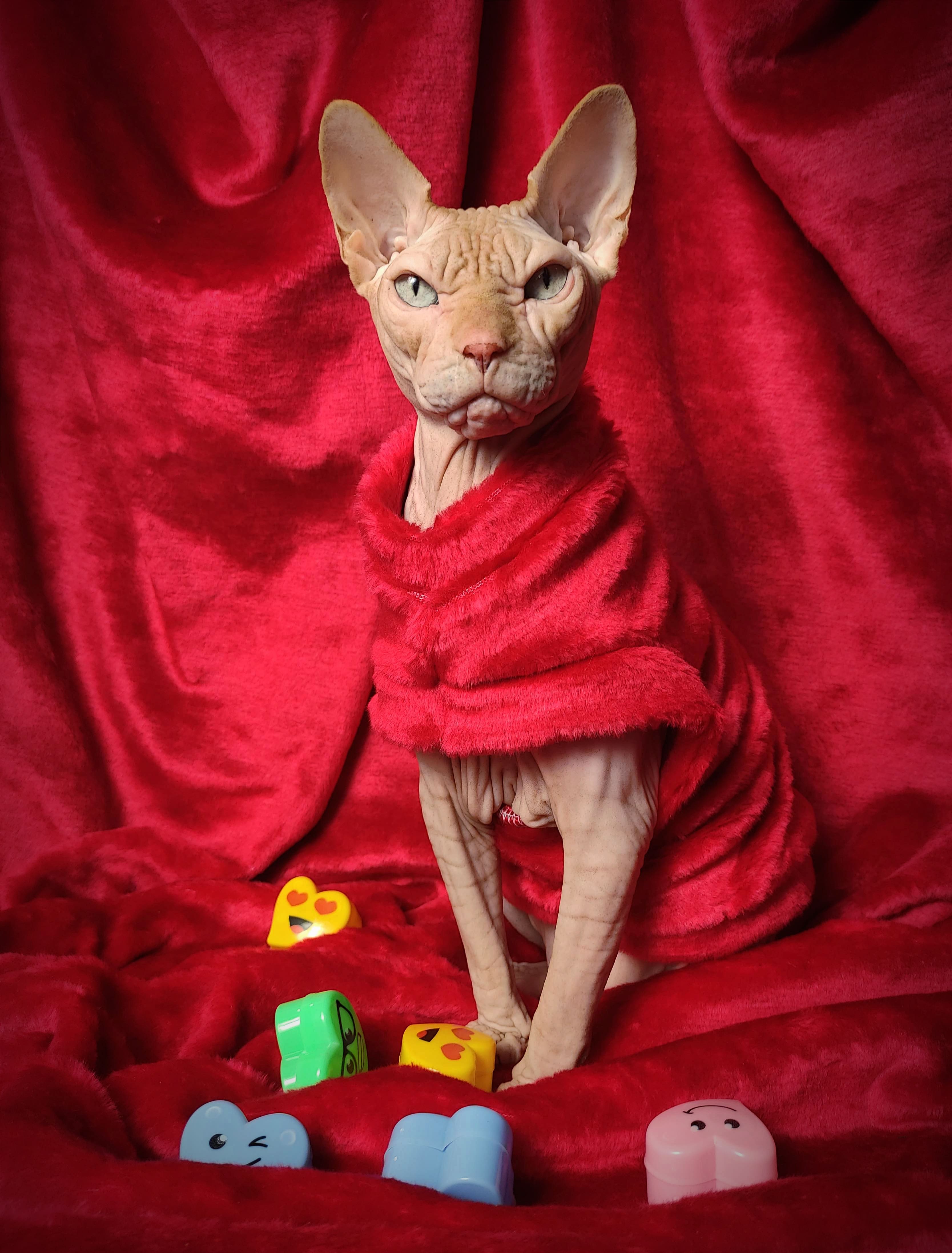 REGULAR size is for most adult hairless cats age 1 to 18. BAMBINO size fits hairless kittens age 6 months to 1 year and smaller adult cats. ANKLE BITER size fits kittens 15 weeks to 6 month olds. LIL NIPPER size fits hairless kittens age 8 weeks to 15 week olds for when they are with the breeder or for the trip home. Custom orders are welcome for larger and smaller cats - pricing is the same - $50