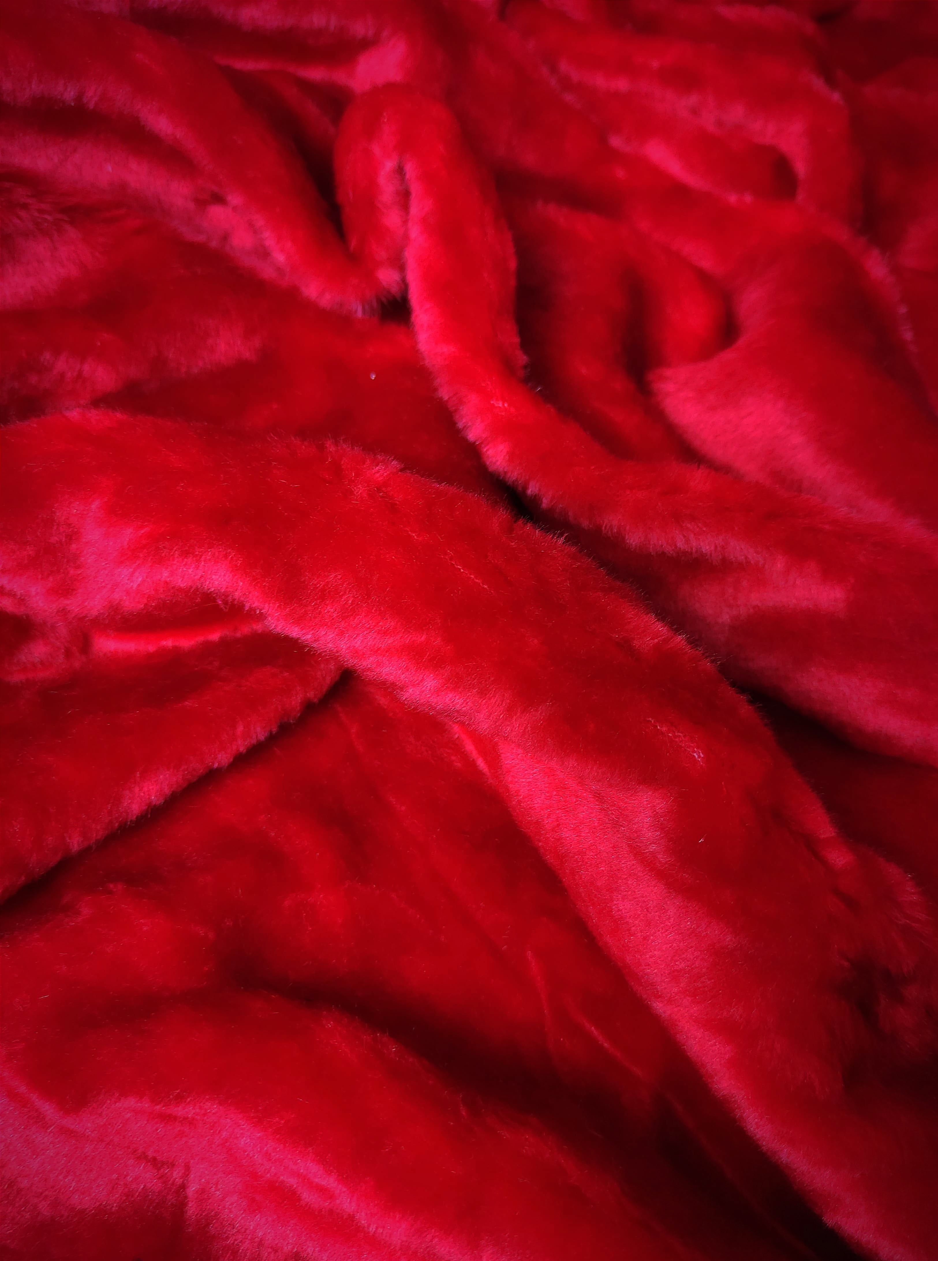 This is a super soft bright red vegan fur with minimal stretch. This sweater should be hand washed and dried flat. No more will be made when they are gone.