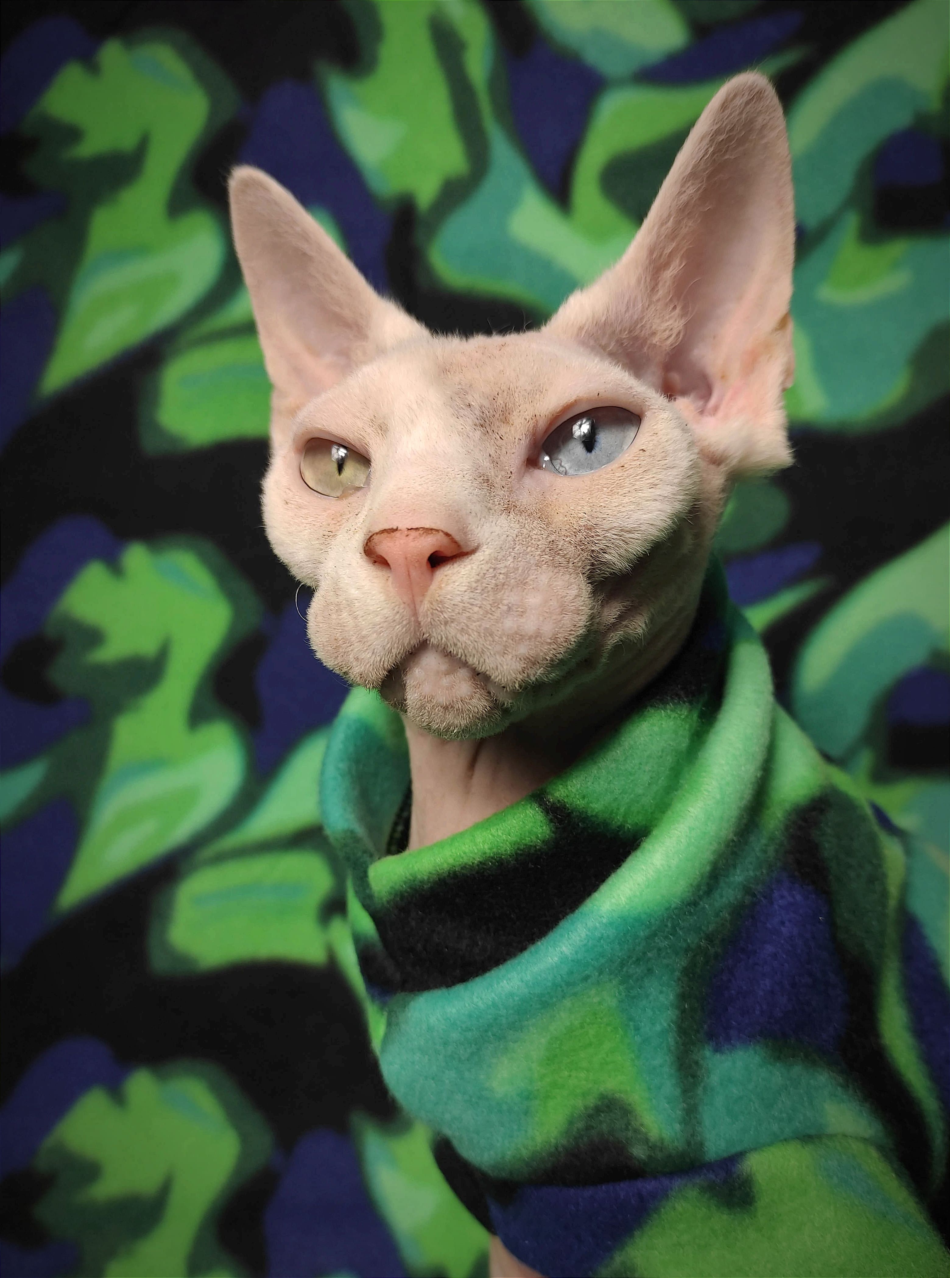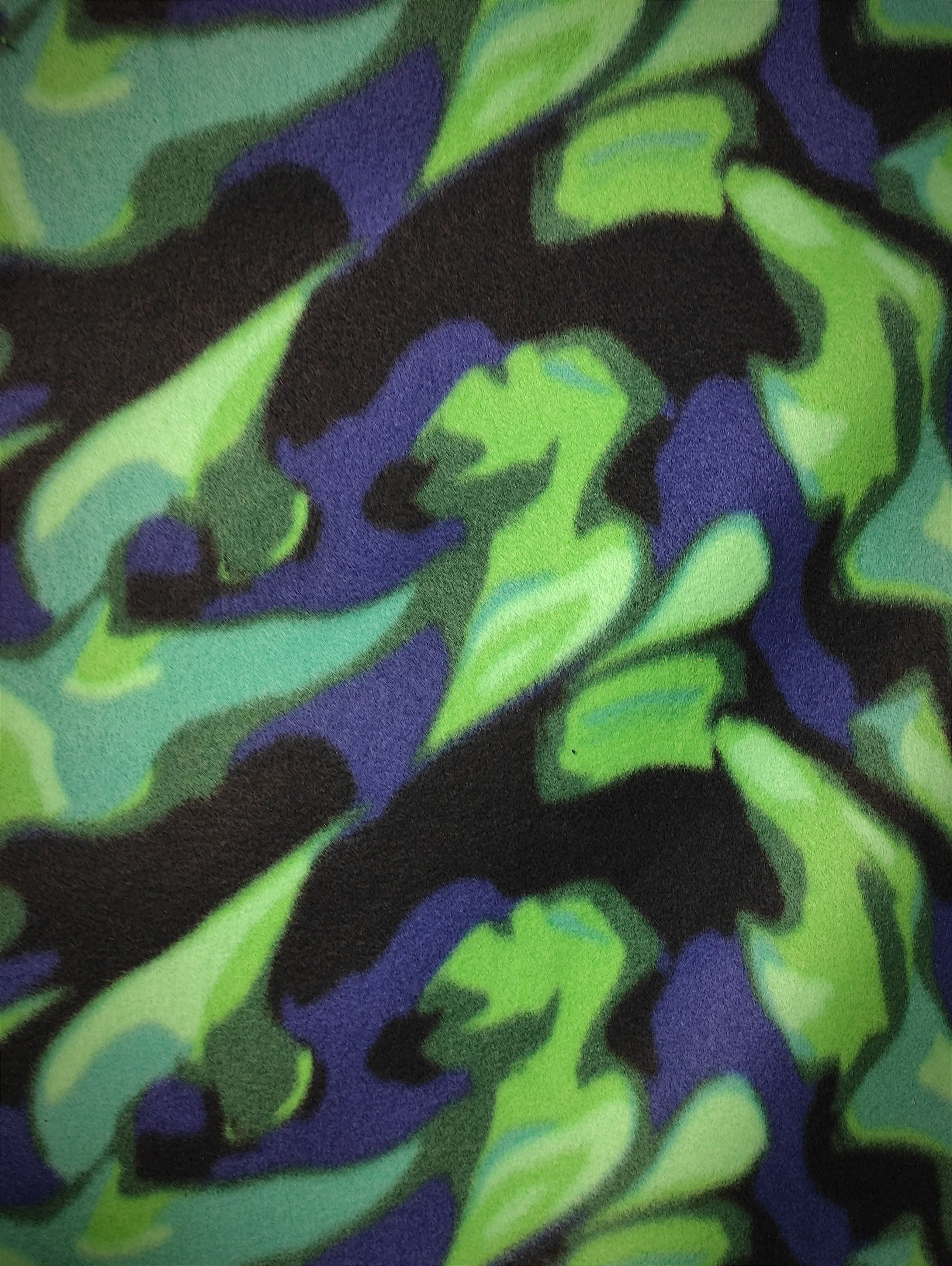 This is a soft medium weight stretchy fleece with black, green and blue abstract design 😻