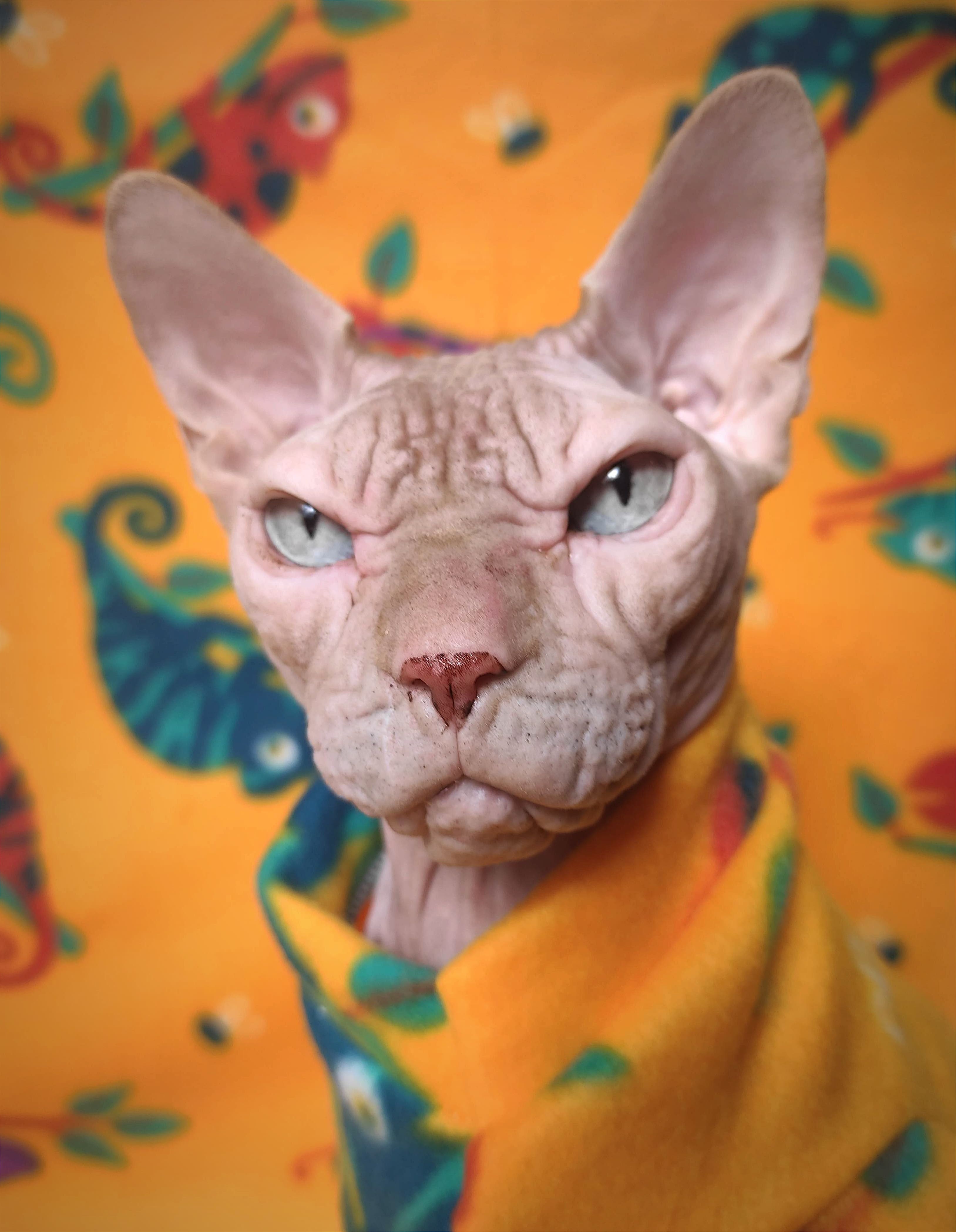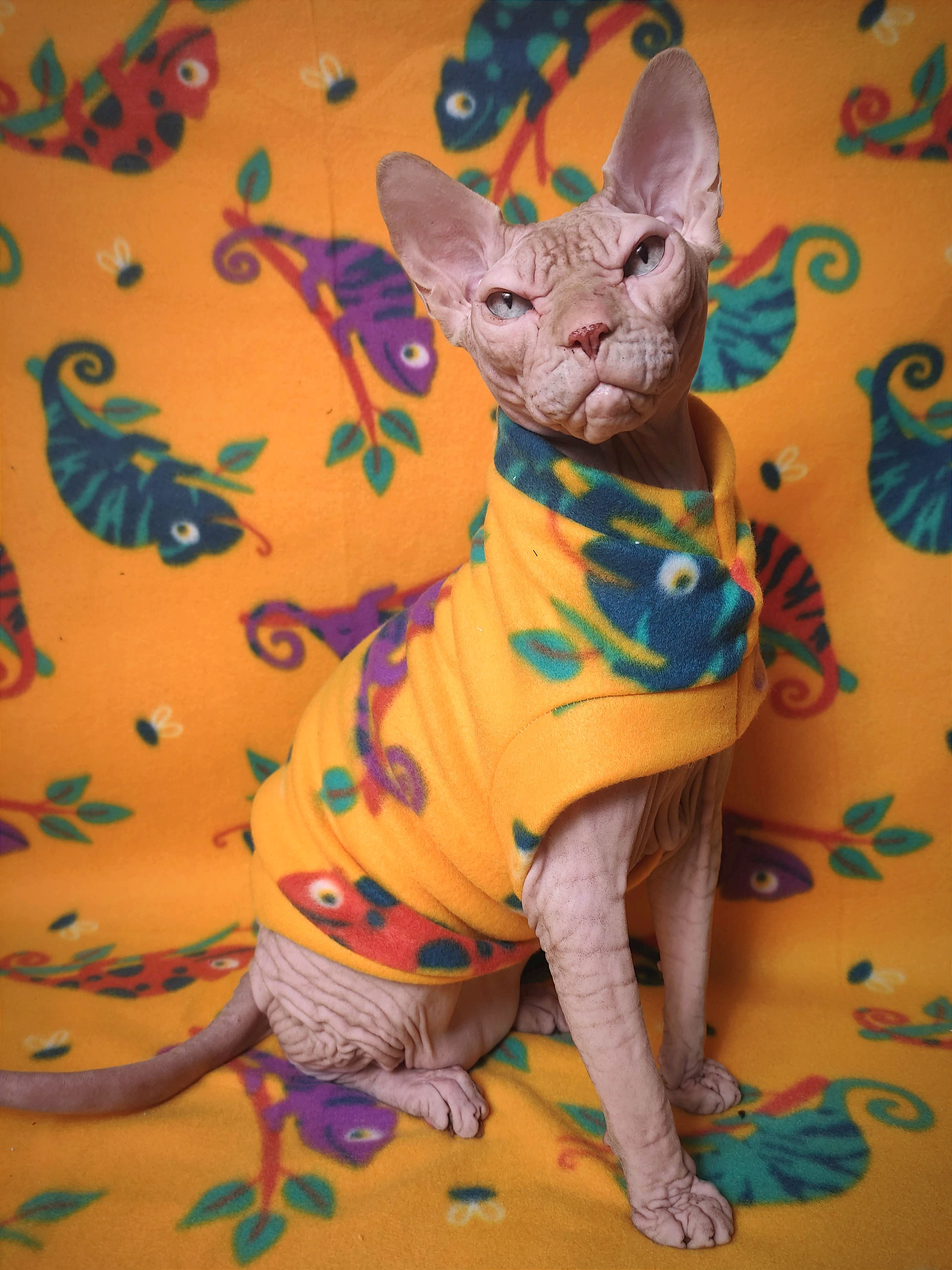 REGULAR size is for most adult hairless cats age 1 to 18. BAMBINO size fits hairless kittens age 6 months to 1 year and smaller adult cats. LIL NIPPER size fits hairless kittens age 8 weeks to 15 week olds for when they are with the breeder or for the trip home. Custom orders are welcome for larger and smaller cats - pricing is the same - $27.50