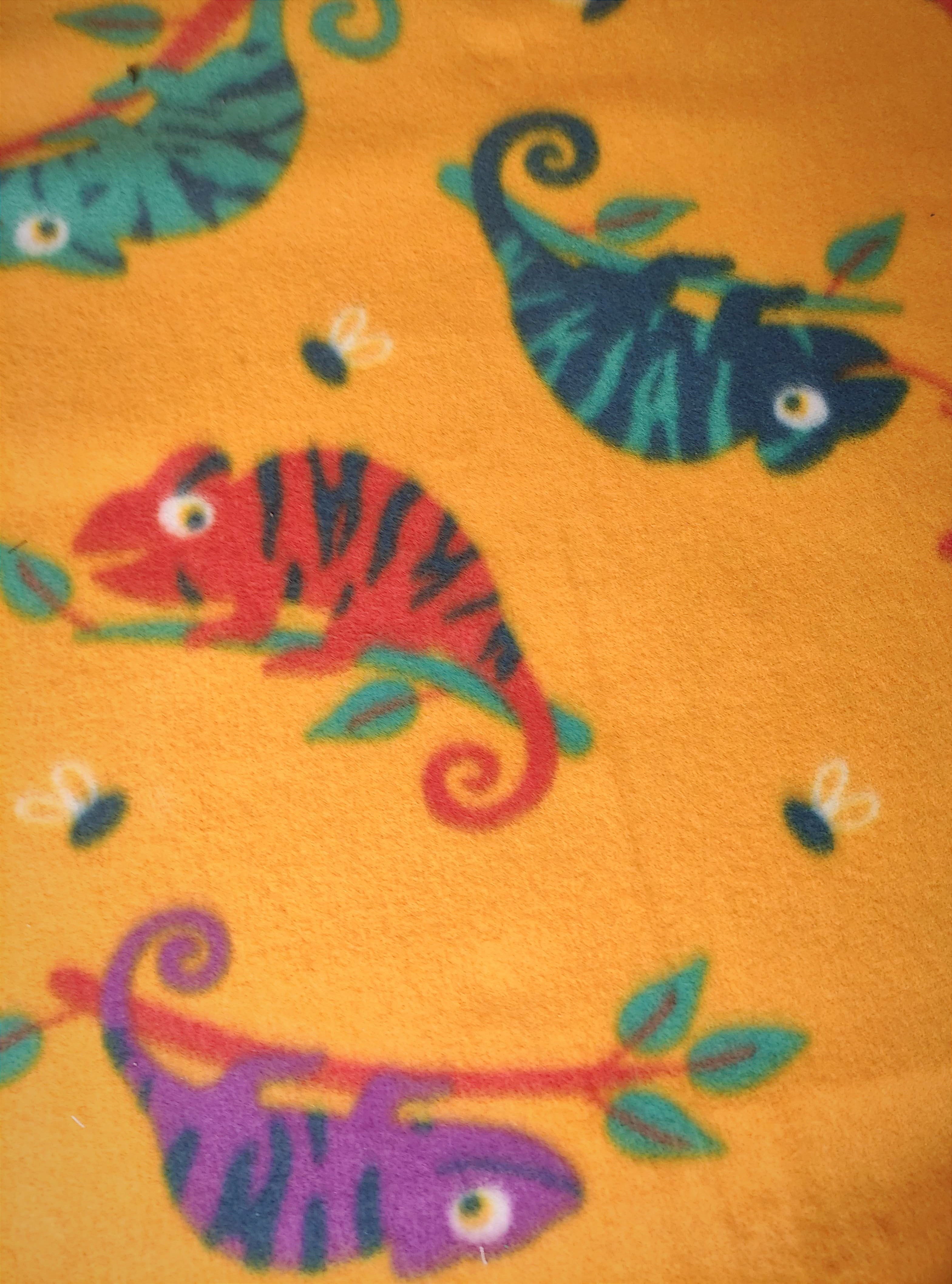 This is a soft medium weight stretchy fleece with chameleons on marigold yellow background 😻