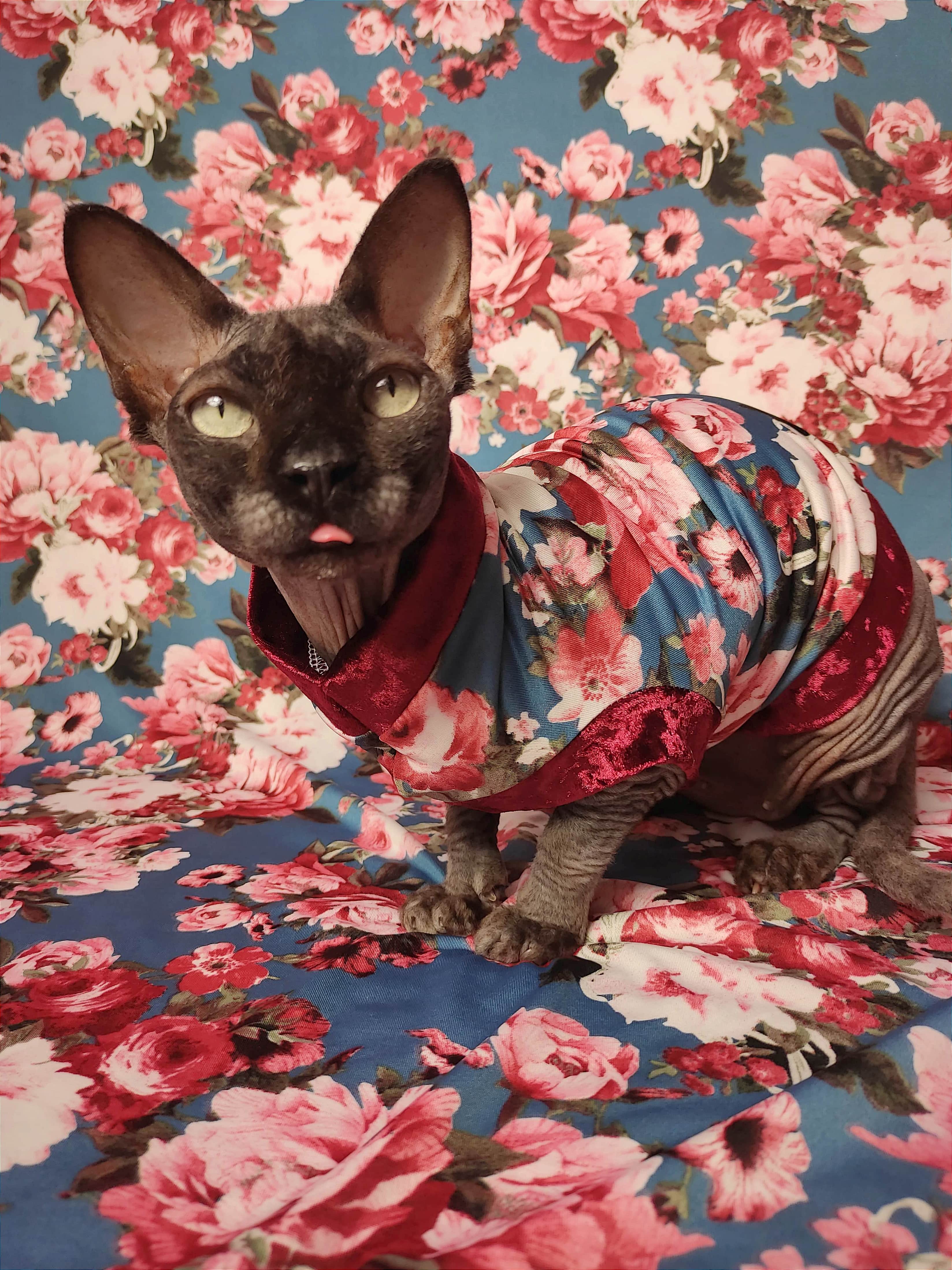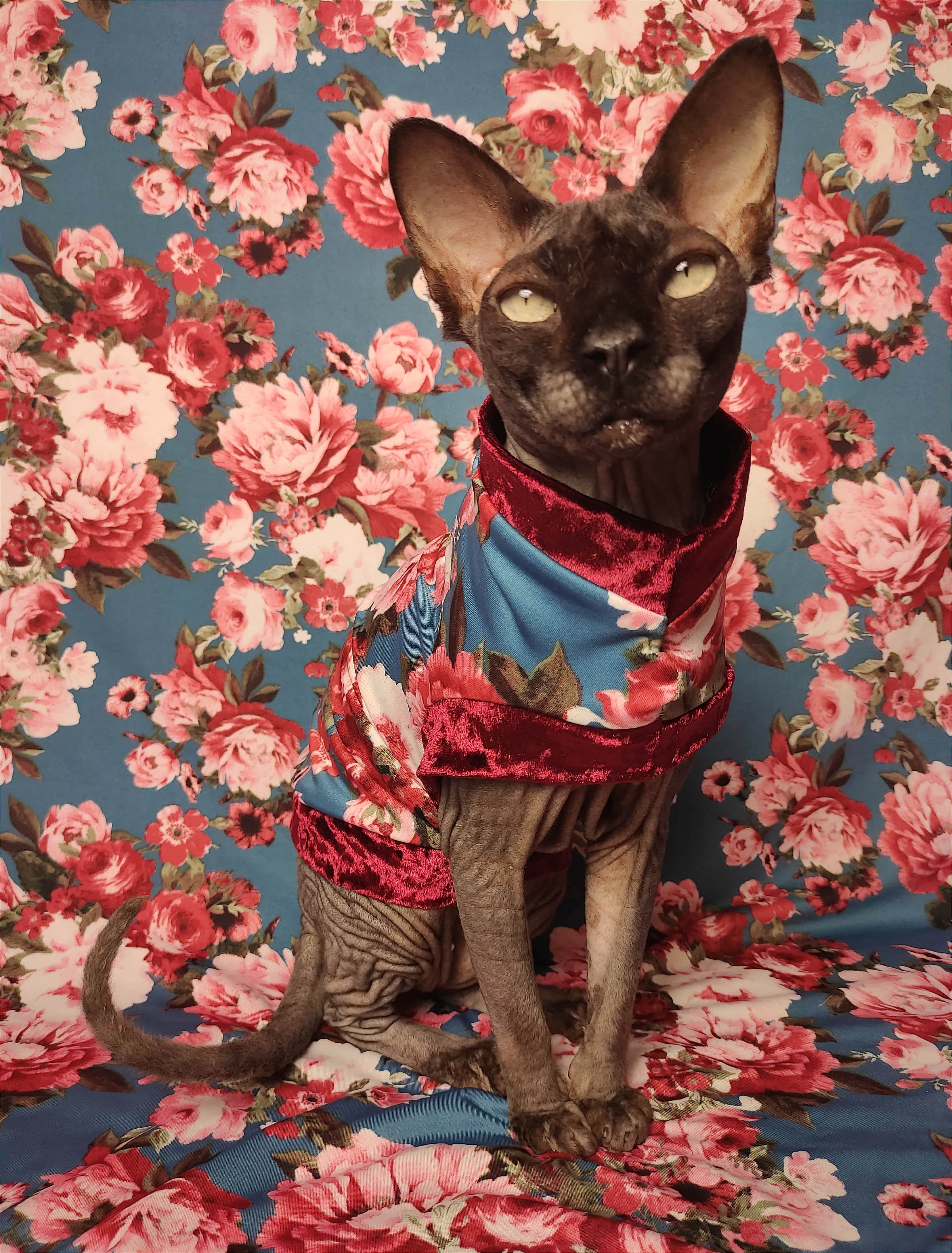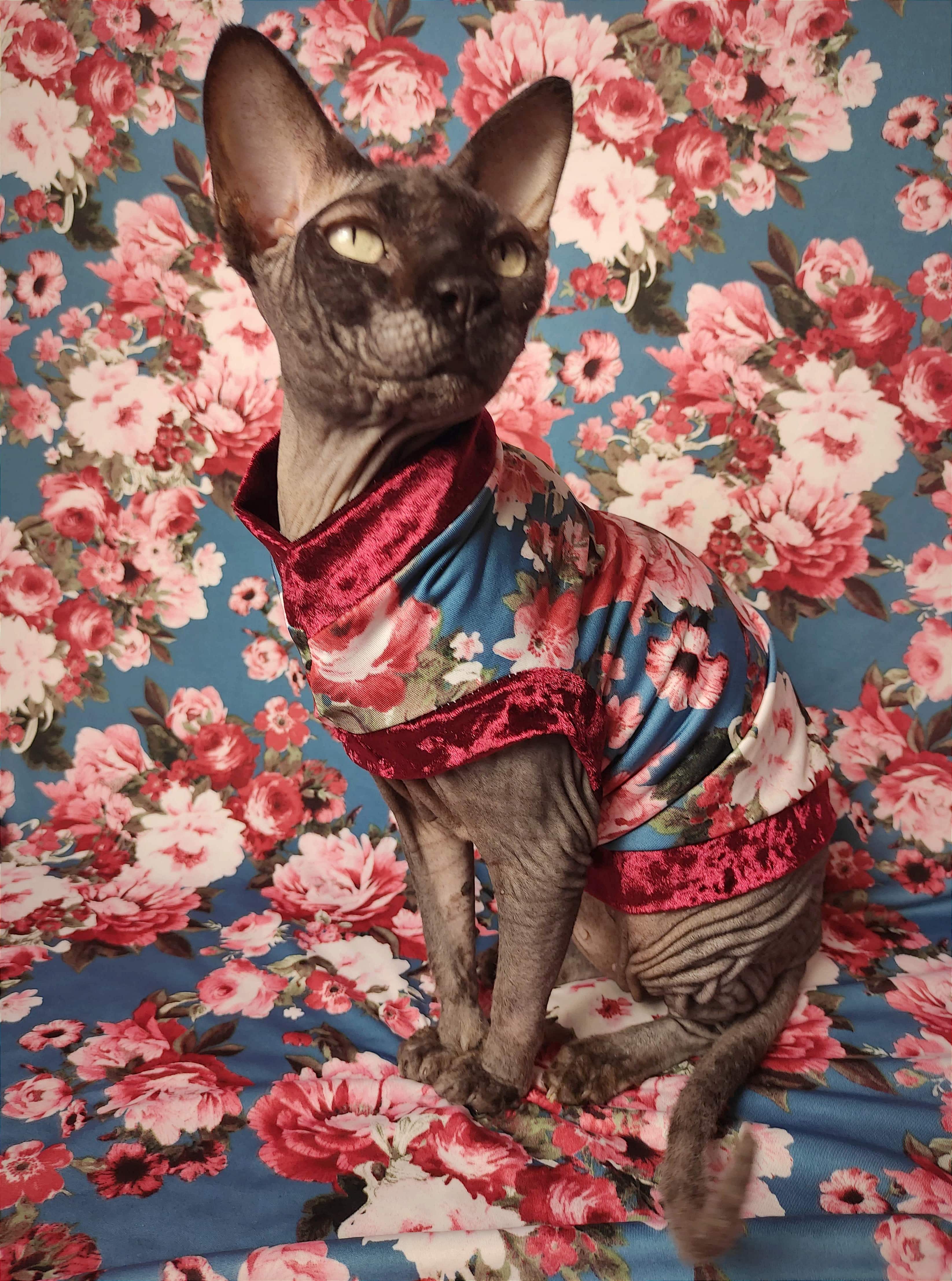This is an amazing lightweight poly blend fabric with blooming flowers on blue background, adorned with burgundy velvet. 😻 Regular Size limited to only 8, Bambino Size is limited to only 7, Ankle Biter Size is limited to 2. Lil Nipper Size is limited to 2. No more will be made when they are gone.