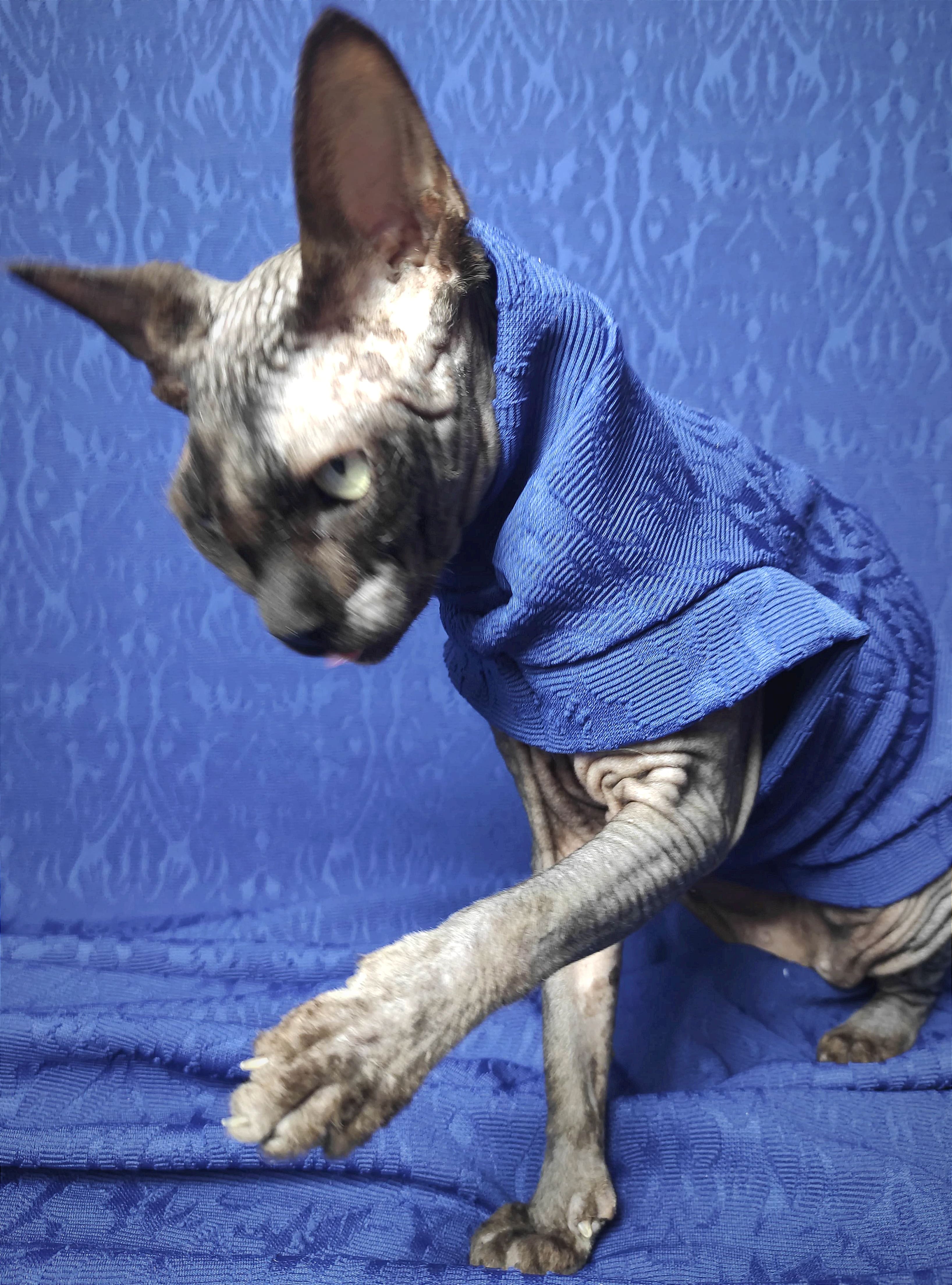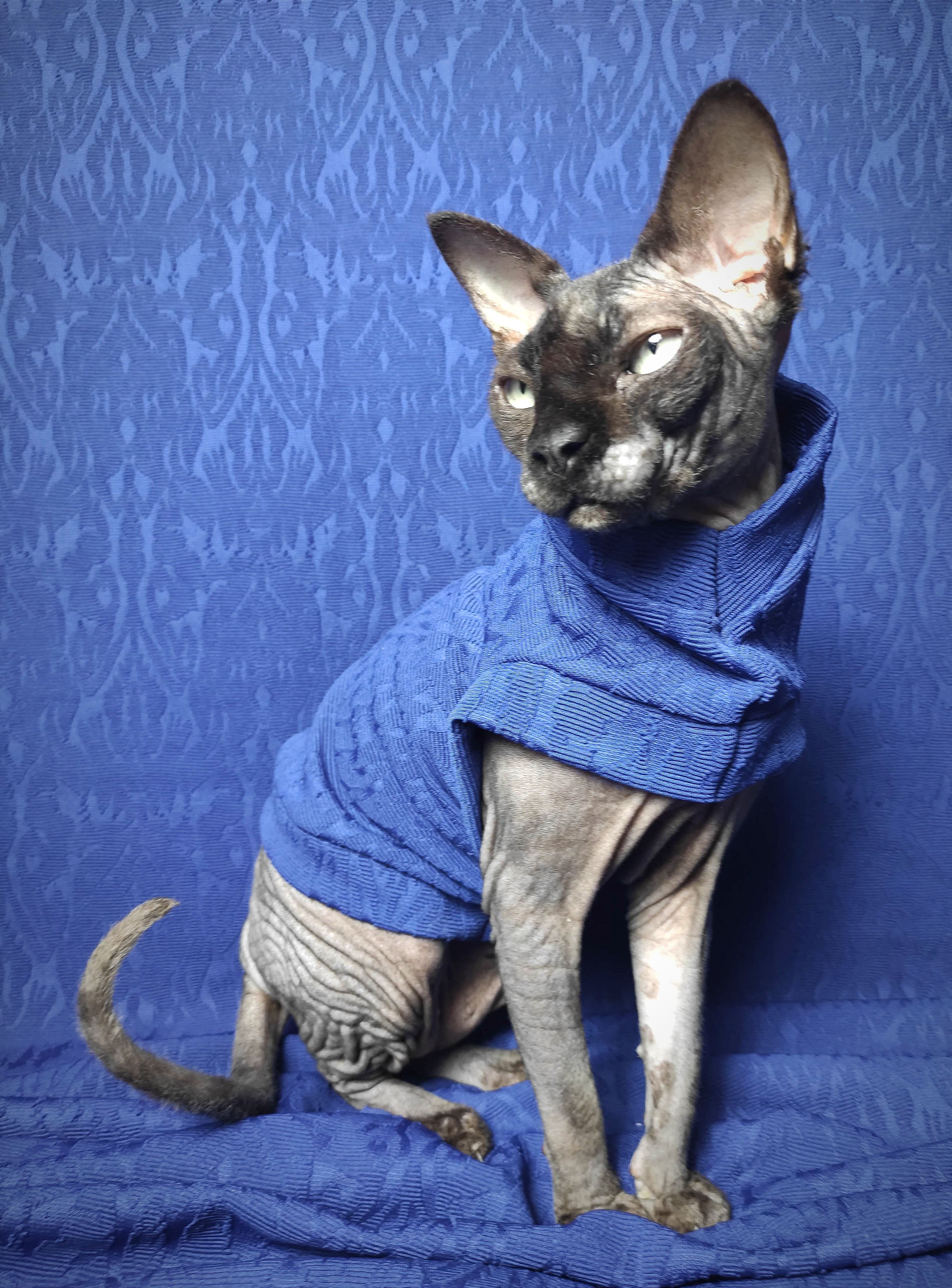 REGULAR size is for most adult hairless cats age 1 to 18. BAMBINO size fits hairless kittens age 6 months to 1 year and smaller adult cats. ANKLE BITER size fits kittens 15 weeks to 6 month olds. LIL NIPPER size fits hairless kittens age 8 weeks to 15 week olds for when they are with the breeder or for the trip home. Custom orders are welcome for larger and smaller cats - pricing is the same - $27.50