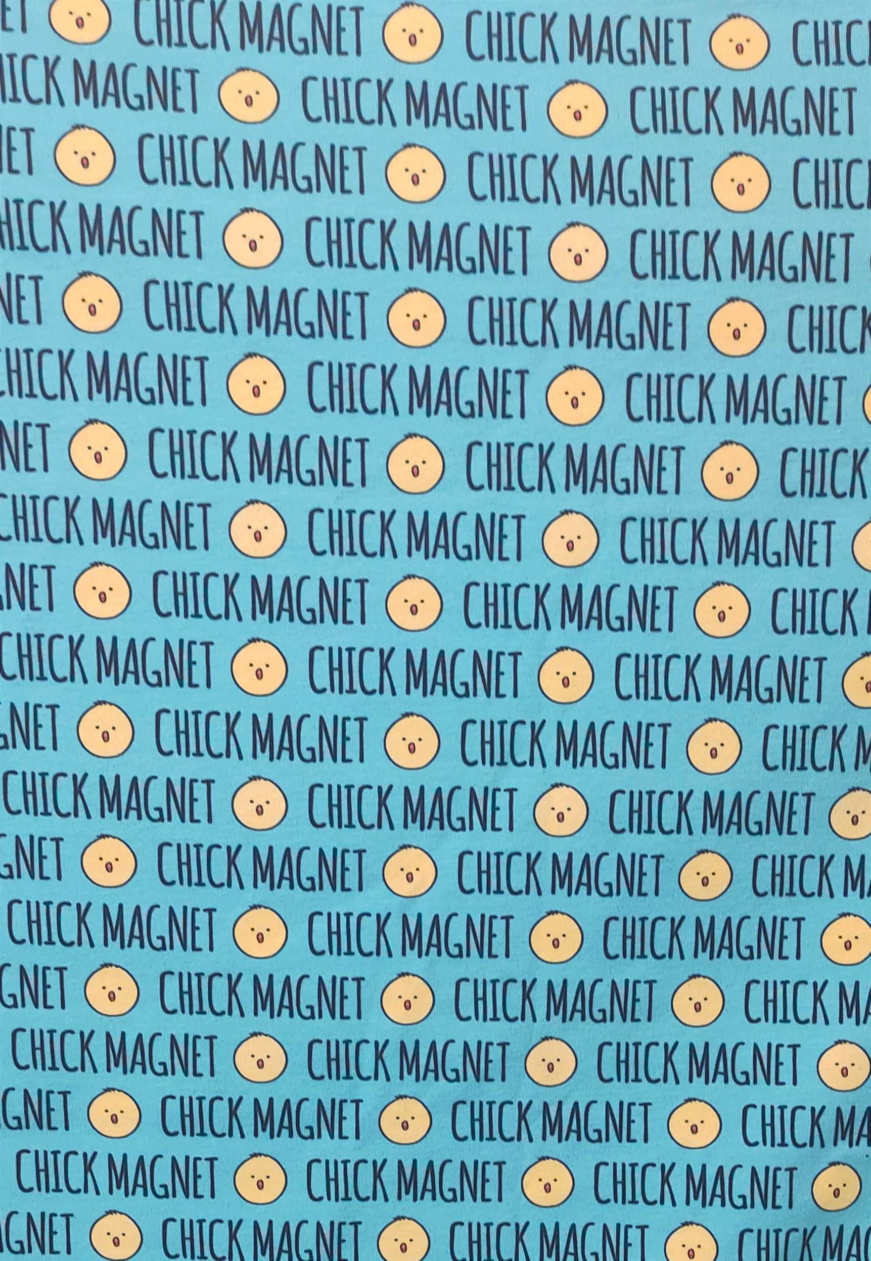 This is a lightweight stretchy cotton spandex blend fabric with Chick Magnet pattern adorned with black velvet trim.