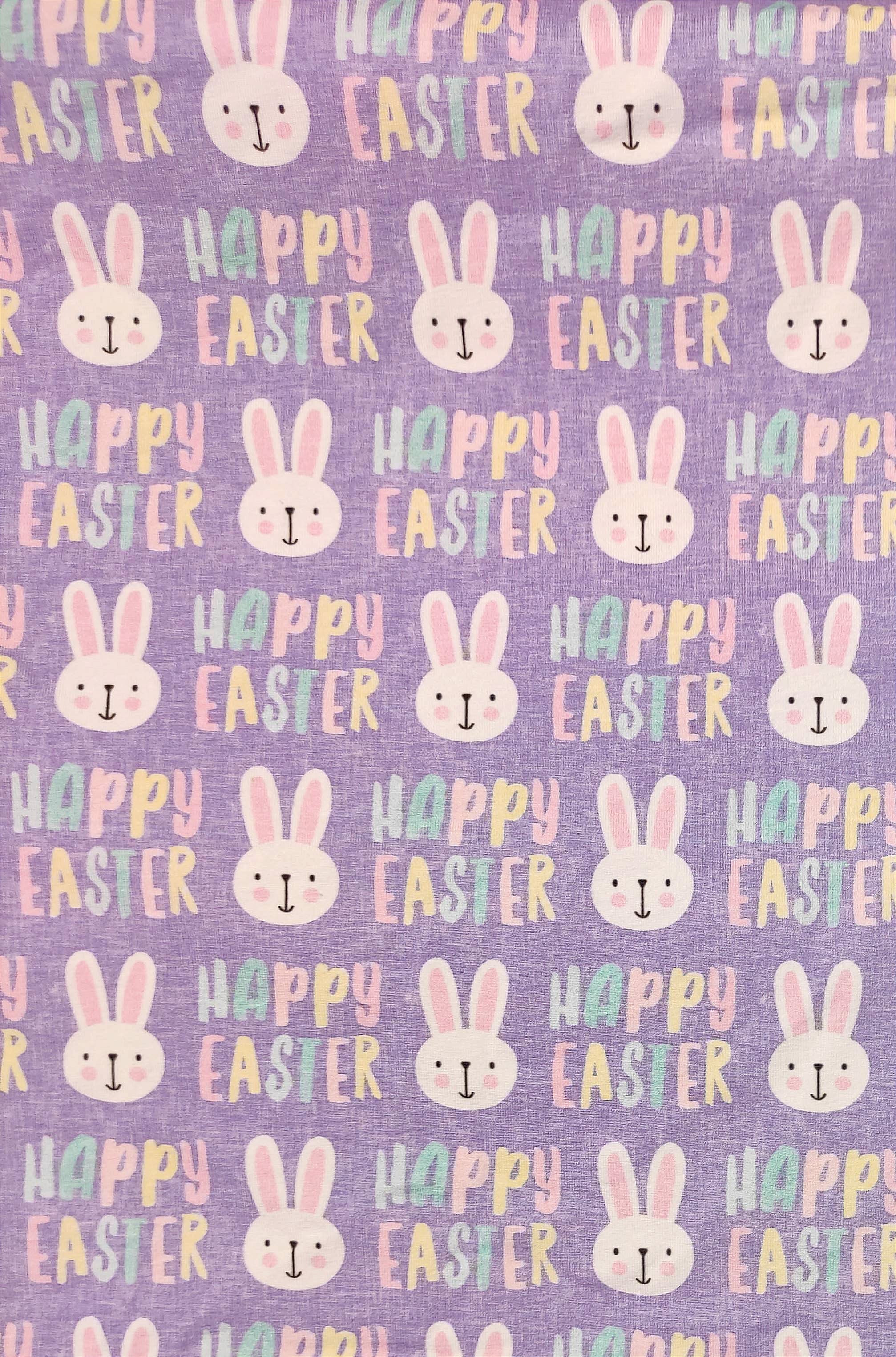 This is a lightweight stretchy cotton spandex blend fabric with Happy Easter pattern adorned with hot pink velvet trim.