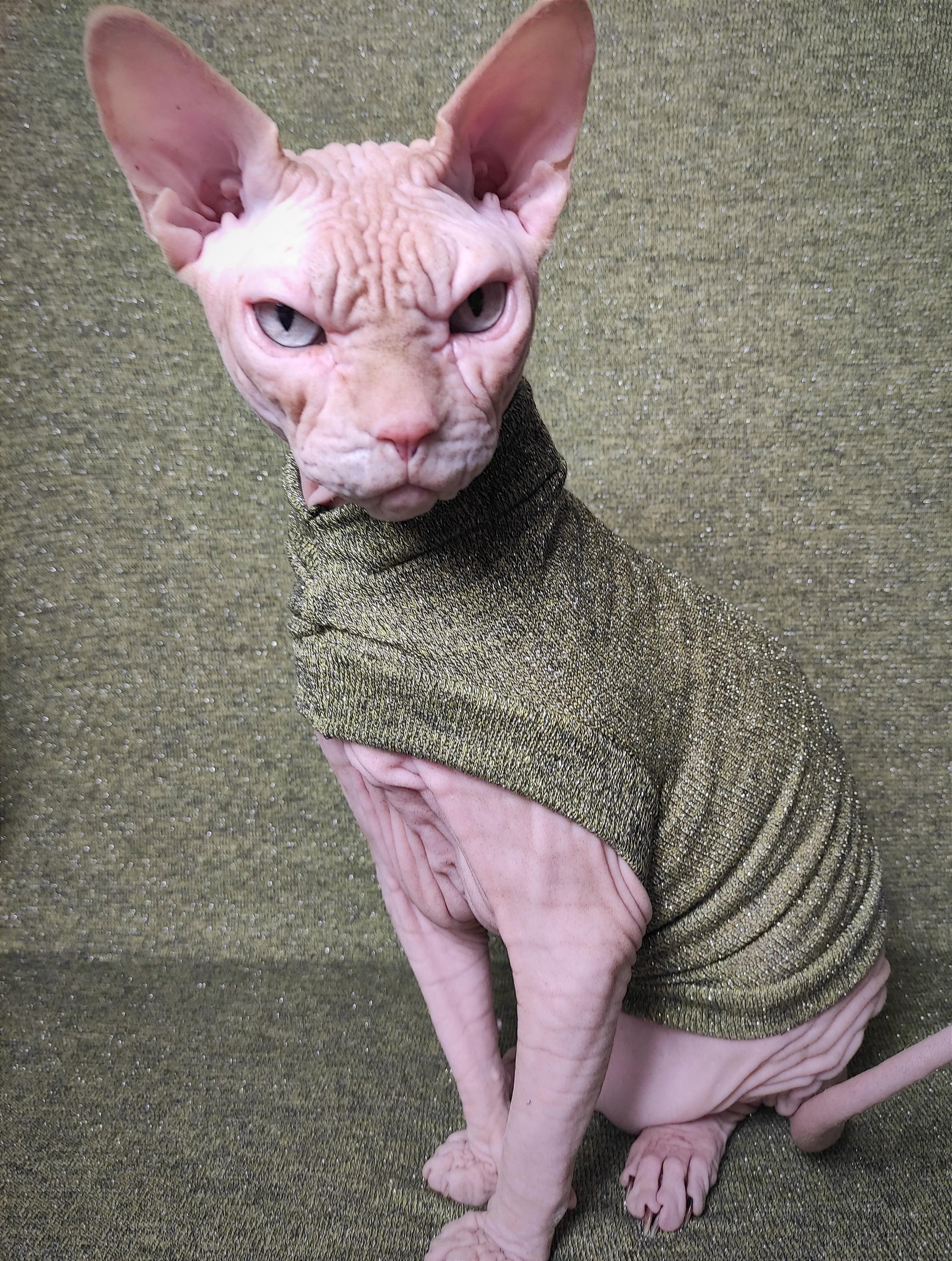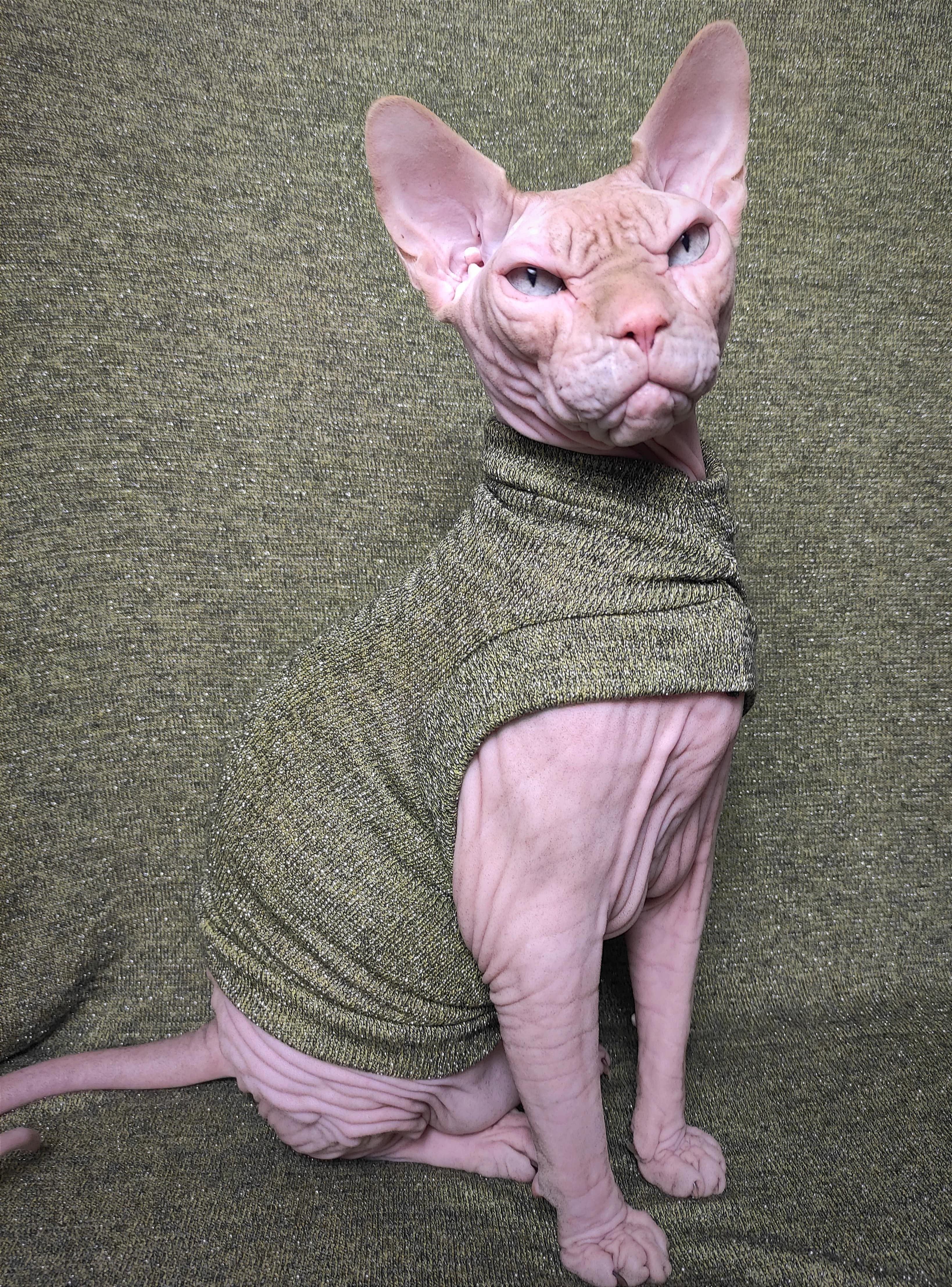 REGULAR size is for most adult hairless cats age 1 to 18. BAMBINO size fits hairless kittens age 6 months to 1 year and smaller adult cats. ANKLE BITER size fits hairless kittens 15 week to 6 month olds. LIL NIPPER size fits hairless kittens age 8 weeks to 15 week olds for when they are with the breeder or for the trip home. Custom orders are welcome for larger and smaller cats - pricing is the same - $27.50