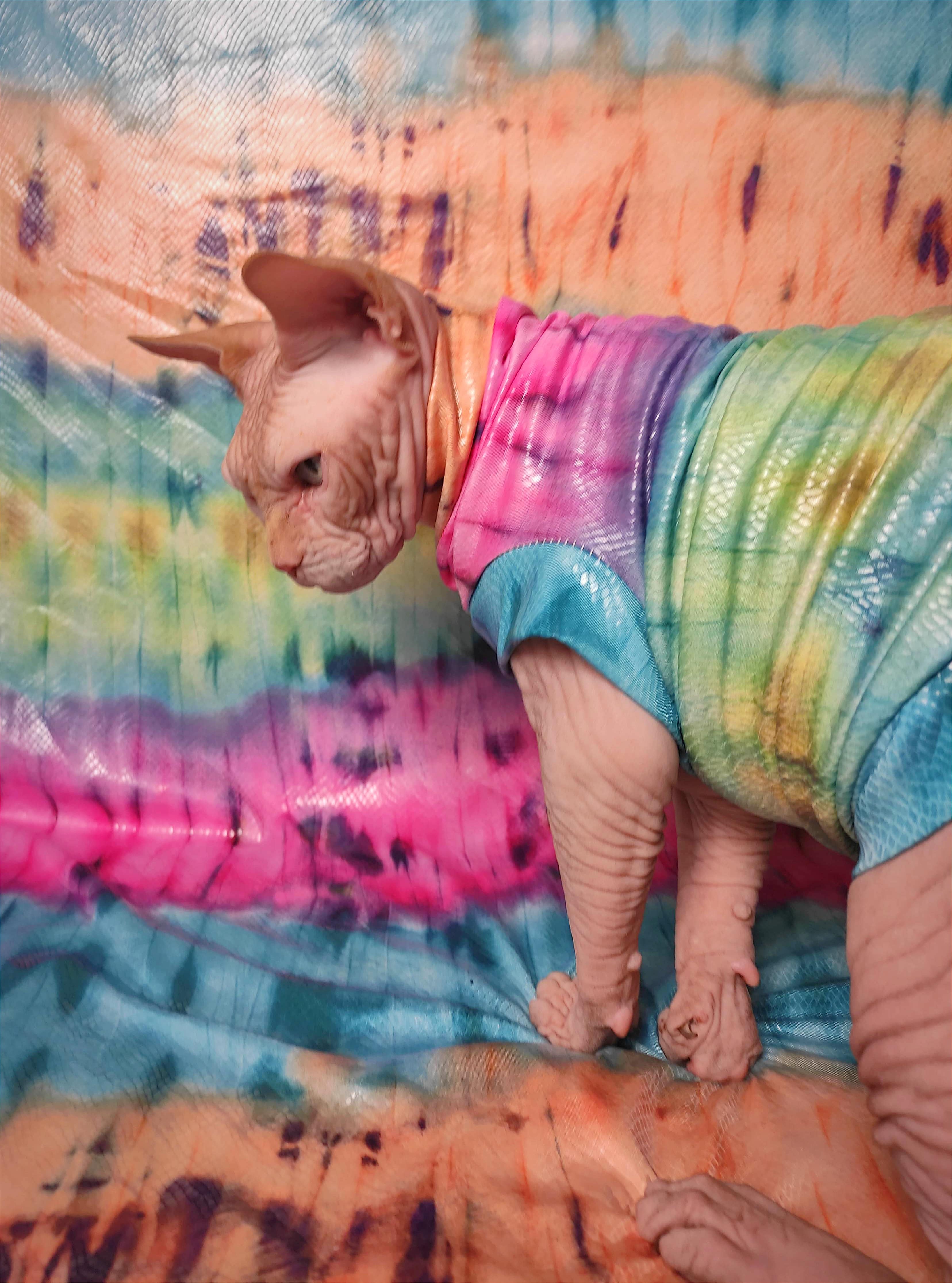 This is a stretchy poly/ spandex fabric with printed rainbow tie dye snakeskin and the scales are printed with spot gloss. 😻 Regular Size limited to only 7. Bambino Size is limited to only 8. Ankle Biter Size is limited to 2, Lil Nipper Size is limited to 2. No more will be made when they are gone.