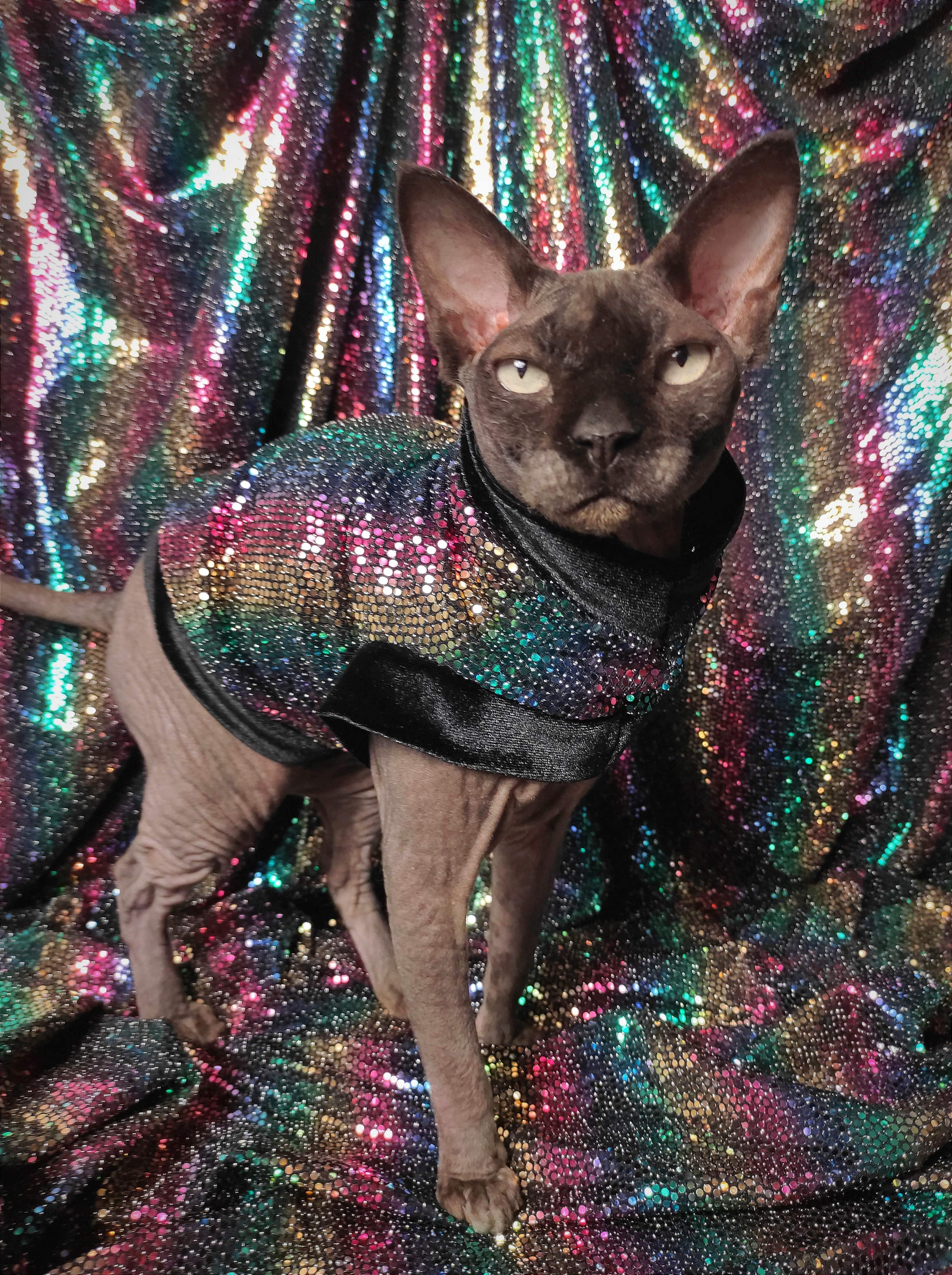 This is a stretchy mid weight polyester/ spandex black fabric with attached silver rainbow metallic circles on it, adorned with soft black velvet trim. Regular Size limited to only 8. Bambino Size limited to only 8. Ankle Biter Size limited to 2 and Lil Nipper Size limited to 2. No more will be made when they are gone.