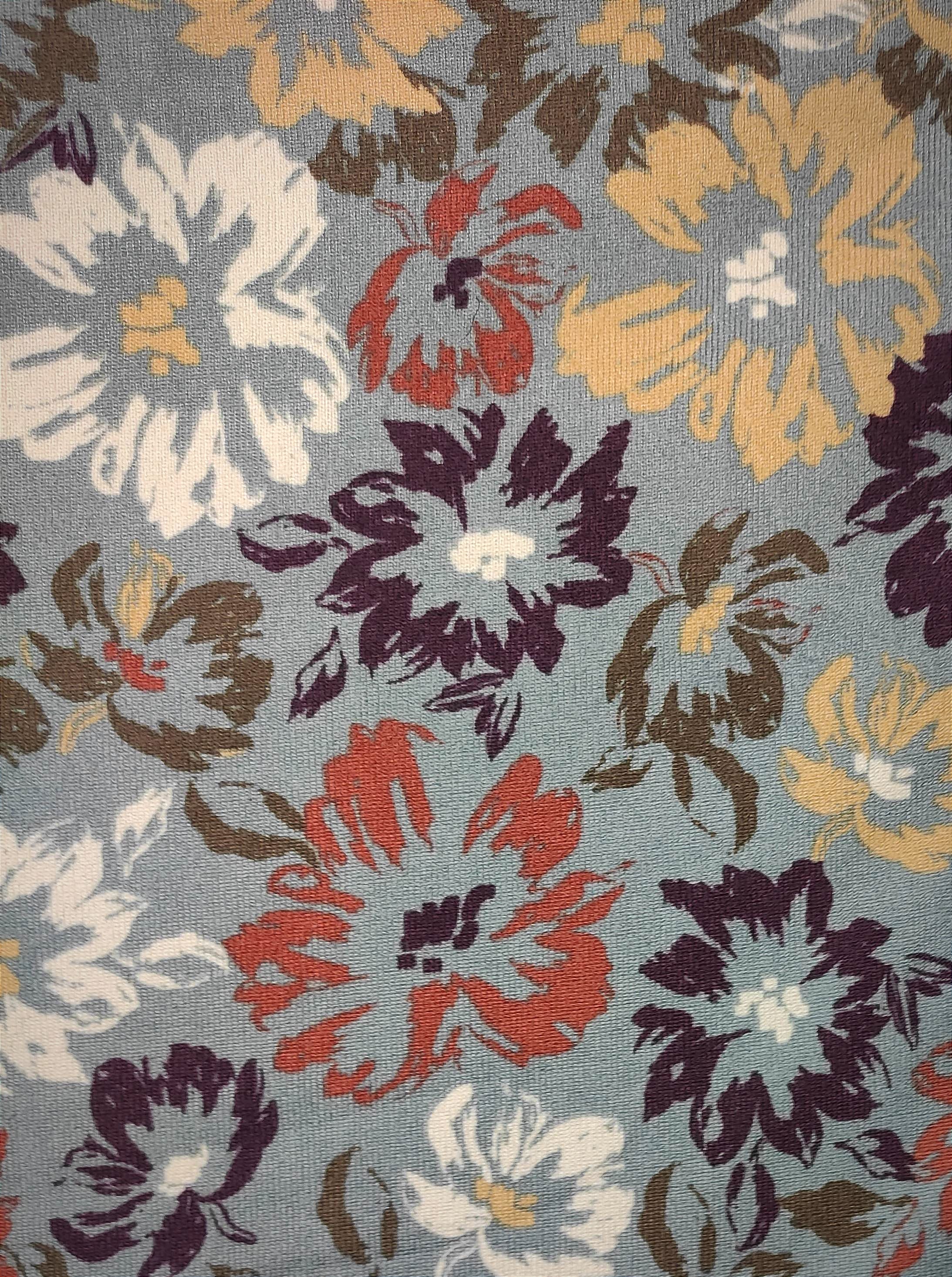 This is a stretchy mid weight woven knit fabric with painted flower design on grey background. Regular Size limited to only 8. Bambino Size limited to only 8. Ankle Biter Size limited to 2 and Lil Nipper Size limited to 2. No more will be made when they are gone.
