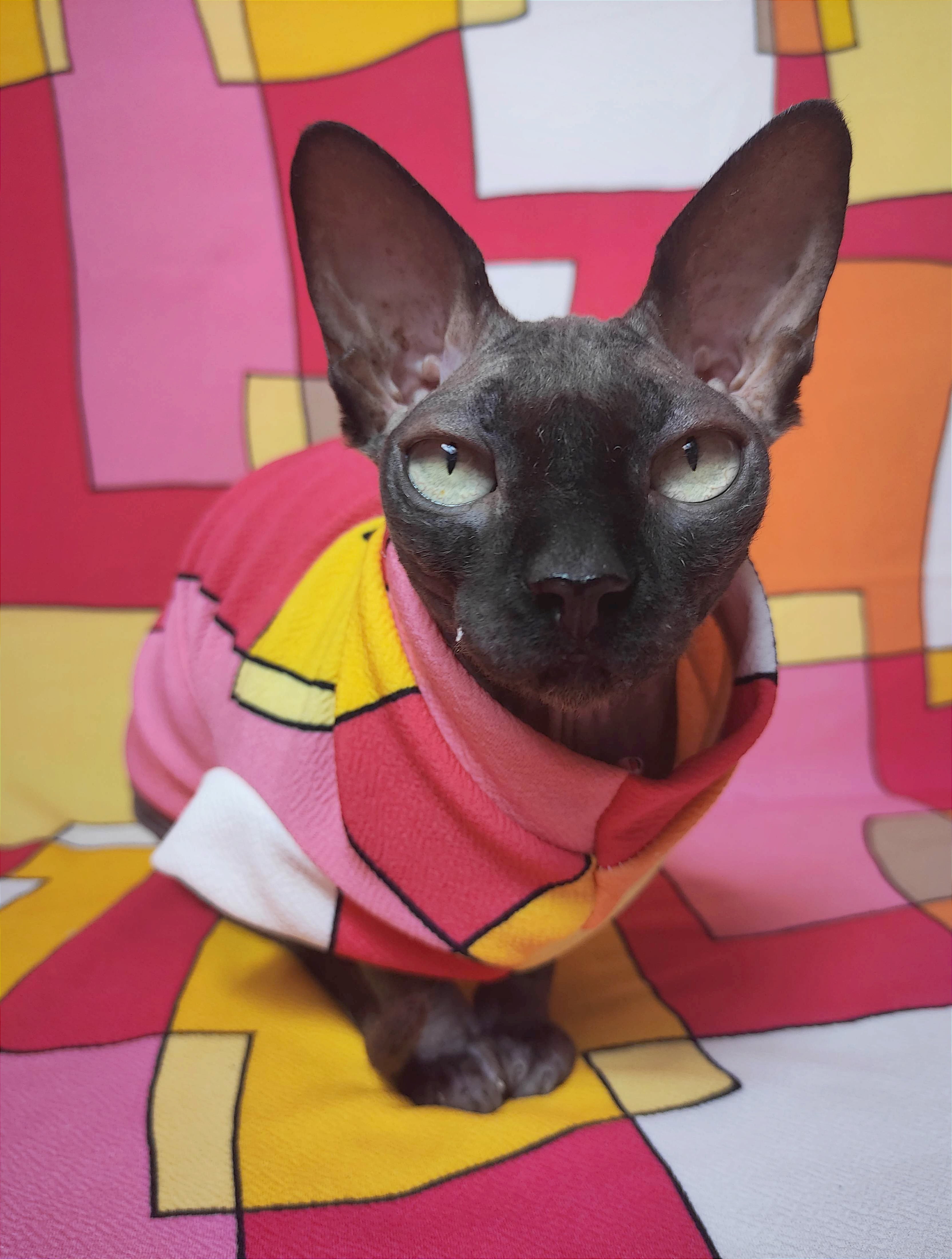 REGULAR size is for most adult hairless cats age 1 to 18. BAMBINO size fits hairless kittens age 6 months to 1 year and smaller adult cats. ANKLE BITER size fits hairless kittens 15 week to 6 month olds. LIL NIPPER size fits hairless kittens age 8 weeks to 15 week olds for when they are with the breeder or for the trip home. Custom orders are welcome for larger and smaller cats - pricing is the same - $27.50