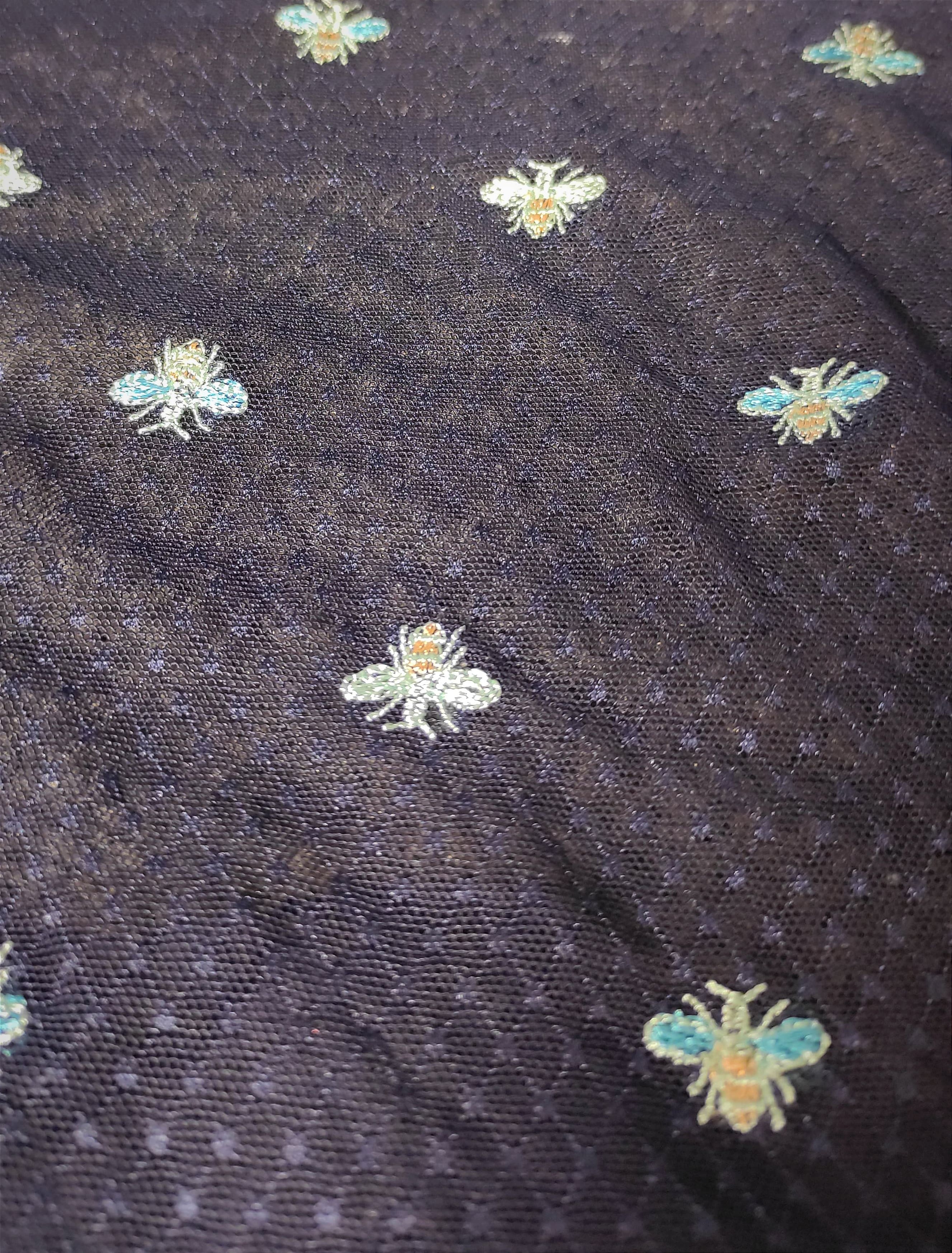 This is a stretchy see through lace fabric with embroidered bees and adorned with blue velvet trim. All will have different patterns. We will try our best to keep stock of this until Halloween.