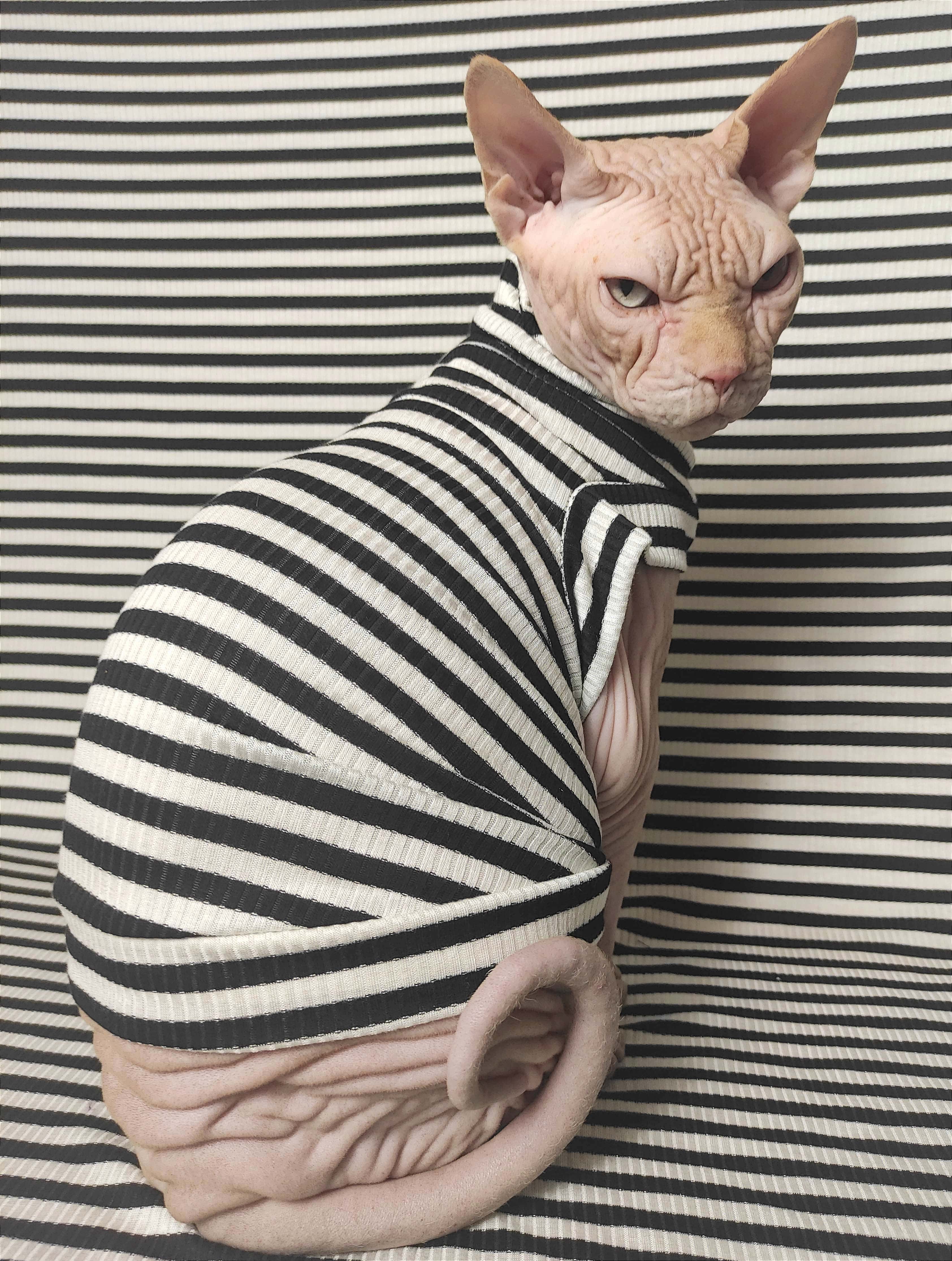 REGULAR size is for most adult hairless cats age 1 to 18. BAMBINO size fits hairless kittens age 6 months to 1 year and smaller adult cats. ANKLE BITER size fits kittens 15 weeks to 6 month olds. LIL NIPPER size fits hairless kittens age 8 weeks to 15 week olds for when they are with the breeder or for the trip home. Custom orders are welcome for larger and smaller cats - pricing is the same - $27.50